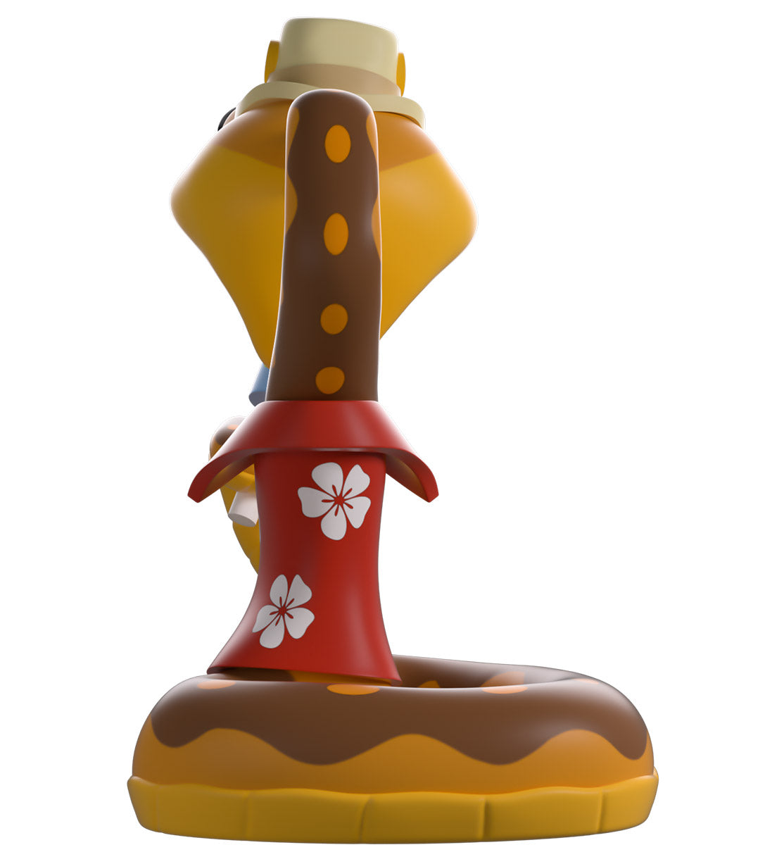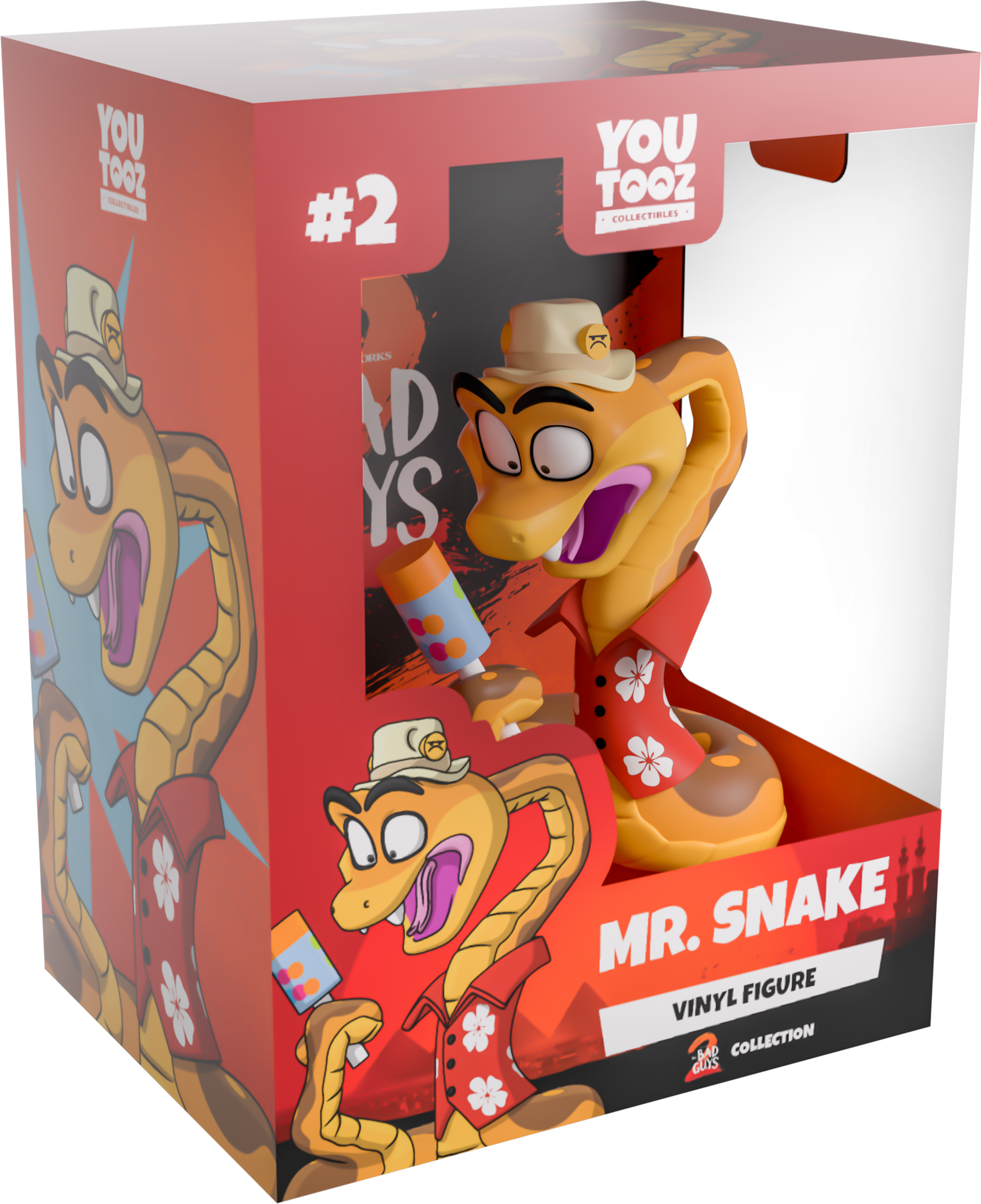 This safe needs crackin' but give him a few minutes, Mr. Snake wants to finish his push pop first! Slithering in at 4.2 inches tall to make his Youtooz debut, he looks down excitedly at the push pop held in the tip of his tail and is dressed in a red shirt with a white floral print and a khaki bucket hat. The exterior of his packaging has been illustrated to show the inside of a frosty freezer, while the interior is a textured orange with the Bad Guys 2 logo. The protective sleeve features a red sky over the city in the distance as his figure can be seen through the large clear window at its front. This collectible ships in a matte, embossed, protective outer sleeve and a custom-sized plastic protector for maximum protection during shipping.