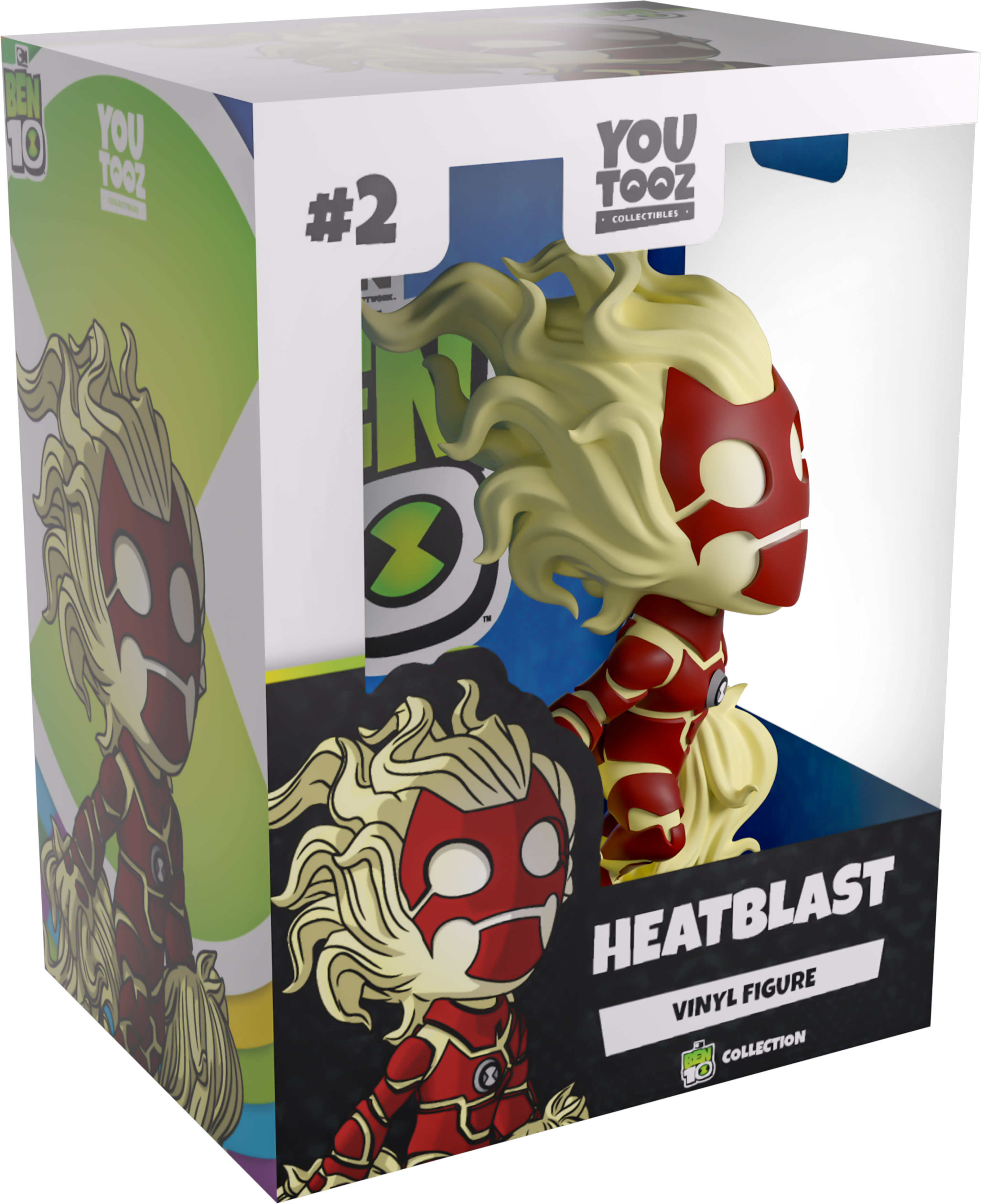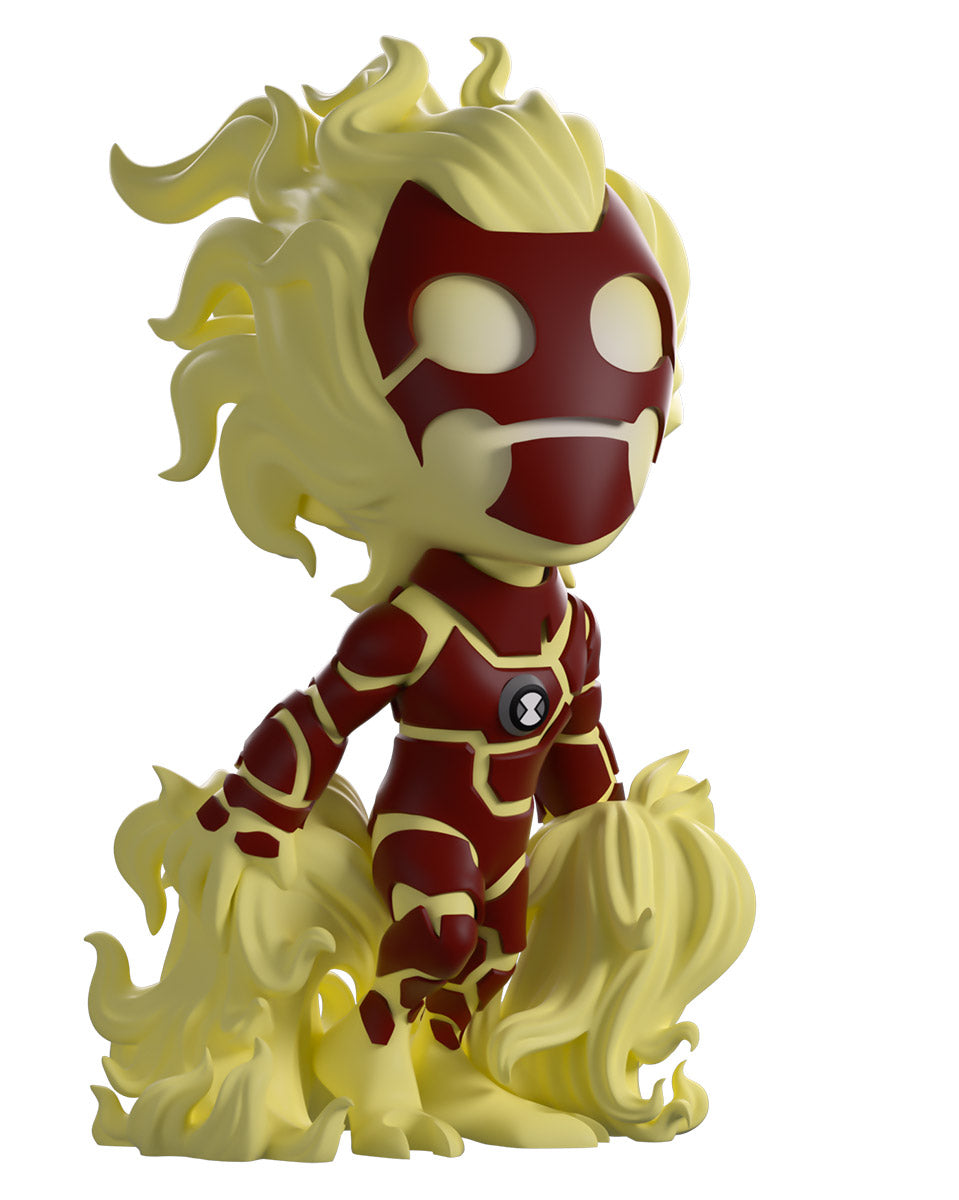Heatblast has arrived at Youtooz to show us what true firepower looks like! At 4.8 inches tall with swirling pale yellow plasma flames curling out from the back of their head and pouring from his palms to dance around his feet, they look upwards with dark red volcanic rock covering their face that matches the plating running across their torso, arms and legs. The exterior of their packaging sees the Omnitrix letting out a wave of green power. The interior is then covered in a deep mottled blue, while the white protective sleeve has a thick black bar running along the bottom as his figure can be seen through the large, clear window at its front. This collectible ships in a matte, embossed, protective outer sleeve and a custom-sized plastic protector for maximum protection during shipping.