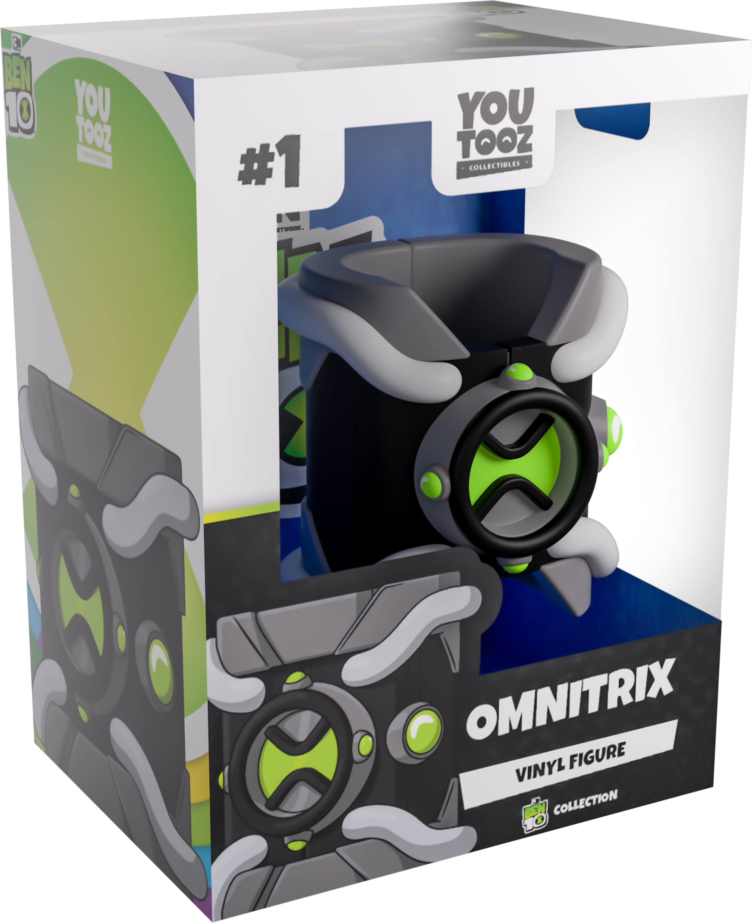 Are you ready to harness the power of intergalactic genetic data and transform with your very own Omnitrix?! At 3.8 inches tall with light grey pipes running around the base of its dark grey band, the black center has a pair of green buttons on their side of the vibrant black and green face that’s ready to get slammed and initiate a transformation! The exterior of its packaging looks down at the Omnitrix on Ben’s wrist. The interior is then covered in a deep mottled blue, while the white protective sleeve has a thick black bar running along the bottom as his figure can be seen through the large, clear window at its front. This collectible ships in a matte, embossed, protective outer sleeve and a custom-sized plastic protector for maximum protection during shipping.