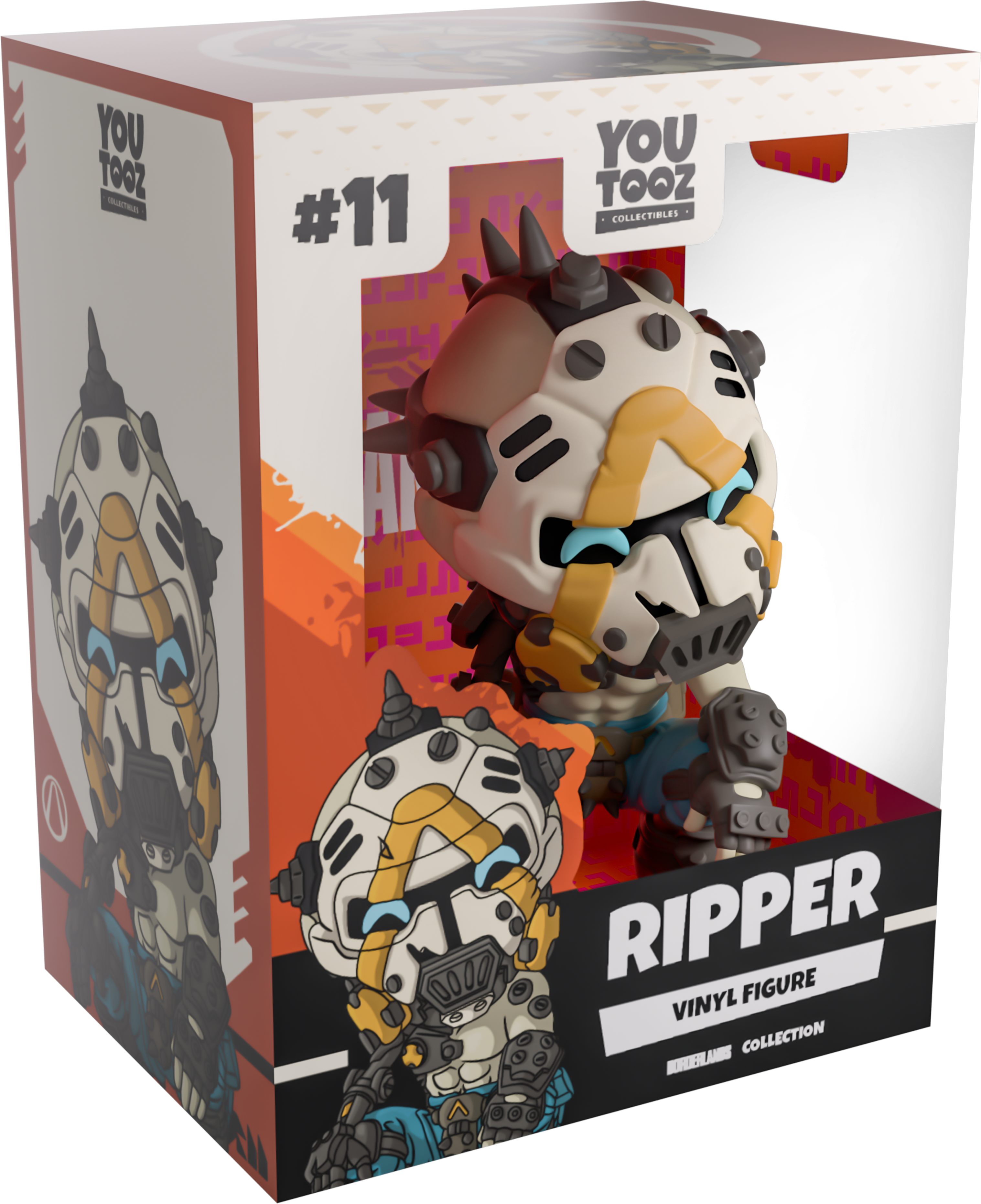 Wait, you thought getting to the Vault would be easy? Well, this Ripper has other ideas! Crouching down at 4.2 inches tall with hands resting on his knees as bright blue eyes look out from the dark slit in his white mask, a thick yellow line runs from the two respirators on either side of his mouth in a triangle over his face as spikes cover bands wrapping around his head. With a grey cybernetic arm reaching out from a plated shoulder that covers the right side of his bare chest, he wears blue pants covered in pouches along with thick yellow-capped boots. The exterior of his beige packaging has deep orange lines running through it diagonally, while the interior is covered in strings of blocky pink code. The protective sleeve then continues the same earthy oranges through its middle as his figure can be seen through the large clear window at the packaging’s front. This collectible ships in a matte, embossed, protective outer sleeve and a custom-sized plastic protector for maximum protection during shipping.
