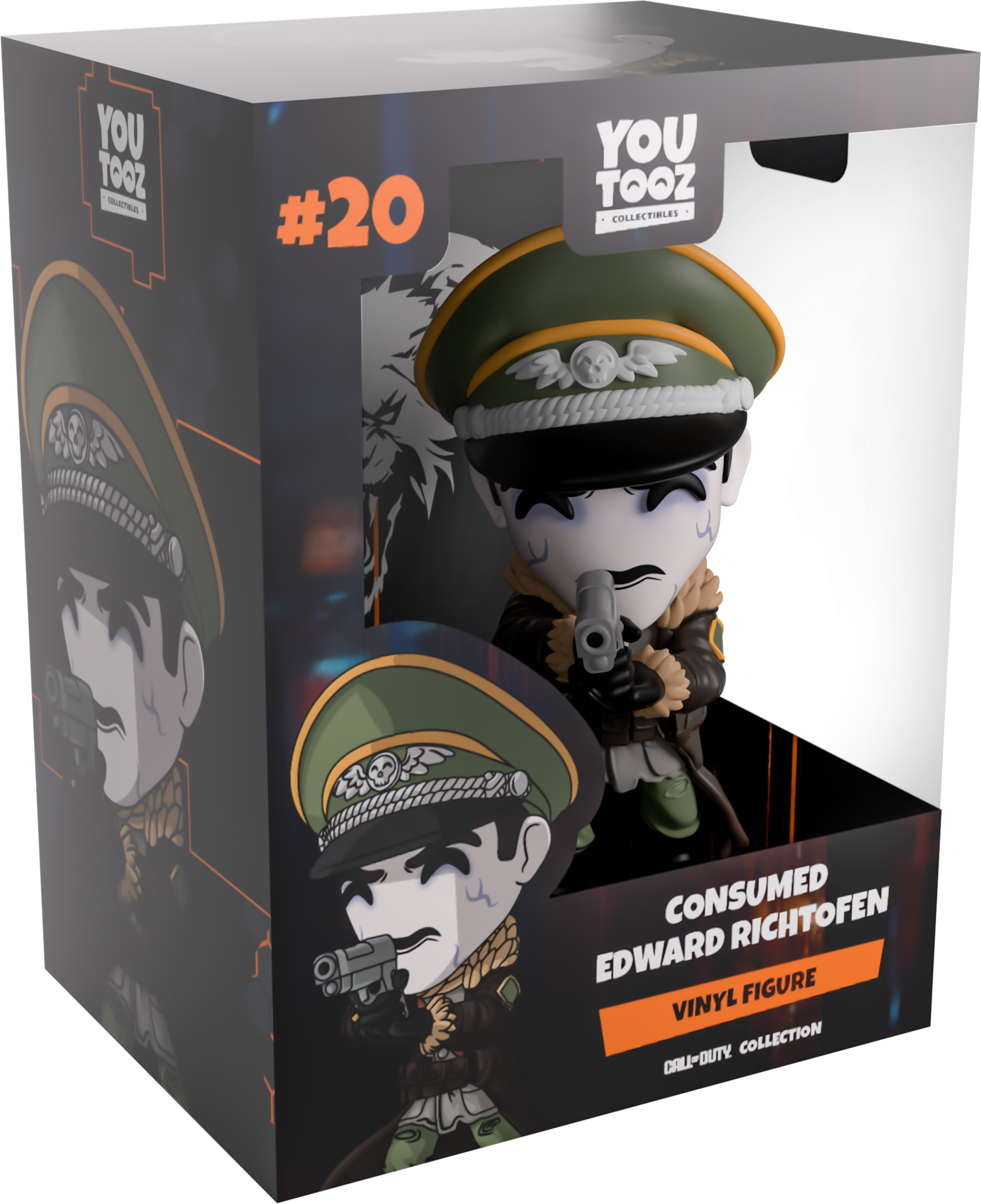 Edward Richtofen has returned to Youtooz! But he’s looking a little different… Is he ok?! Standing at 4.2 inches tall and staring down the barrel of the grey pistol held to his front in gloved hands, concentration fills his pale vein-covered face as dark eyebrows furrow to match the thick moustache over his frowning mouth. Wearing a green officers cap with a grey cord over its black brim, his long black trench coat is tattered at the end as brown fur lines the neck and cuffs, and green pants tuck into his black boots. The exterior of his packaging is covered in a grey hexagonal pattern with bright orange highlights, while the interior is filled with a warping dark camouflage. The hexagons then continue onto the protective sleeve that has grainy vertical blue and orange stripes, as his figure can be seen through the large, clear window at the packaging’s front. This collectible ships in a matte, embossed, protective outer sleeve and a custom-sized plastic protector for maximum protection during shipping.