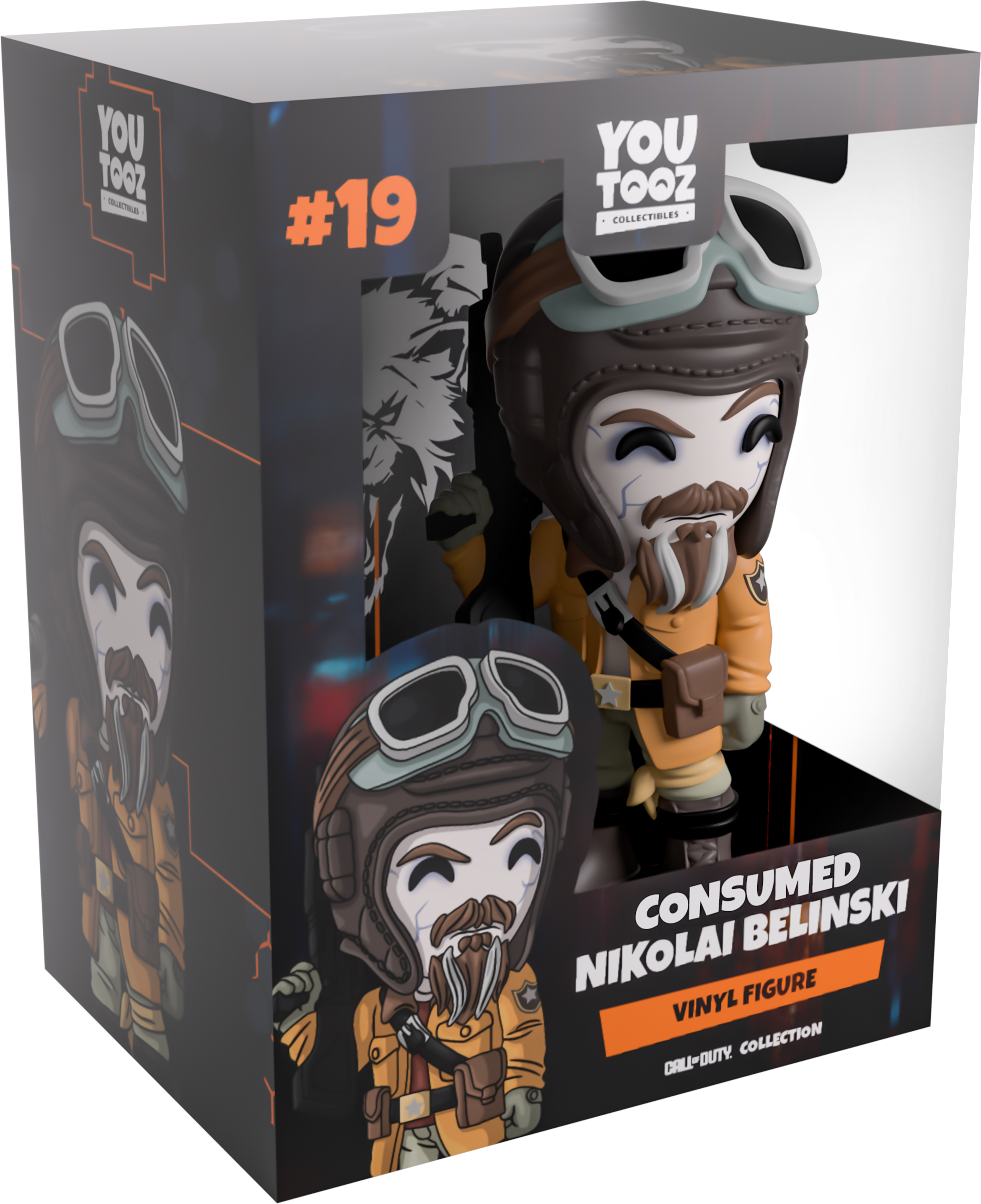 Stalin may not be able to stare Nikolai in the eye, but you sure can with his Youtooz debut! Standing at 4.8 inches tall and holding a rifle over his right shoulder in a gloved hand, an eyebrow raises quizzically over his sunken eyes as a long grey and brown goatee falls from his pale chin. With a grey pilot hat that has a pair of goggles strapped to its front covering his head, he wears a hooded brown jacket over a maroon shirt as pouches line the belt wrapping around his waist and light green pants tuck into black boots. The exterior of his packaging is covered in a grey hexagonal pattern with bright orange highlights, while the interior is filled with a warping dark camouflage. The hexagons then continue onto the protective sleeve that has grainy vertical blue and orange stripes, as his figure can be seen through the large, clear window at the packaging’s front. This collectible ships in a matte, embossed, protective outer sleeve and a custom-sized plastic protector for maximum protection during shipping