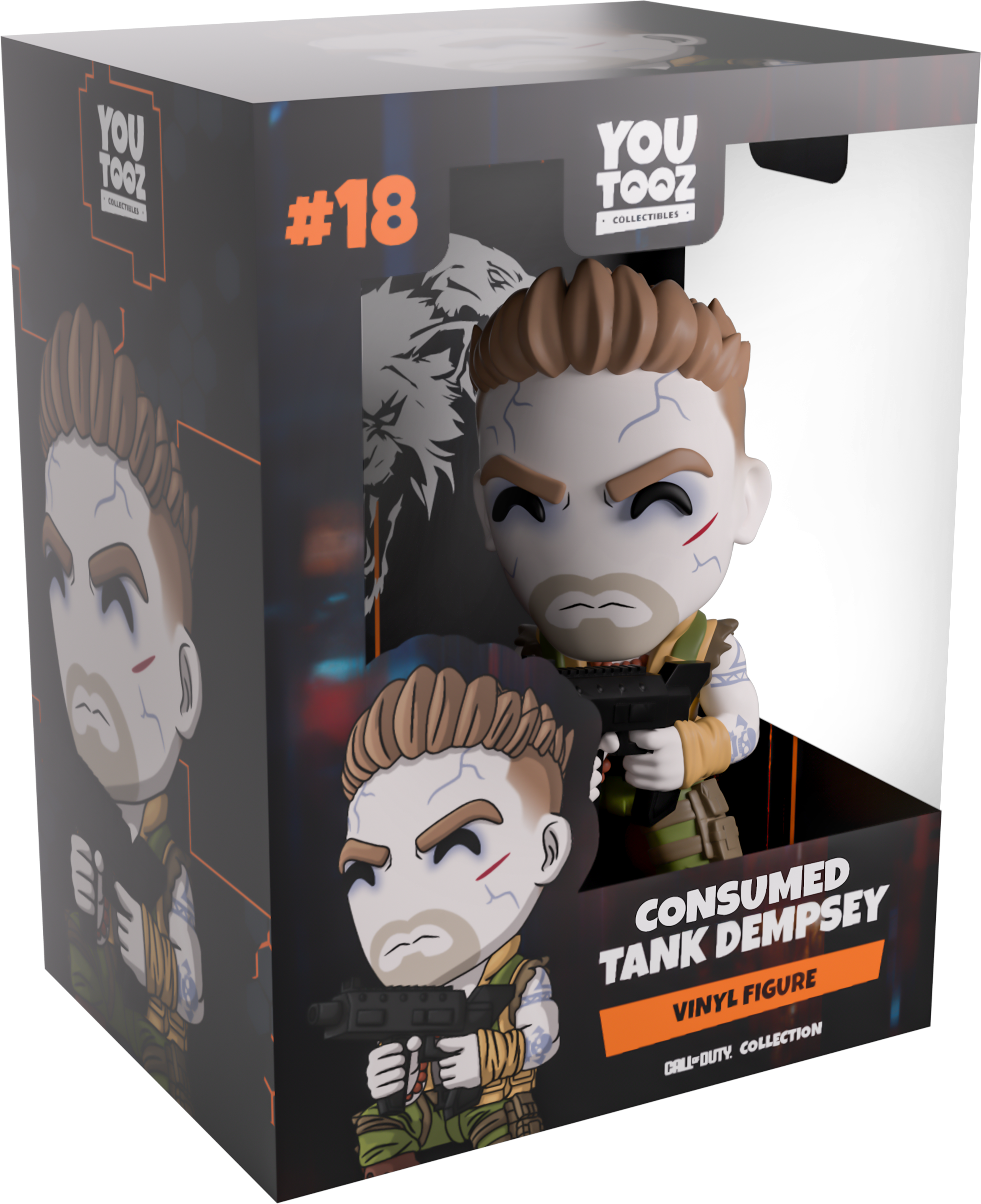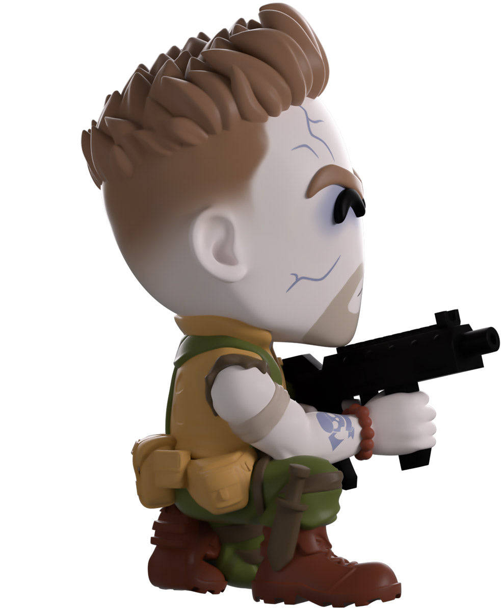 Tank’s got something to say about this whole Aether business, and he’s arrived at Youtooz to show us how it’s done! Crouching at 4.1 inches tall and gripping a machine gun in both hands as thick eyebrows furrow over shadowed eyes, a thin frown rests within his light goatee as blue veins cover his pale face, and short hair flicks up from the top of his head. Wearing a khaki vest over a black shirt with torn off sleeves that reveal his tattooed arms, pouches line the belt around his waist as army green pants lead down to thick brown boots. The exterior of his packaging is covered in a grey hexagonal pattern with bright orange highlights, while the interior is filled with a warping dark camouflage. The hexagons then continue onto the protective sleeve that has grainy vertical blue and orange stripes, as his figure can be seen through the large, clear window at the packaging’s front. This collectible ships in a matte, embossed, protective outer sleeve and a custom-sized plastic protector for maximum protection during shipping