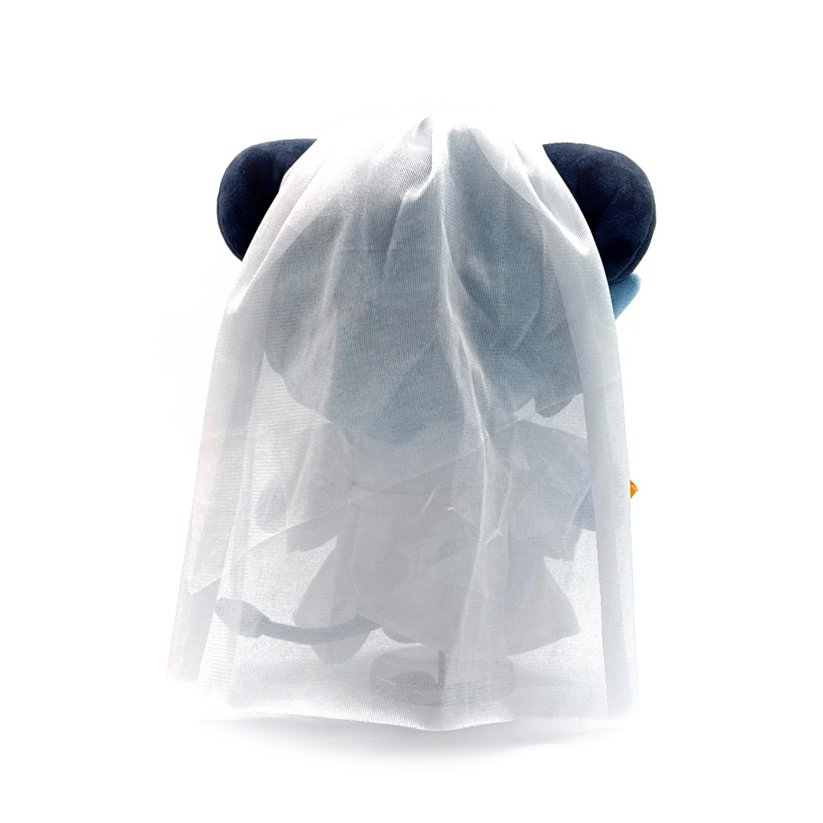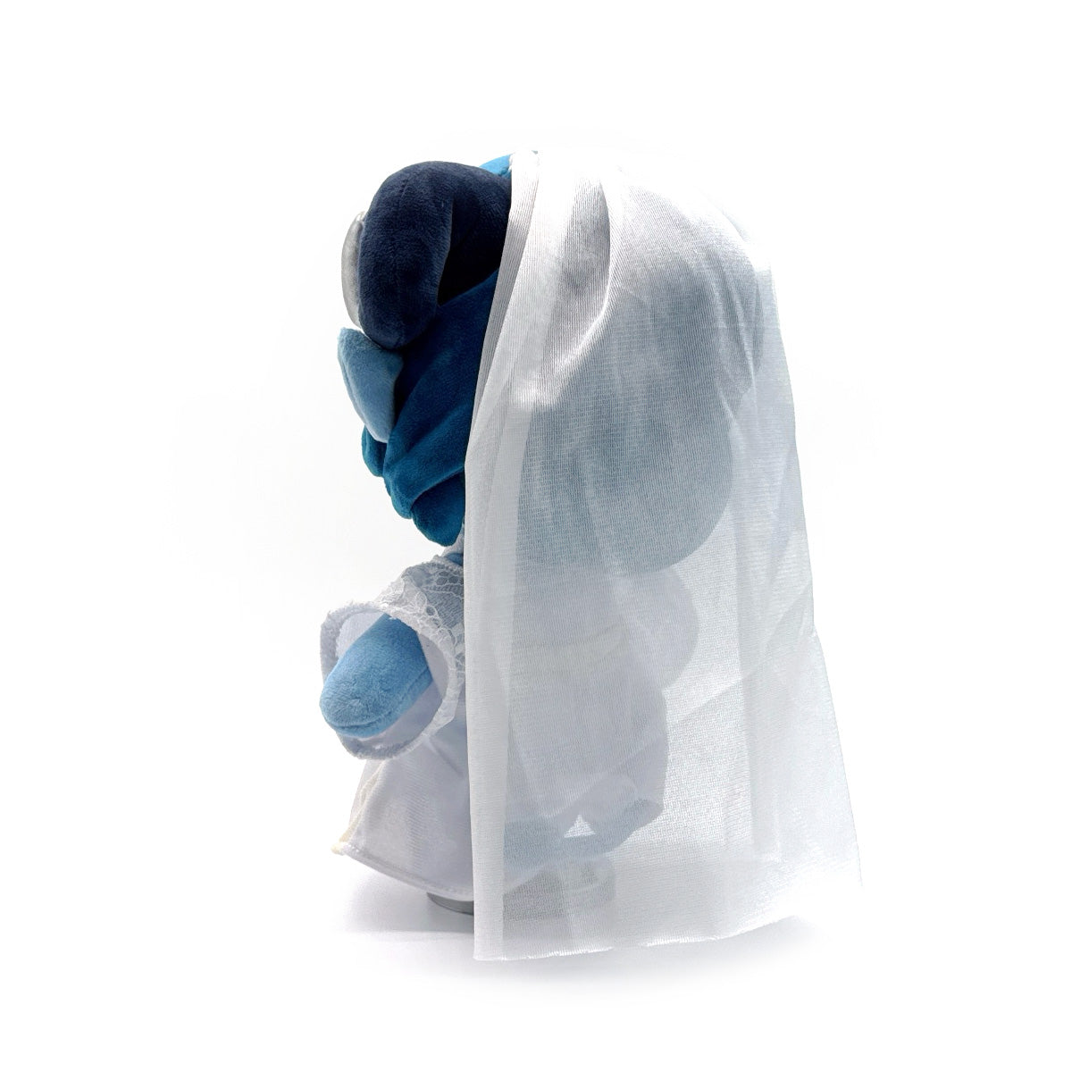 Jester is back at Youtooz, and she said yes to the dress! Making her bridal debut, this new fabulous plush is 9 inches tall and designed with Jester standing in a white gown that has soft cream accents and ornately patterned sleeves that hang from her outstretched arms. With a large golden ring in her right hand and a joyous smile crossing her face that's framed by dark blue hair, a pair of silver tipped horns poke out from the top of her head above the long white veil falling down her back. This plush is packed to the seams with 100% PP cotton and is made of minky, lace and tricot materials with accents of shiny silver, perfect for cuddling or walking down the aisle with!