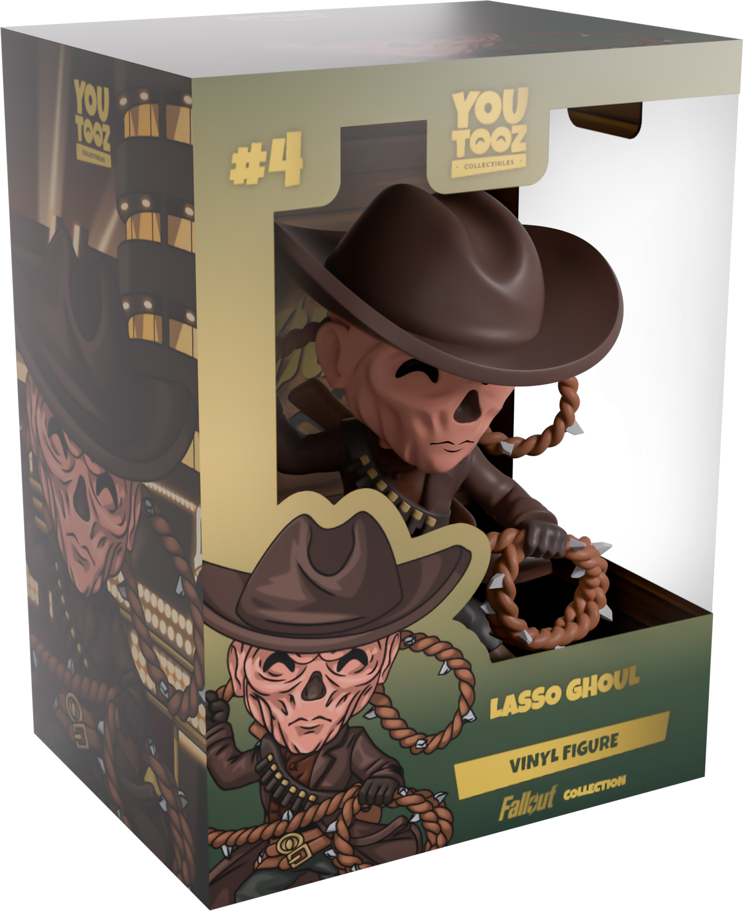 You can run, but there’s no way you’re gonna escape! The Ghoul has tracked Youtooz across the wasteland for his new figure! Standing at 4.2 inches tall and spinning a dark brown lasso that’s covered in shards of glass over his shoulder as he holds onto its end in a looped bundle, sunken eyes look out from his withered, gaunt face underneath the wide brim of his brown hat. Wearing a long brown duster coat that flicks out at the ends over dark pants and spurred boots, a pair of belts wraps around his waist as the bandolier across his chest secures a rifle to his back. The exterior of his packaging looks up at the glistening Lucky 38 Casino, while the interior is filled with dark brown wood panelling. The protective sleeve then sees a brown silhouette of the treacherous wasteland as his figure can be seen through the large, clear window at the packaging’s front. This collectible ships in a matte, embossed, protective outer sleeve and a custom-sized plastic protector for maximum protection during shipping.