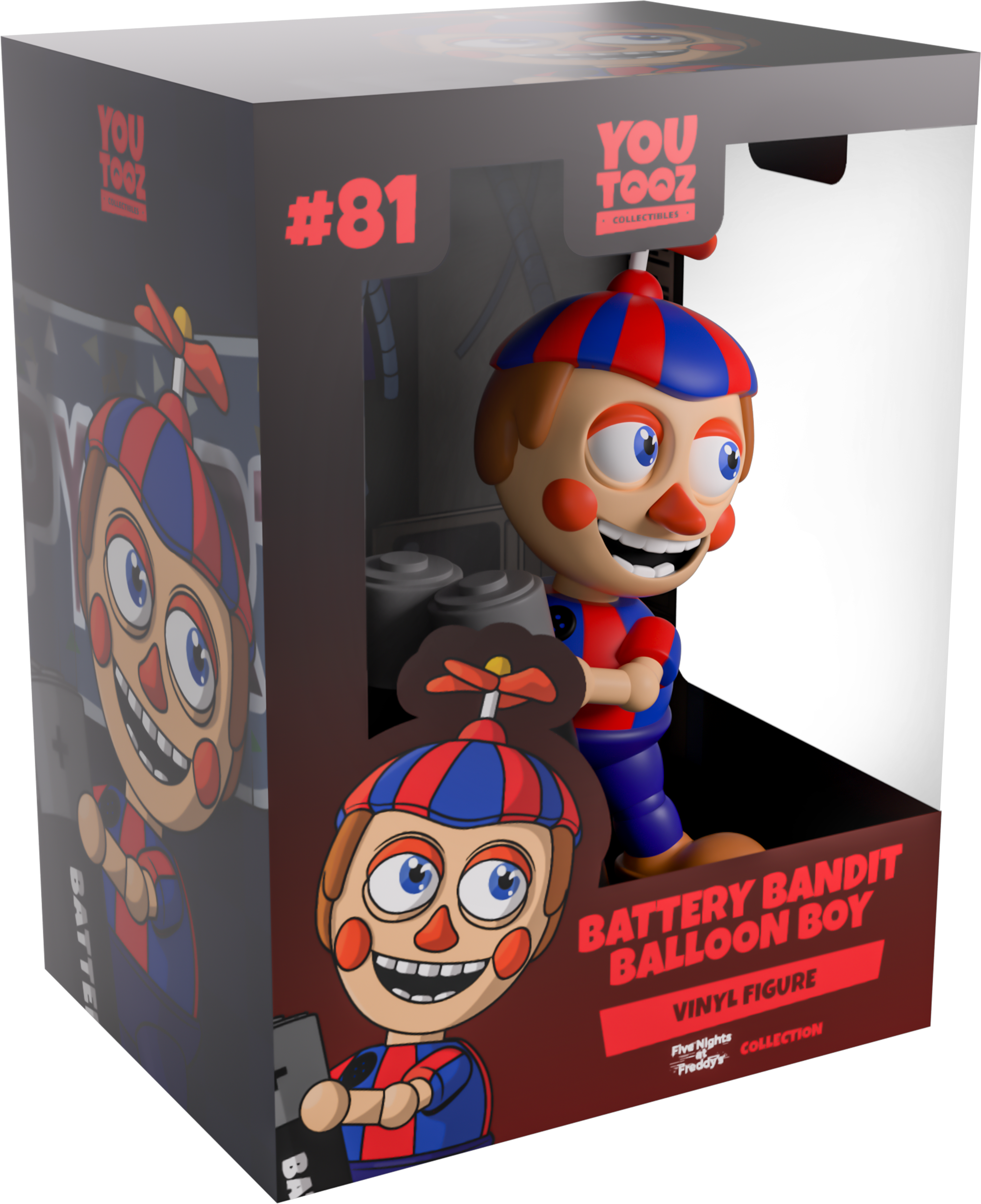 Why have the lights gone out? Quick, grab the flashlight… Wait, where are the batteries?! Ohhh, I bet it was that Balloon Boy! Standing at 4.8 inches tall and holding onto a pair of tall batteries that have red tips, he looks up playfully with deep blue eyes as a red and blue propeller hat rests atop his brown hair. With a long pointed nose stretching out from above, a wide smile and round cheeks, he wears a striped shirt with a button on the chest, along with dark blue pants and thick brown shoes. The exterior of his packaging sees Balloon Boy peeking over the edge of a table to stare at a pair of batteries,while the interior looks into a dark room with a checkered floor as old monitors are stacked in the background. The protective sleeve is then covered in vertical blue and black stripes with thick wires dangling from the top, and their figure can be seen through the large, clear window at the packaging’s front. This collectible ships in a matte, embossed, protective outer sleeve and a custom-sized plastic protector for maximum protection during shipping.