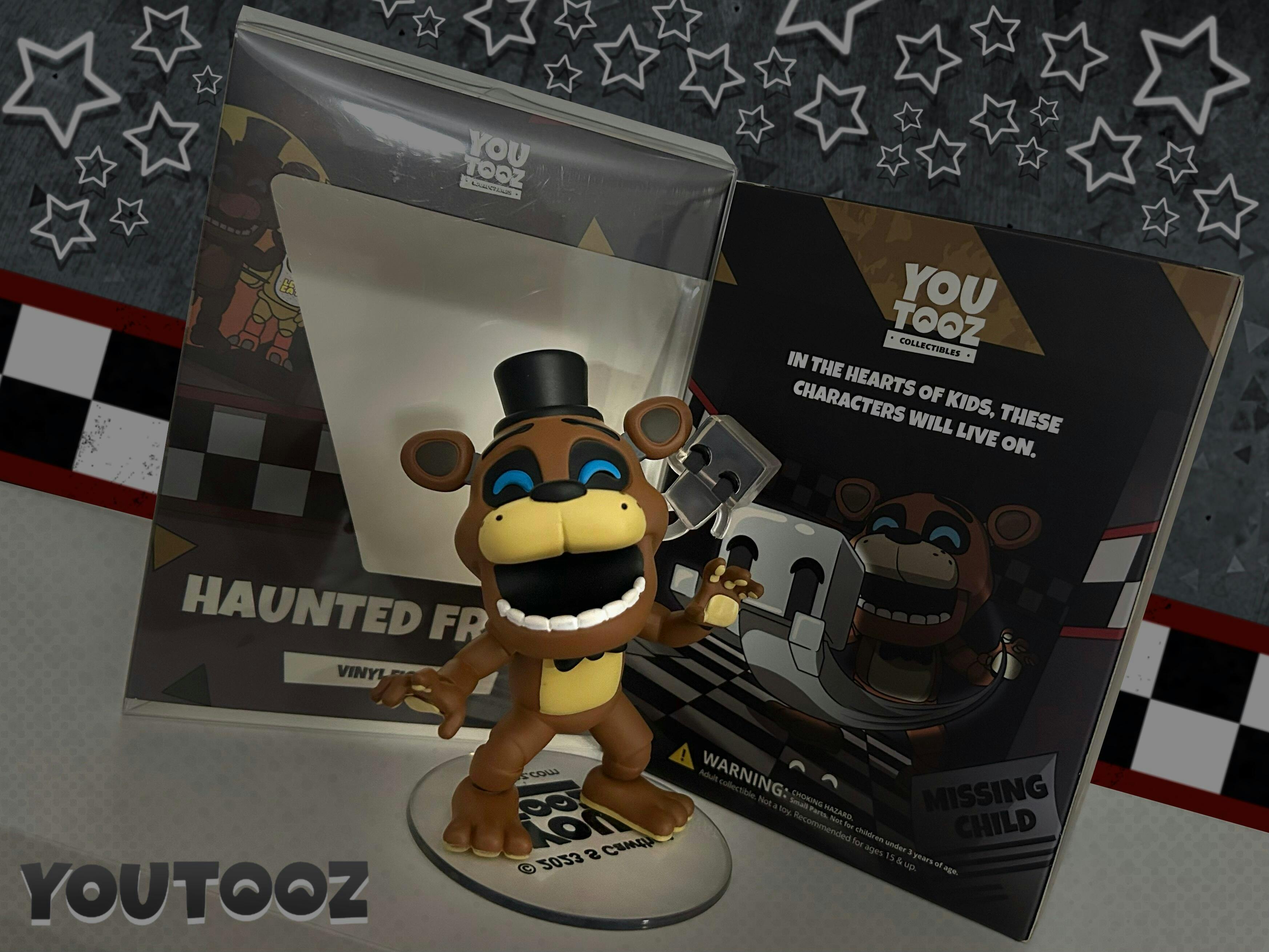 Freddy looks amazing and is posed like he would do when he’s jump scaring you from running out of power. It came in a hard plastic protective sleeve as well as a cardboard sleeve picturing a cartoon of the figure. But the actual box itself is AMAZING. I love how Youtooz put little Easter eggs all over the packaging and this one is no different- even on the inside there are some wicked details! So whilst I’m a collector who takes things out of boxes, I wouldn’t think it be weird to not with this one because it looks sick :)