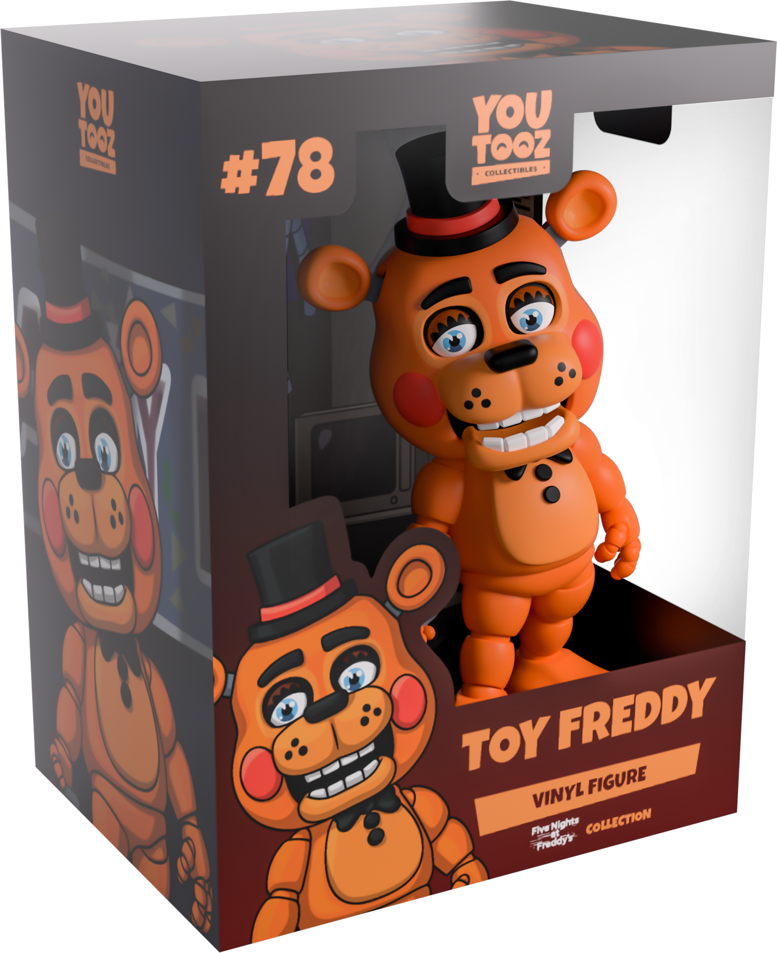 Freddy’s our friend, right? Why else would he return to Youtooz?! Standing at 4.8 inches tall and holding a microphone to the side in his right hand, bright blue pupils shine out from deep sockets as rosy pink cheeks rest to either side of a thick, toothy muzzle. With a black top hat placed between two extended ears and a matching bowtie under his wide chin, segmented arms and legs are attached to a round orange torso that has a light stomach. The exterior of his packaging sees Freddy leaning forward from a shadowy line of animatronics, while the interior looks into a dark room with a checkered floor as old monitors are stacked in the background. The protective sleeve is then covered in vertical blue and black stripes with thick wires dangling from the top, and their figure can be seen through the large, clear window at the packaging’s front. This collectible ships in a matte, embossed, protective outer sleeve and a custom-sized plastic protector for maximum protection during shipping.