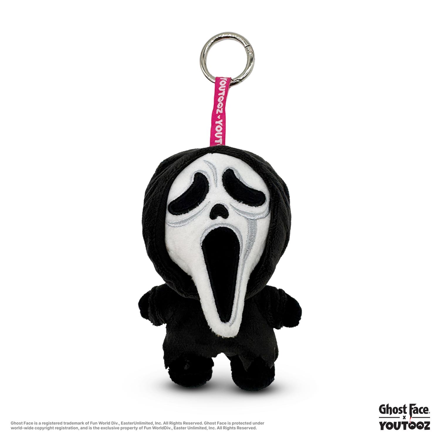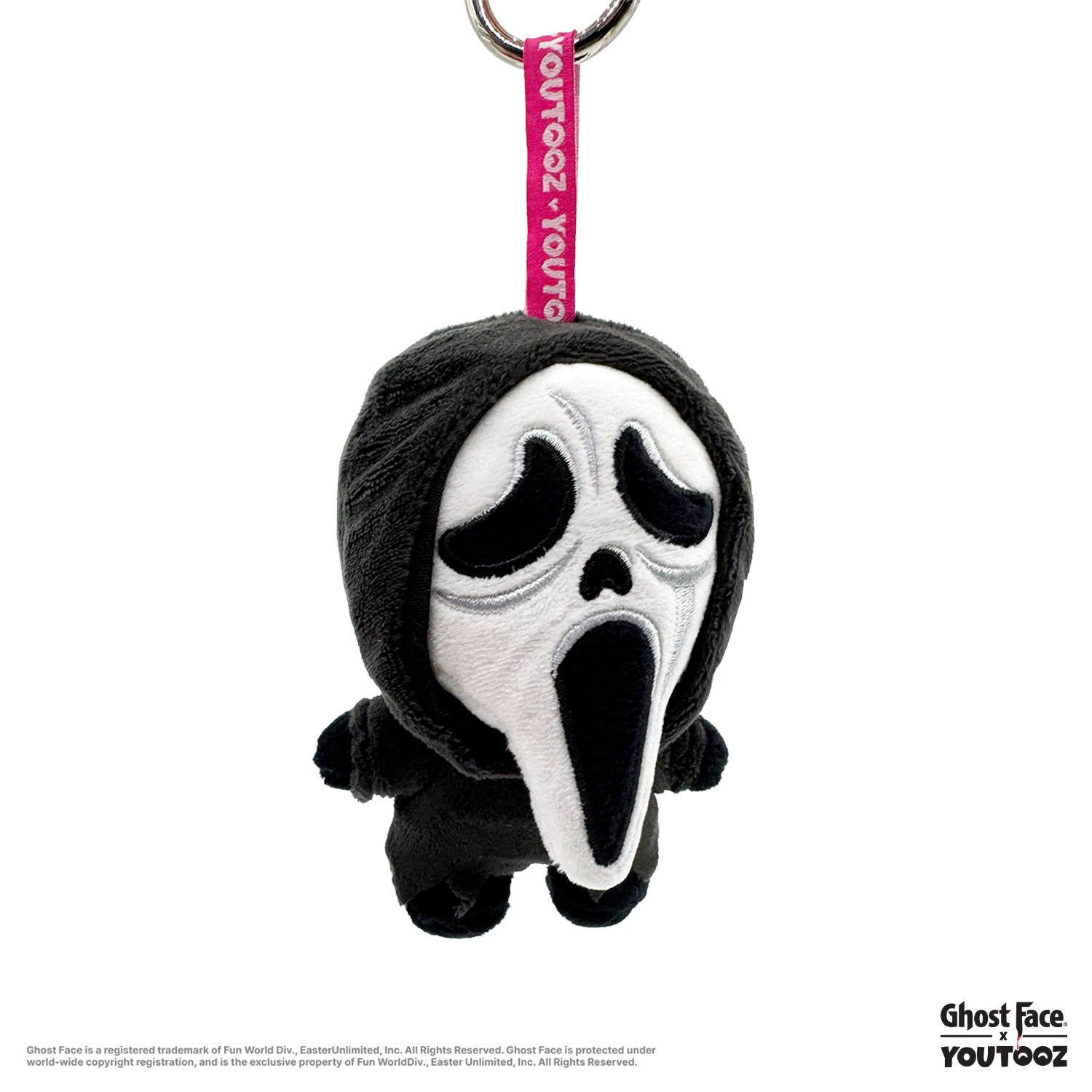 Ghost Face is ready to tag along for all your murd… uhh… activities… with our brand new keychain! At 5 inches tall with their signature white mask that has hollow black eyes and a huge elongated screaming mouth, they wear a long black cloak that wraps over their head and down to tattered ends at their hands and feet. This keychain is packed to the seams with 100% PP cotton and is made of the softest minky material with a keyring attached to the top by a pink Youtooz tag, absolutely perfect to hang from your backpack, purse, pants or wherever you want to show off your love for the fandom!