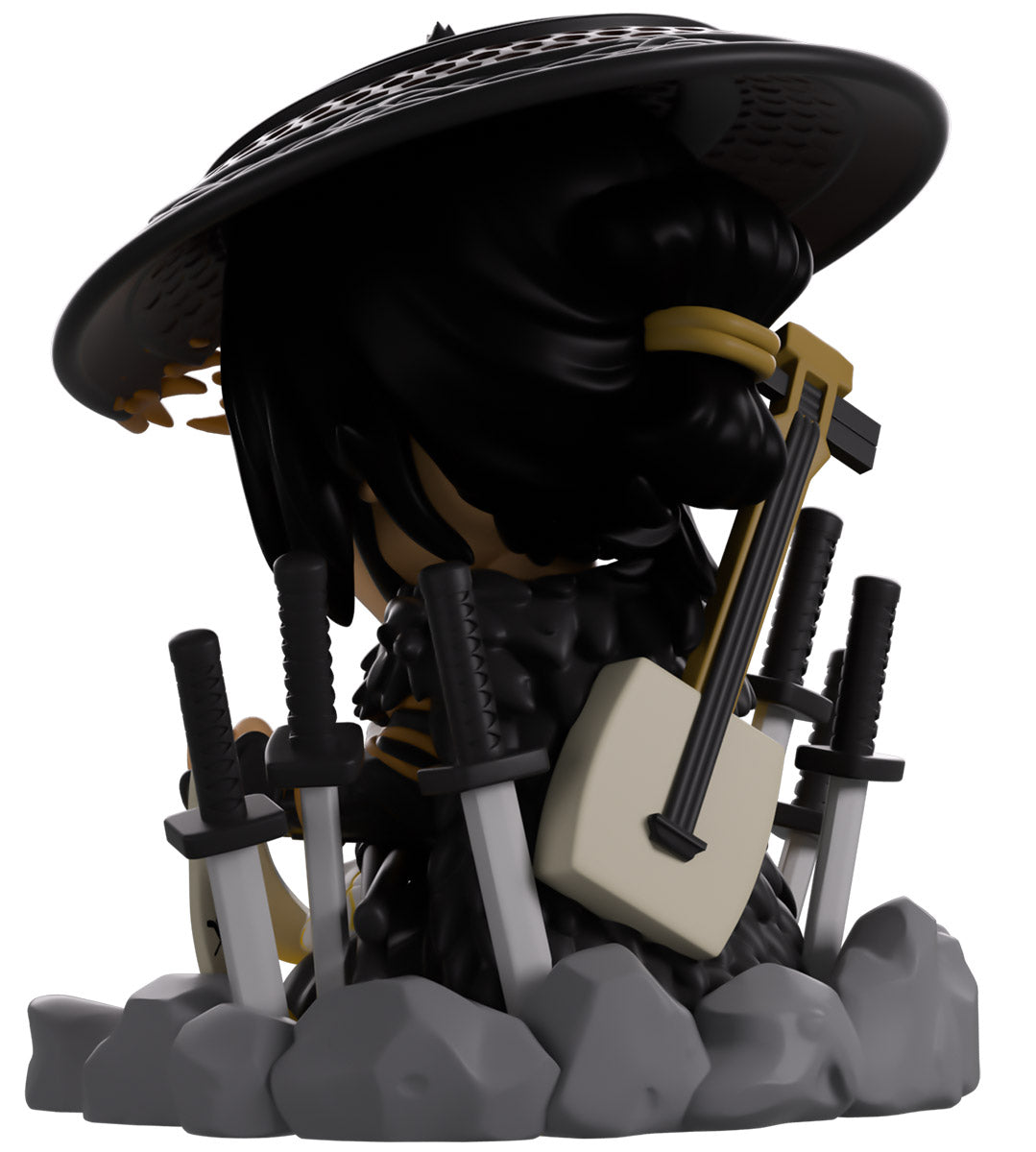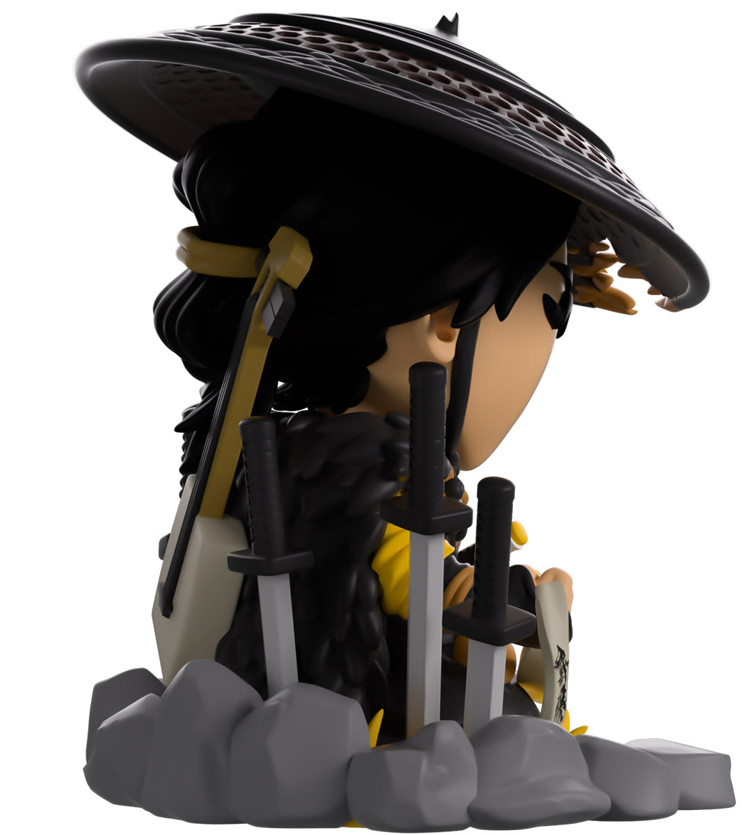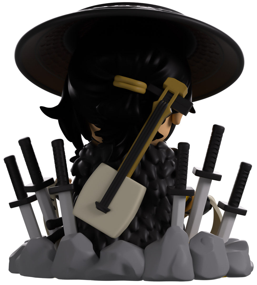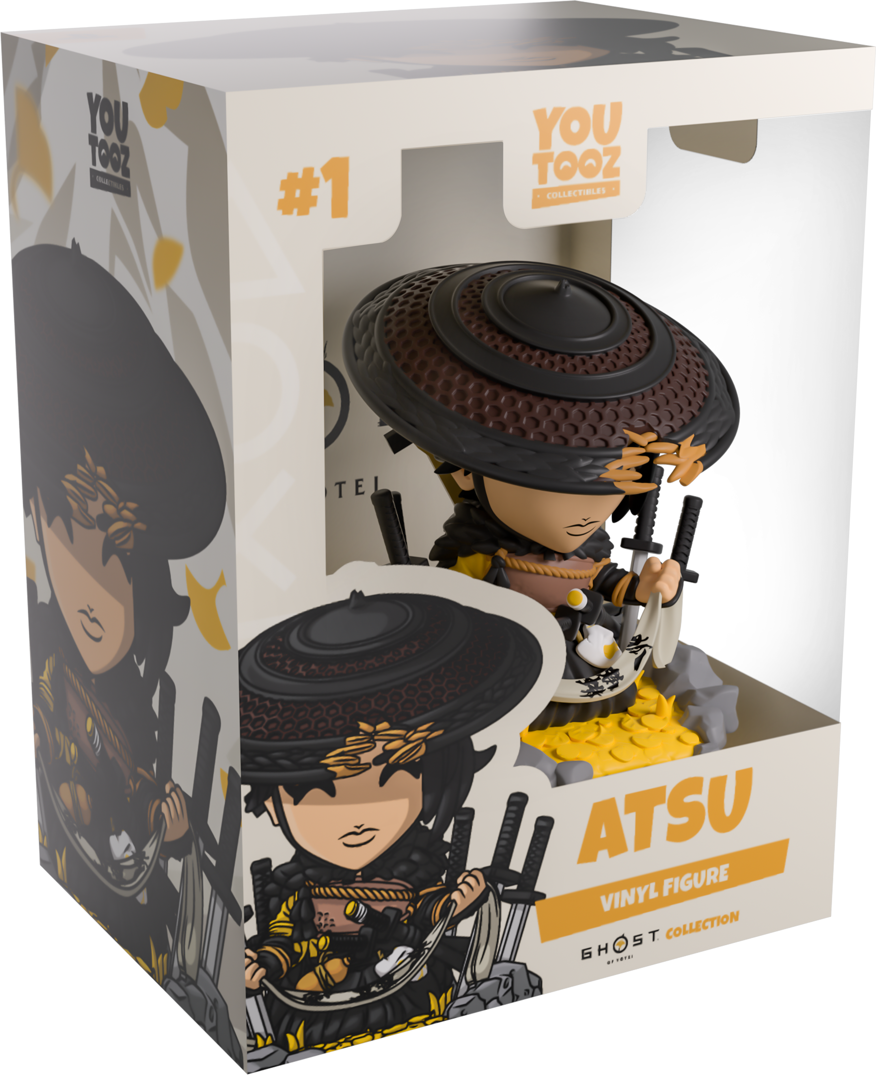 Atsu’s tracked the Yōtei Six to Youtooz and is preparing to unleash her long-awaited vengeance! Kneeling in a pile of golden ginkgo leaves at 3.7 inches tall and staring down at the black and white headband held to her front. A dark, round straw hat with a gash in the front rests atop her head as long black hair is pulled onto a knot at the back. Surrounded by swords with their blades thrust into the ground, she wears a long, feathered cloak over yellow and brown armor as a pair of katana are strapped to her hip, and a shamisen rests on her back. The exterior of her packaging sees her sitting at the base of a shadowy mountain as golden ginkgo leaves dance through the sky, while the interior is a soft beige that surrounds her completely. The bright ginkgo leaves then sweep onto the protective sleeve, where her figure can be seen through the large, clear window at the packaging’s front. This collectible ships in a matte, embossed, protective outer sleeve and a custom-sized plastic protector for maximum protection during shipping.
