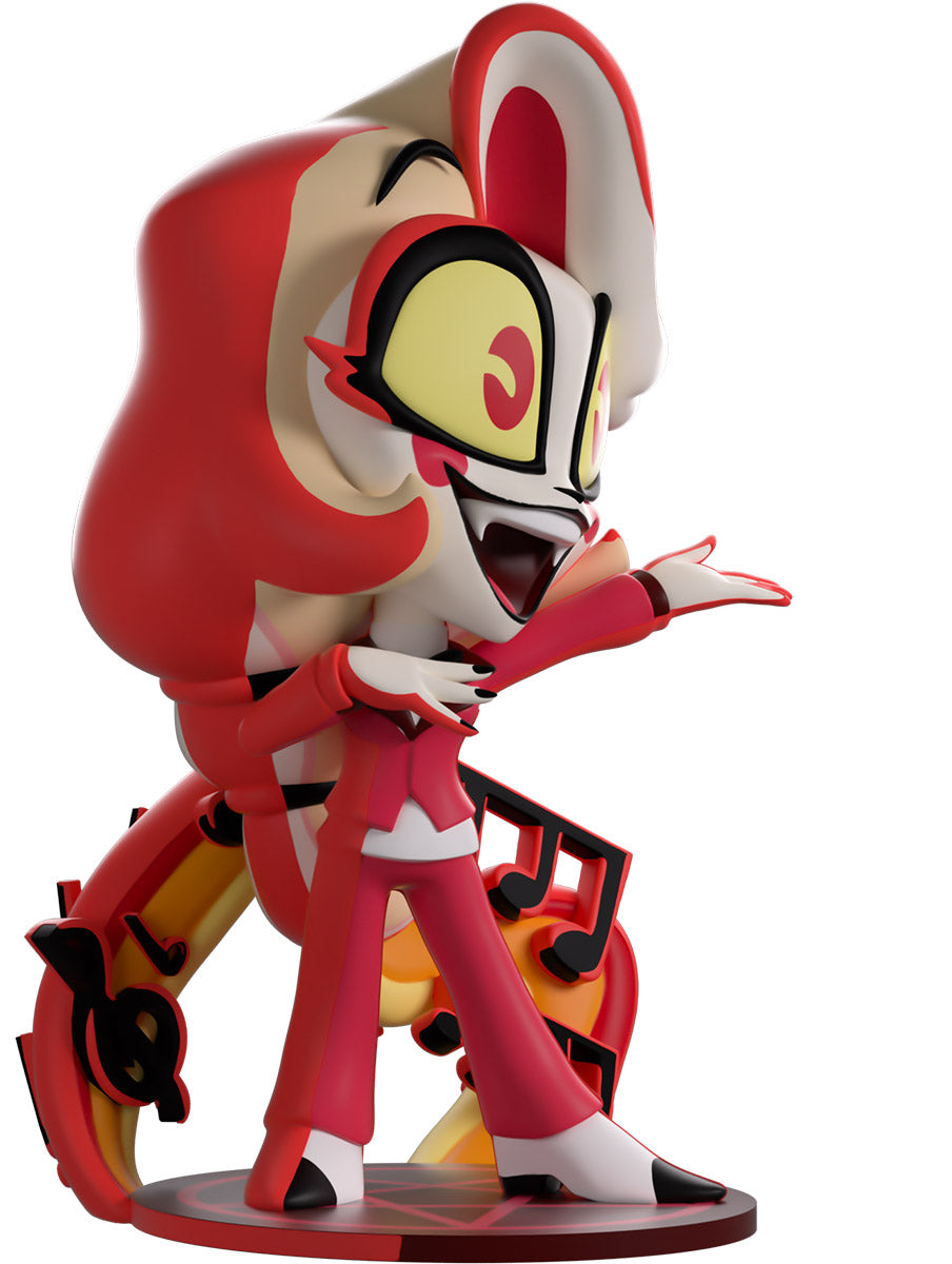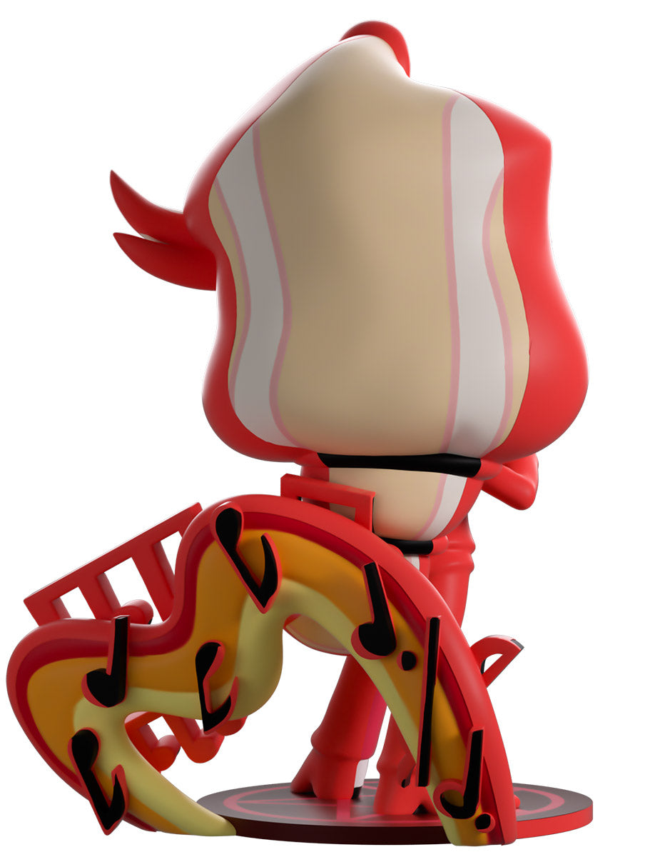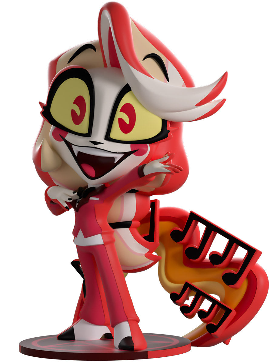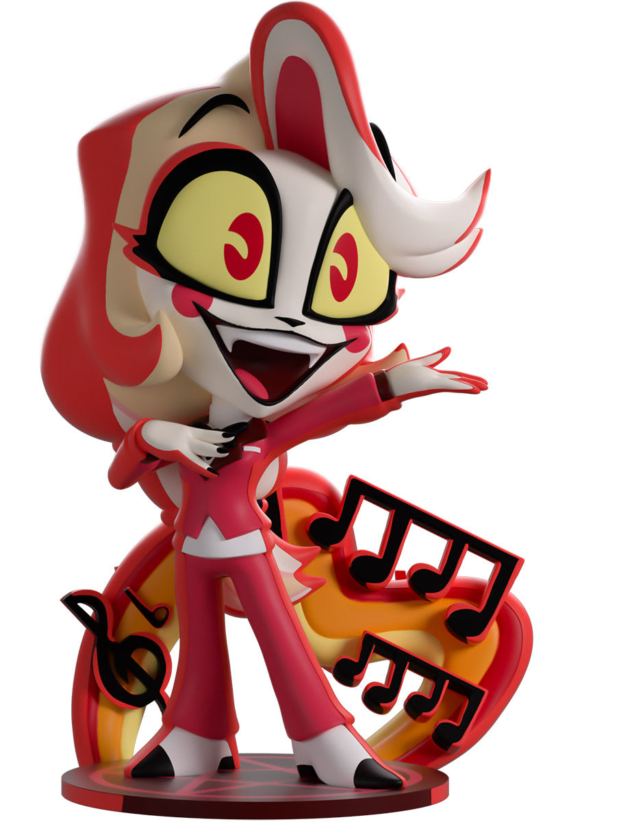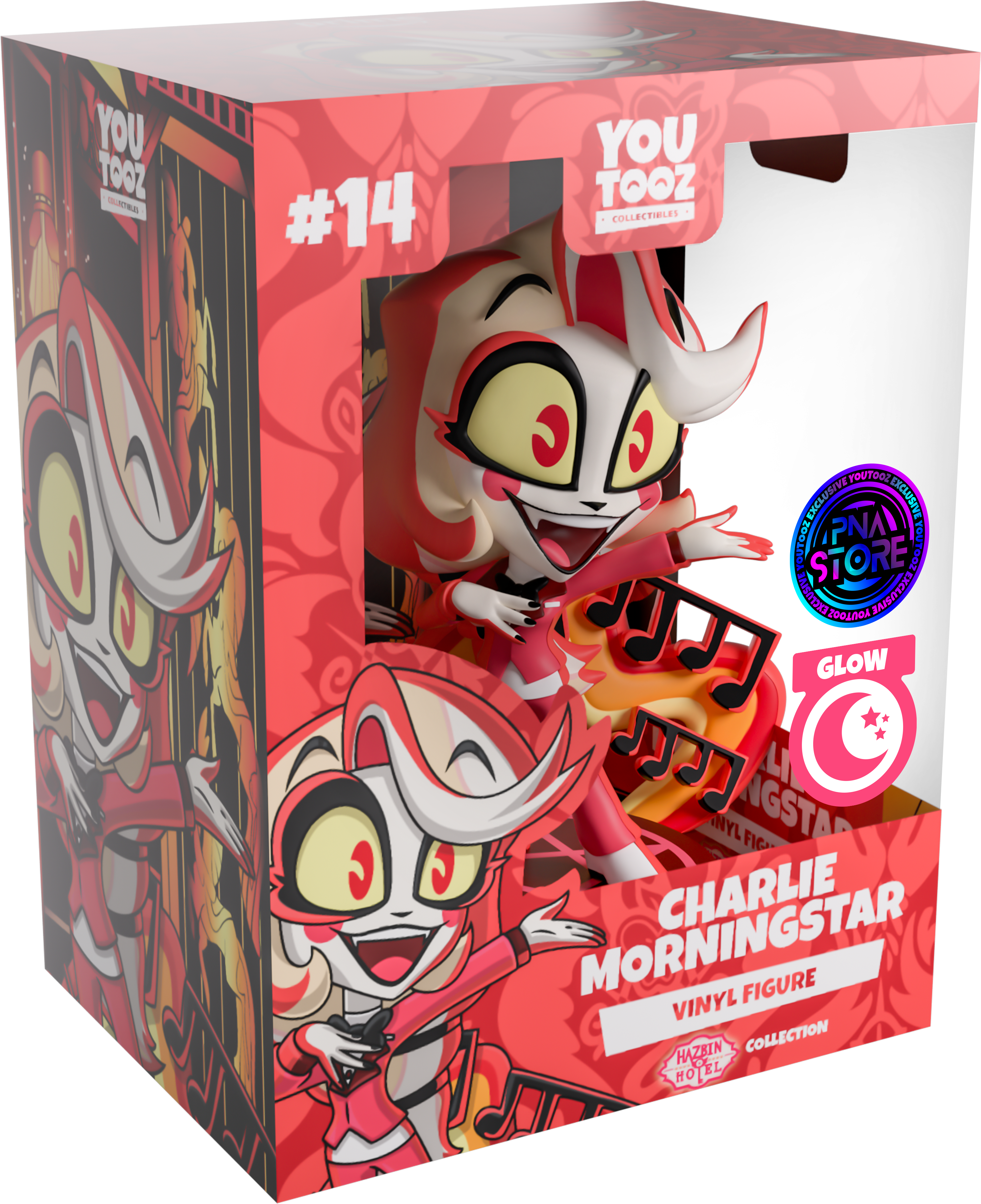 Charlie’s returned to Youtooz, and she’s positively glowing about all the souls she can save! Standing at 5.2 inches tall and looking hopefully to the side with bright yellow eyes as her mouth raises into a pointed smile over rosy cheeks, her blonde fringe flicks forward as the rest of her hair is pulled into a thick ponytail at her back with deep orange glowing streaks down either side. Wearing a red jacket over a high-collar white shirt with matching red pants, vibrant yellow, orange, and red song waves glow behind her with black music notes. The exterior of her packaging puts you right on the hotel’s foyer in front of a long maroon staircase as ornate golden patterns line the walls and railings. The box's interior is then covered in an elegant pink patterned wallpaper, while the exterior shows off a dark cityscape as her figure can be seen through the large, clear window at the packaging’s front. This collectible ships in a matte, embossed, protective outer sleeve and a custom-sized plastic protector for maximum protection during shipping.