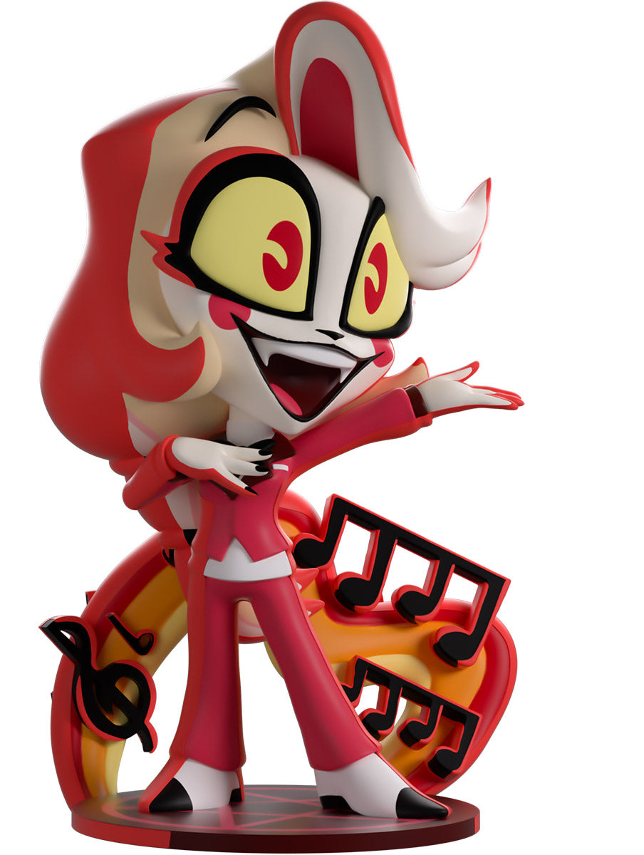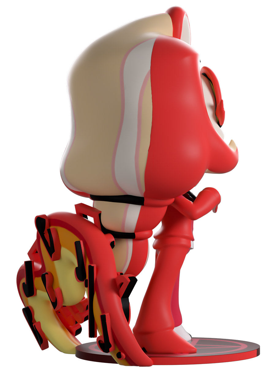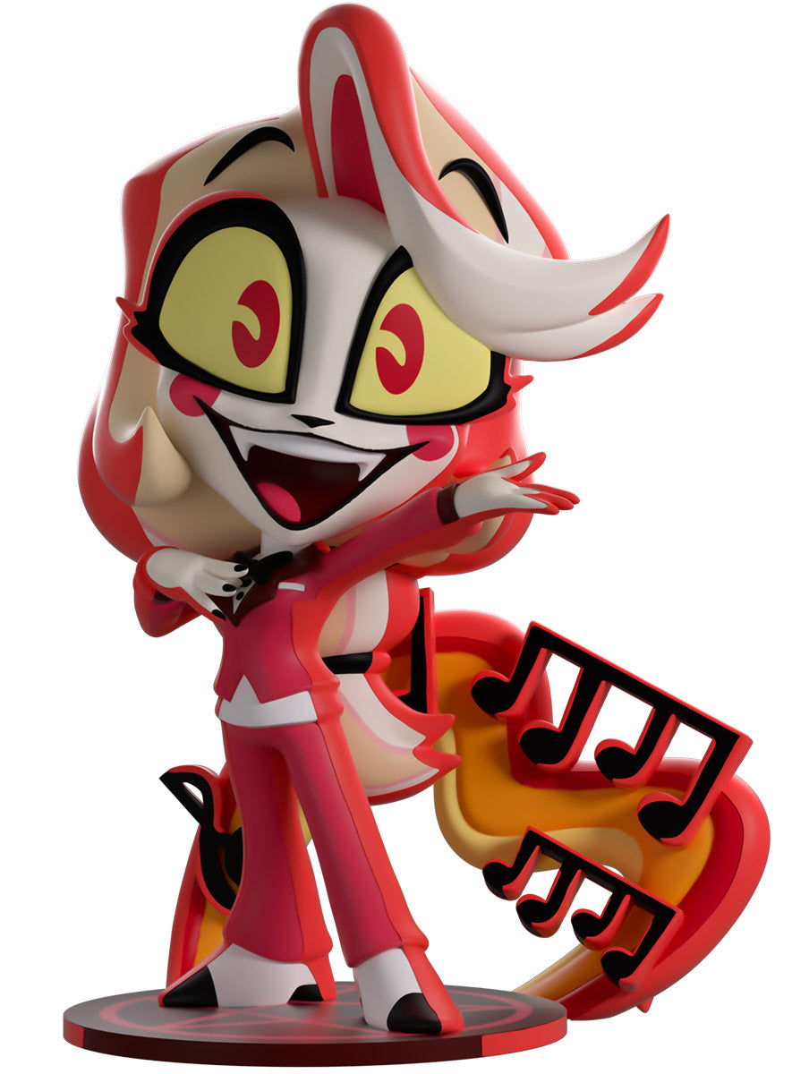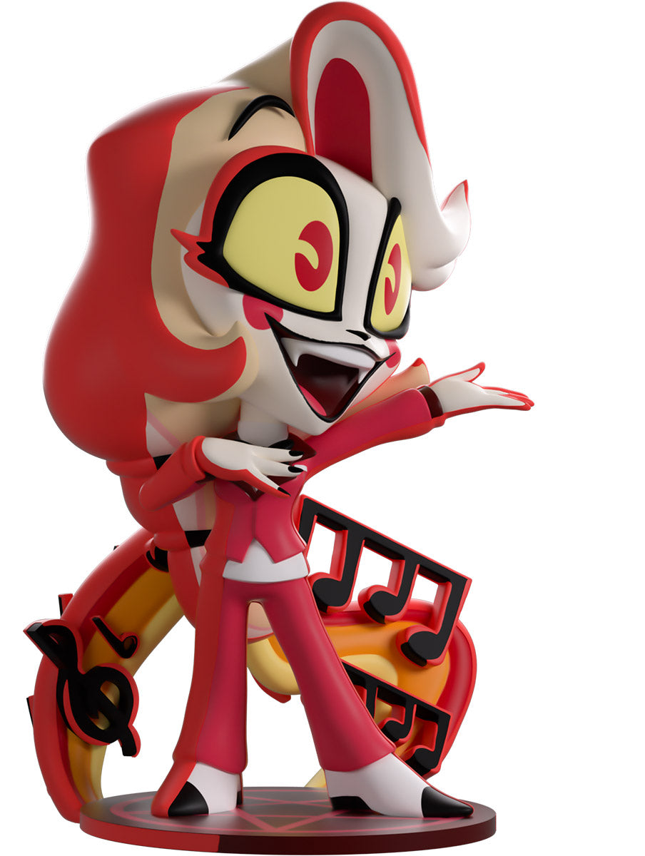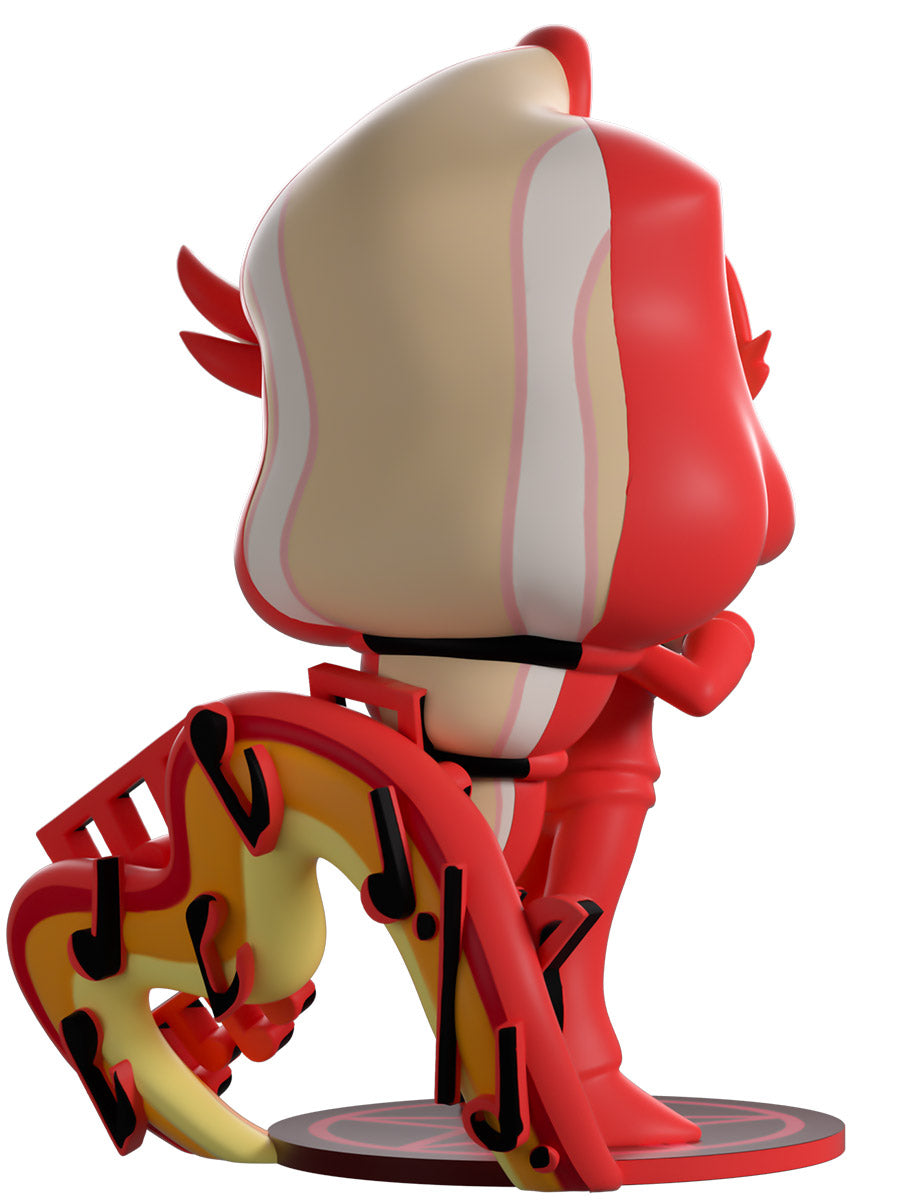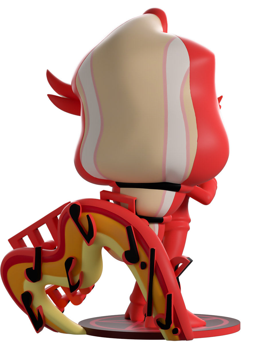 Charlie’s returned to Youtooz, and she’s positively glowing about all the souls she can save! Standing at 5.2 inches tall and looking hopefully to the side with bright yellow eyes as her mouth raises into a pointed smile over rosy cheeks, her blonde fringe flicks forward as the rest of her hair is pulled into a thick ponytail at her back with deep orange glowing streaks down either side. Wearing a red jacket over a high-collar white shirt with matching red pants, vibrant yellow, orange, and red song waves glow behind her with black music notes. The exterior of her packaging puts you right on the hotel’s foyer in front of a long maroon staircase as ornate golden patterns line the walls and railings. The box's interior is then covered in an elegant pink patterned wallpaper, while the exterior shows off a dark cityscape as her figure can be seen through the large, clear window at the packaging’s front. This collectible ships in a matte, embossed, protective outer sleeve and a custom-sized plastic protector for maximum protection during shipping.