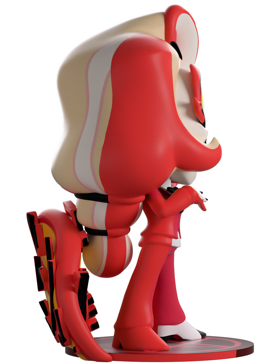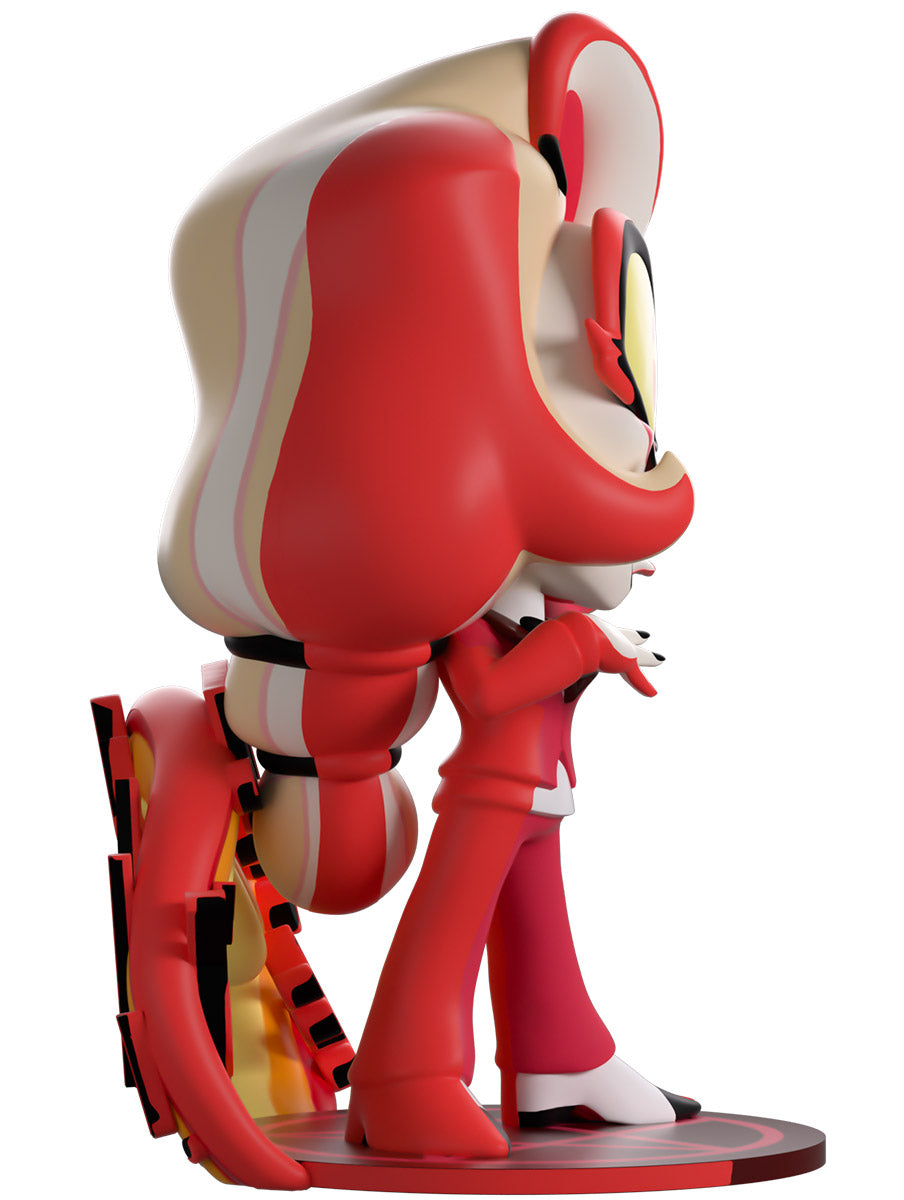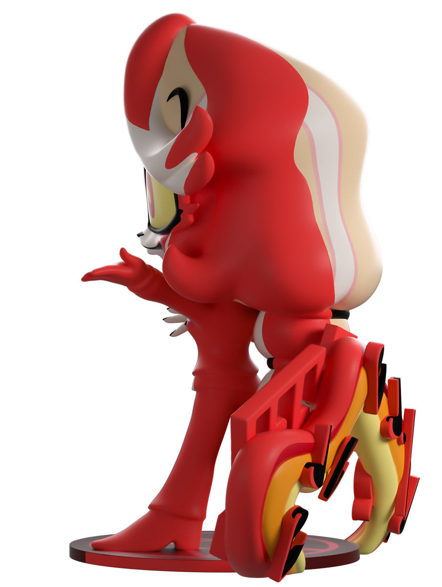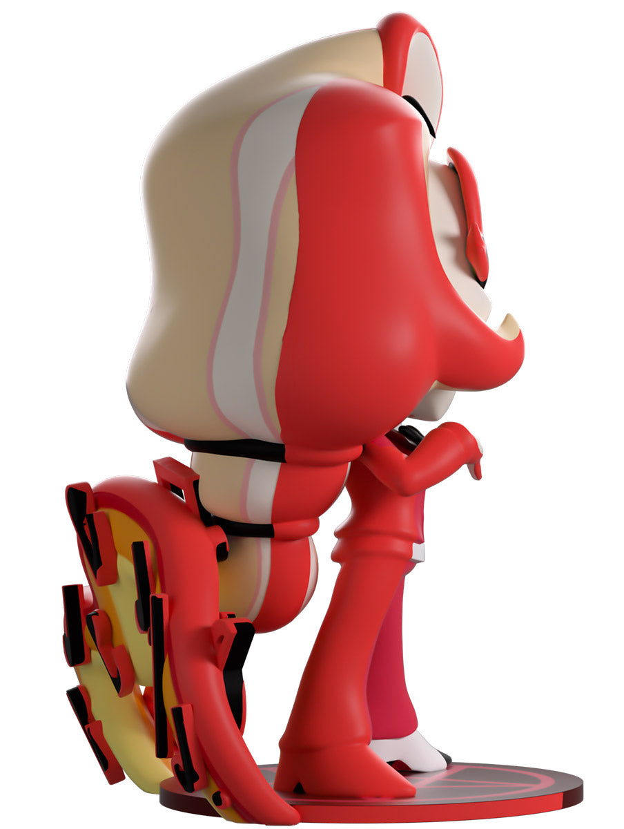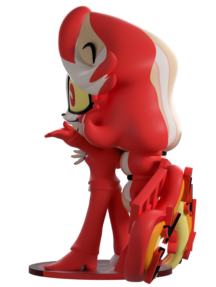Charlie’s returned to Youtooz, and she’s positively glowing about all the souls she can save! Standing at 5.2 inches tall and looking hopefully to the side with bright yellow eyes as her mouth raises into a pointed smile over rosy cheeks, her blonde fringe flicks forward as the rest of her hair is pulled into a thick ponytail at her back with deep orange glowing streaks down either side. Wearing a red jacket over a high-collar white shirt with matching red pants, vibrant yellow, orange, and red song waves glow behind her with black music notes. The exterior of her packaging puts you right on the hotel’s foyer in front of a long maroon staircase as ornate golden patterns line the walls and railings. The box's interior is then covered in an elegant pink patterned wallpaper, while the exterior shows off a dark cityscape as her figure can be seen through the large, clear window at the packaging’s front. This collectible ships in a matte, embossed, protective outer sleeve and a custom-sized plastic protector for maximum protection during shipping.