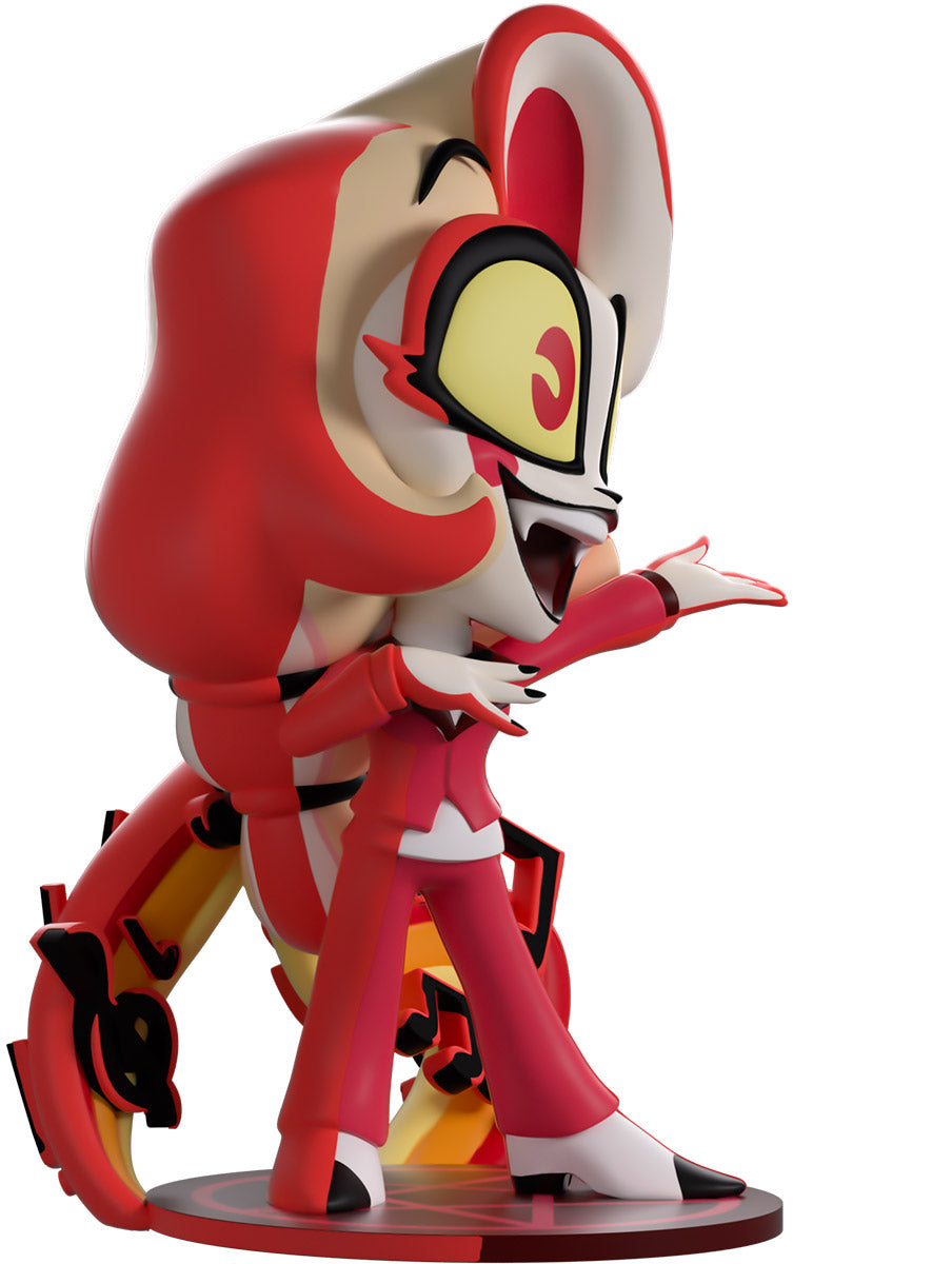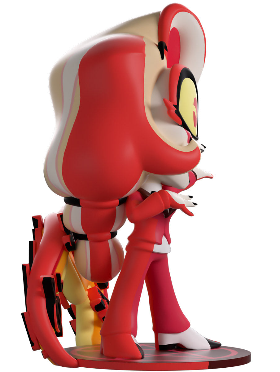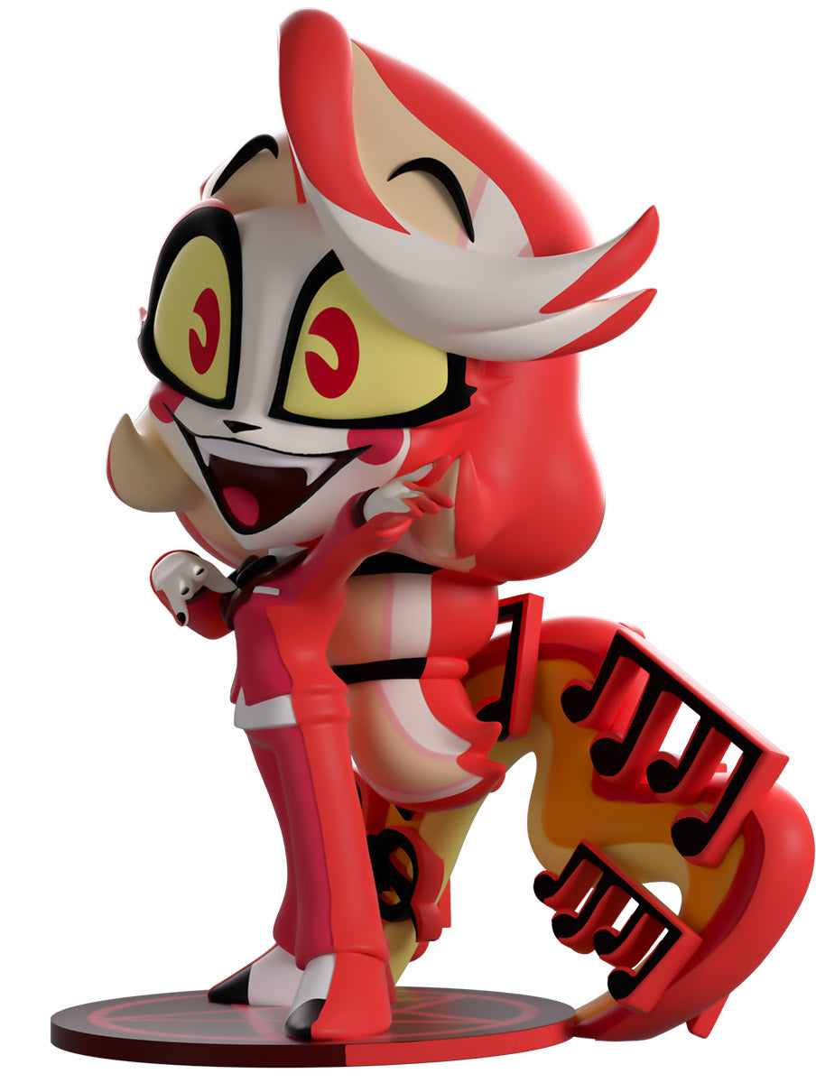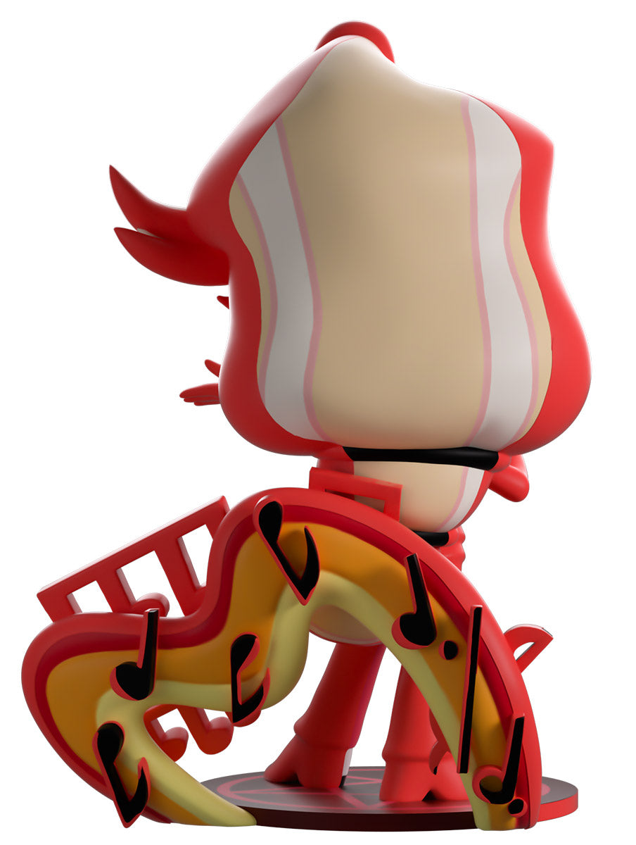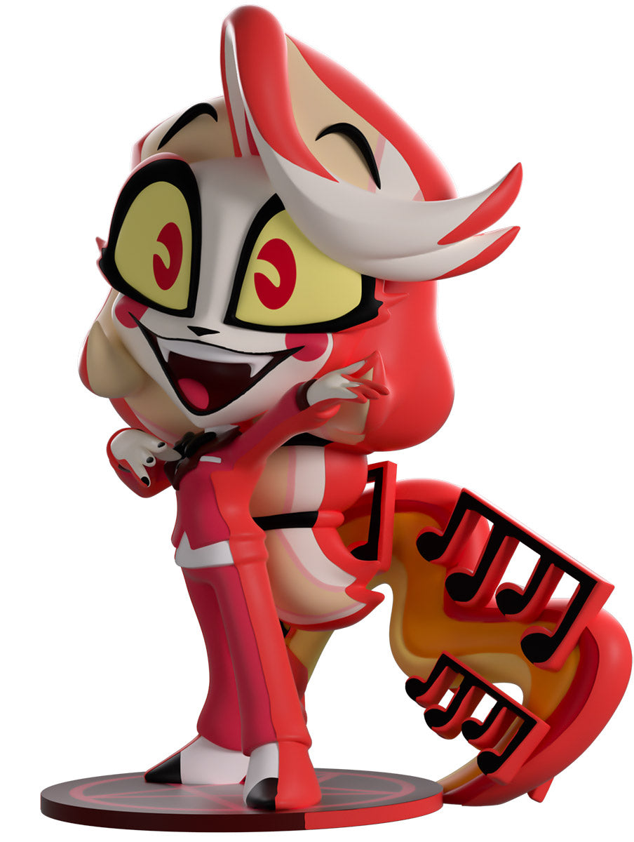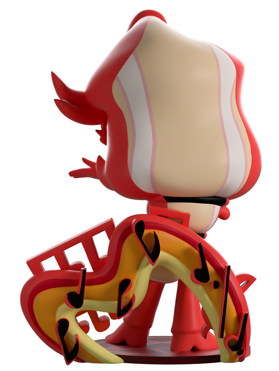 Charlie’s returned to Youtooz, and she’s positively glowing about all the souls she can save! Standing at 5.2 inches tall and looking hopefully to the side with bright yellow eyes as her mouth raises into a pointed smile over rosy cheeks, her blonde fringe flicks forward as the rest of her hair is pulled into a thick ponytail at her back with deep orange glowing streaks down either side. Wearing a red jacket over a high-collar white shirt with matching red pants, vibrant yellow, orange, and red song waves glow behind her with black music notes. The exterior of her packaging puts you right on the hotel’s foyer in front of a long maroon staircase as ornate golden patterns line the walls and railings. The box's interior is then covered in an elegant pink patterned wallpaper, while the exterior shows off a dark cityscape as her figure can be seen through the large, clear window at the packaging’s front. This collectible ships in a matte, embossed, protective outer sleeve and a custom-sized plastic protector for maximum protection during shipping.