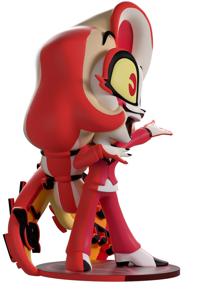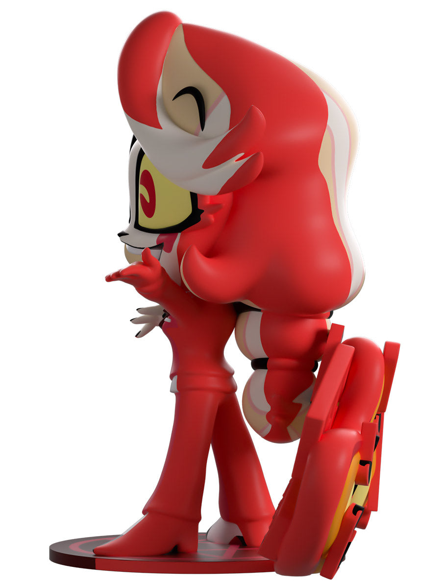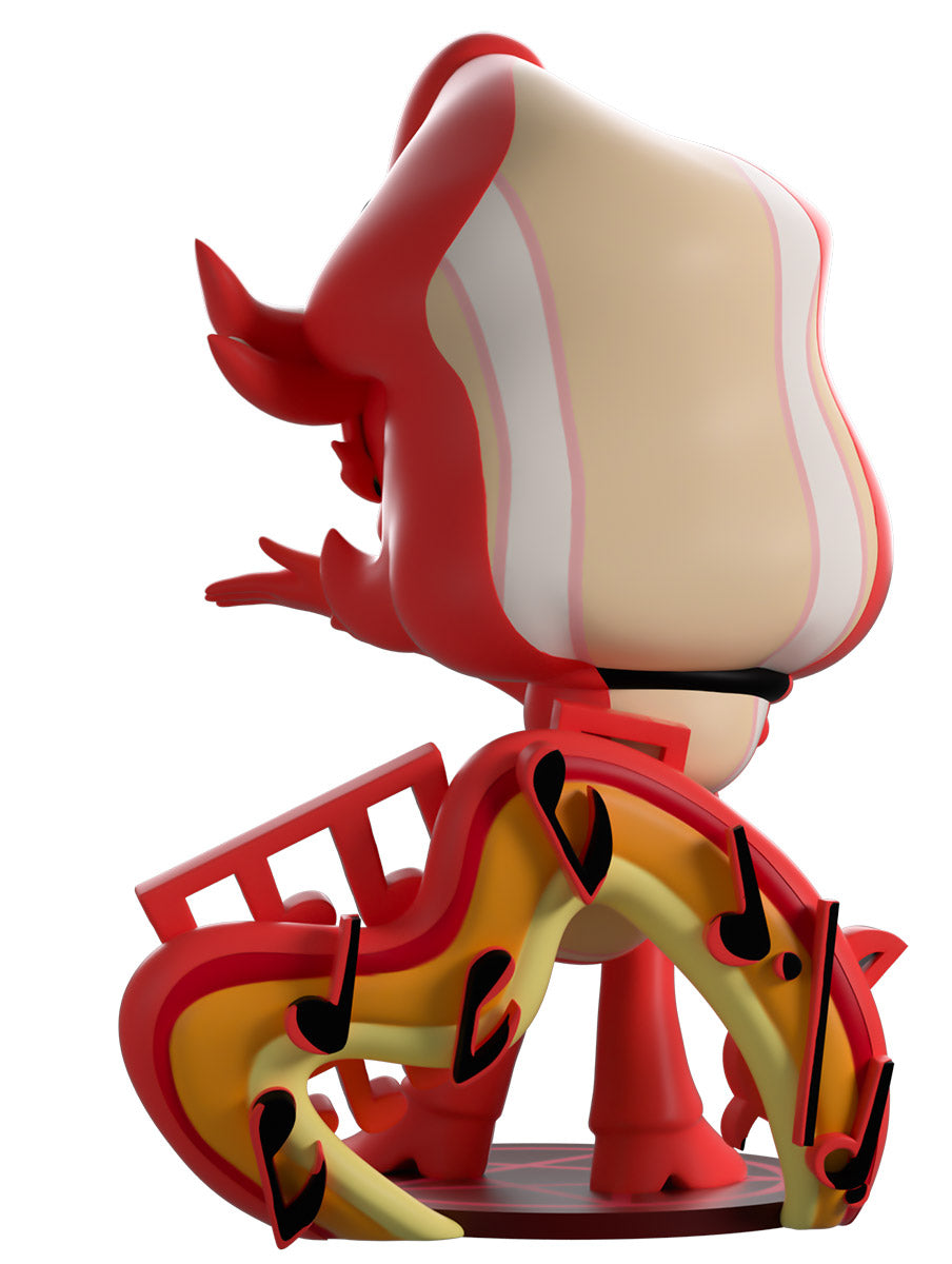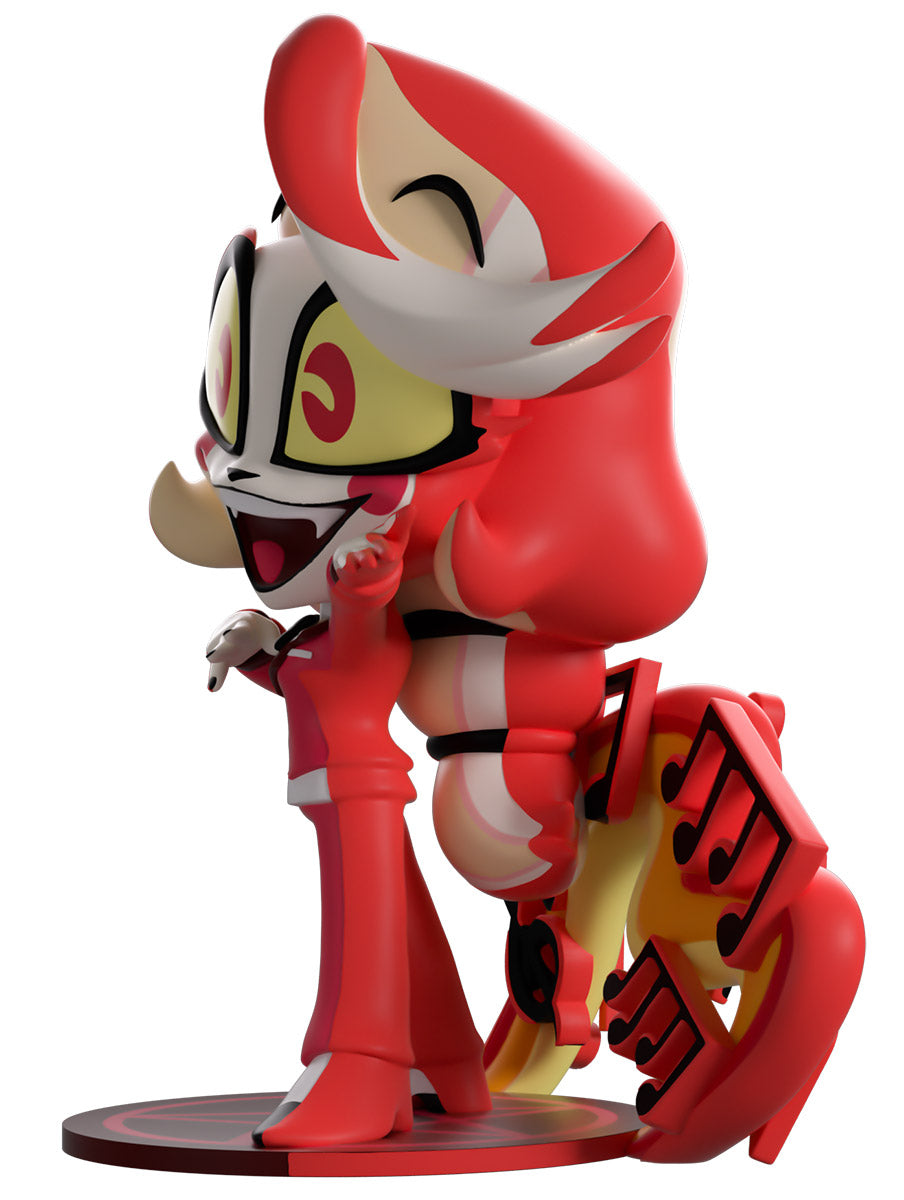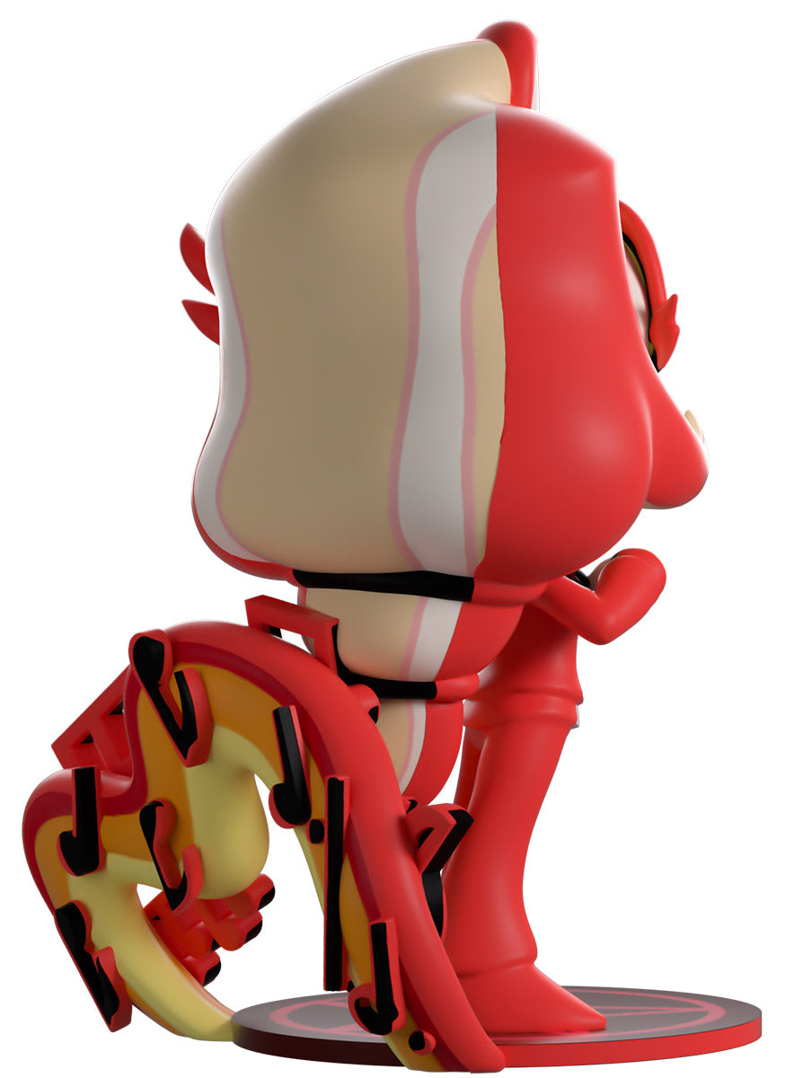 Charlie’s returned to Youtooz, and she’s positively glowing about all the souls she can save! Standing at 5.2 inches tall and looking hopefully to the side with bright yellow eyes as her mouth raises into a pointed smile over rosy cheeks, her blonde fringe flicks forward as the rest of her hair is pulled into a thick ponytail at her back with deep orange glowing streaks down either side. Wearing a red jacket over a high-collar white shirt with matching red pants, vibrant yellow, orange, and red song waves glow behind her with black music notes. The exterior of her packaging puts you right on the hotel’s foyer in front of a long maroon staircase as ornate golden patterns line the walls and railings. The box's interior is then covered in an elegant pink patterned wallpaper, while the exterior shows off a dark cityscape as her figure can be seen through the large, clear window at the packaging’s front. This collectible ships in a matte, embossed, protective outer sleeve and a custom-sized plastic protector for maximum protection during shipping.