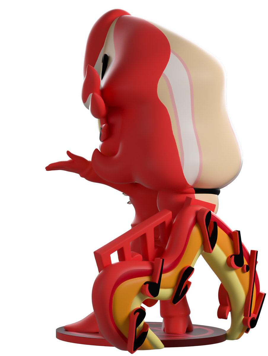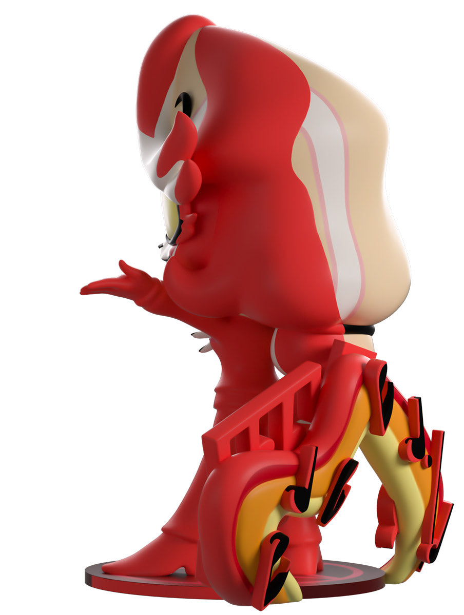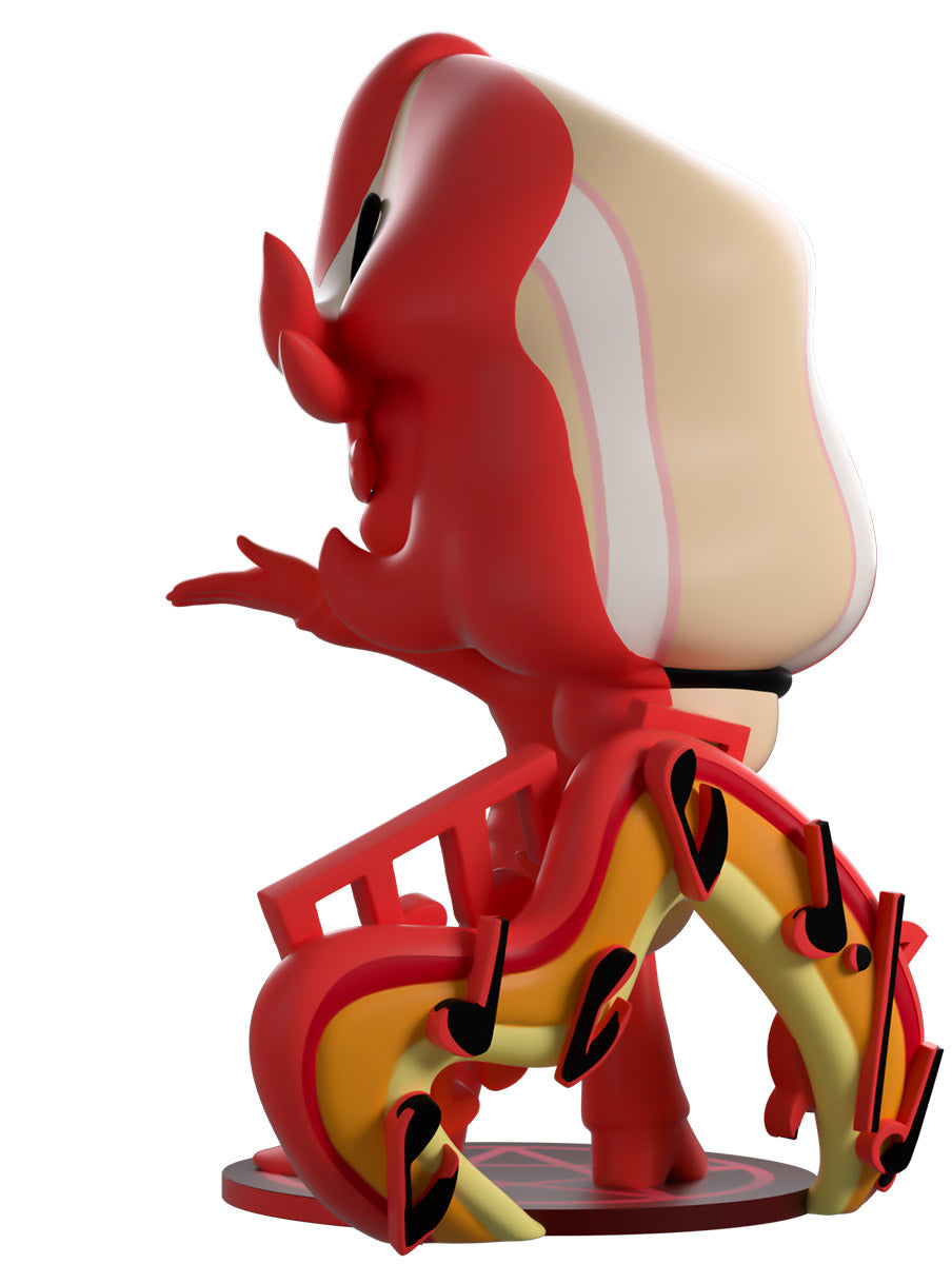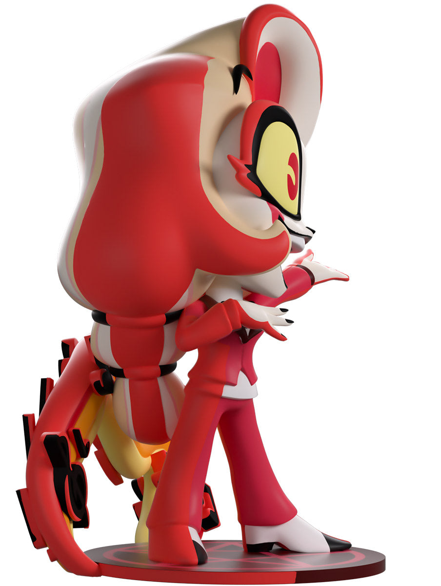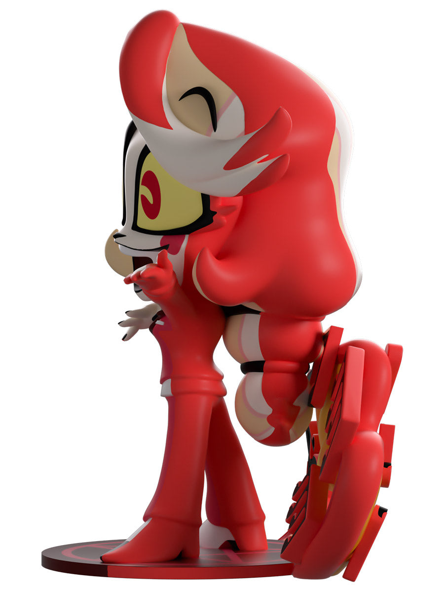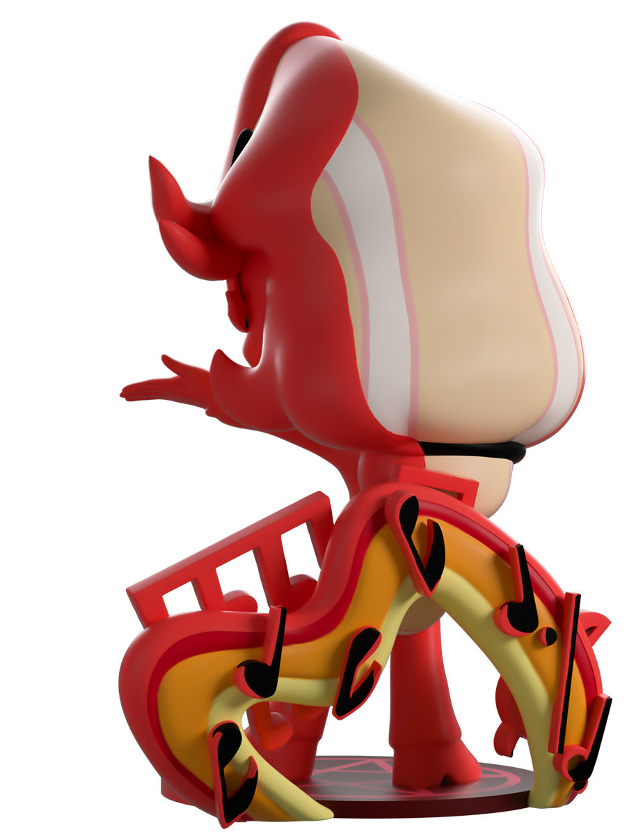Charlie’s returned to Youtooz, and she’s positively glowing about all the souls she can save! Standing at 5.2 inches tall and looking hopefully to the side with bright yellow eyes as her mouth raises into a pointed smile over rosy cheeks, her blonde fringe flicks forward as the rest of her hair is pulled into a thick ponytail at her back with deep orange glowing streaks down either side. Wearing a red jacket over a high-collar white shirt with matching red pants, vibrant yellow, orange, and red song waves glow behind her with black music notes. The exterior of her packaging puts you right on the hotel’s foyer in front of a long maroon staircase as ornate golden patterns line the walls and railings. The box's interior is then covered in an elegant pink patterned wallpaper, while the exterior shows off a dark cityscape as her figure can be seen through the large, clear window at the packaging’s front. This collectible ships in a matte, embossed, protective outer sleeve and a custom-sized plastic protector for maximum protection during shipping.