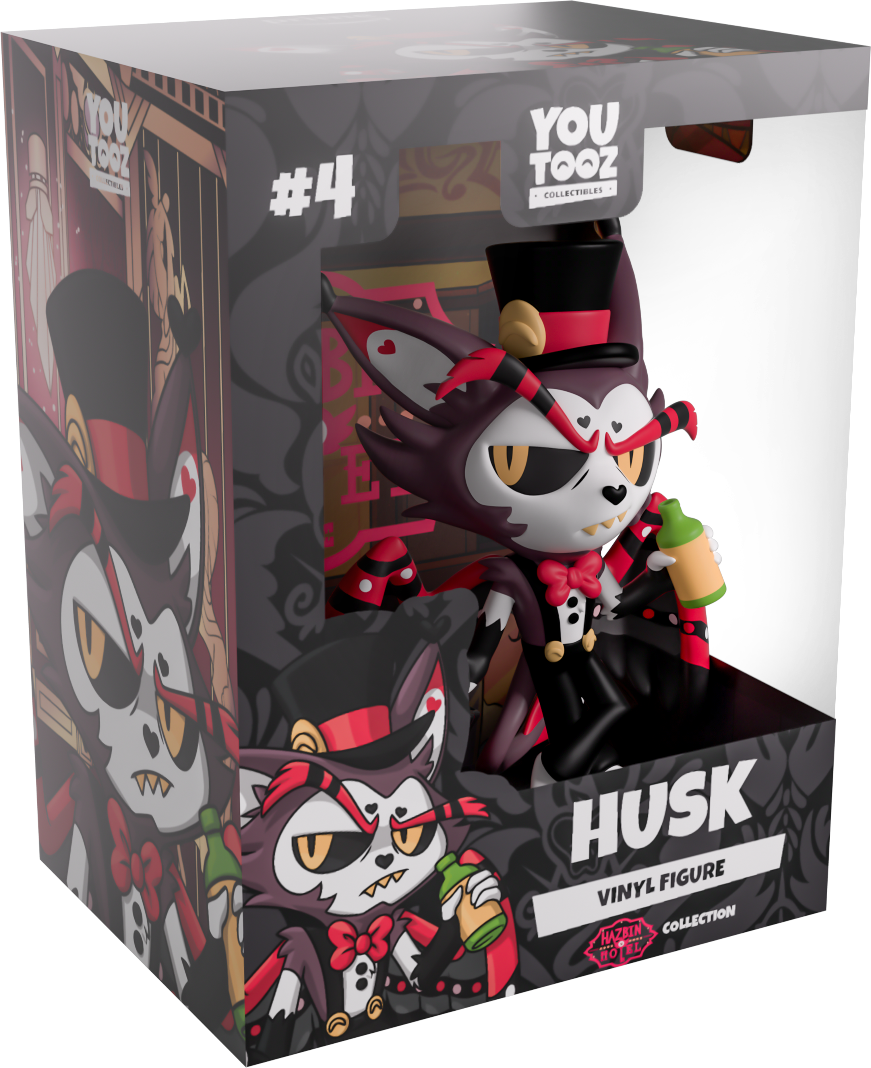 Do you need a drinking buddy? Well, Husk has landed at Youtooz to be the best bud imaginable as you drink your sorrows away! Standing at 4.6 inches tall as he holds a bottle in his left hand and shoots a disgruntled look to the side with pale yellow eyes under long striped eyebrows, his pointed ears end in little black hearts and sit to either side of a black top hat. With his red, black and white wings stretched out wide as he leans on a folded umbrella, he wears a red bowtie and suspenders as a long fanned tail wraps around his back. The exterior of his packaging is covered with ornate golden wall trim over a deep red background, while the interior sees him standing at his bar taking a huge swig from a bottle. The protective sleeve then shows off the city’s silhouette with a deep red light shining from the buildings as his figure can be seen through the large clear window at the packaging’s front. This collectible ships in a matte, embossed, protective outer sleeve and a custom-sized plastic protector for maximum protection during shipping.