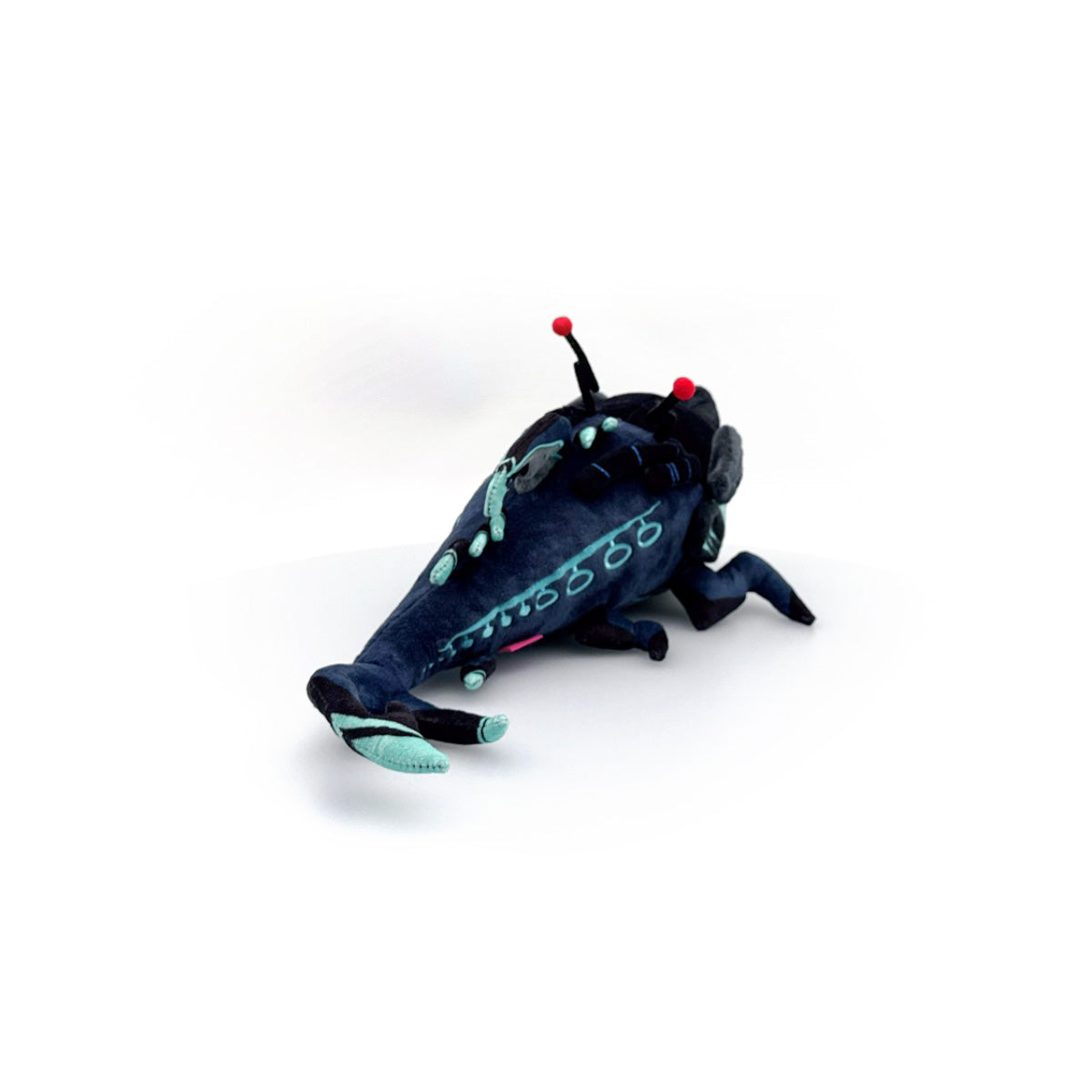 Hey! Wanna see our new pet? They’re harmless, we swear! Just don’t pat them, or go near them, or even look at them really… At 12 inches long with a pointed nose and two sets of angular red eyes above the sharpest blue teeth, long black barbels extend from the back of their head on either side of a pair of antennae that have red balled tips. With jagged fins running down their dark blue back towards a hooked tail, pointed limbs run along either side of their grey stomach as long blue patterns mark their sides. This plush is packed to the seams with 100% PP cotton and is made of the softest minky material, absolutely perfect for cuddling or maybe swimming away from… REALLY FAST!