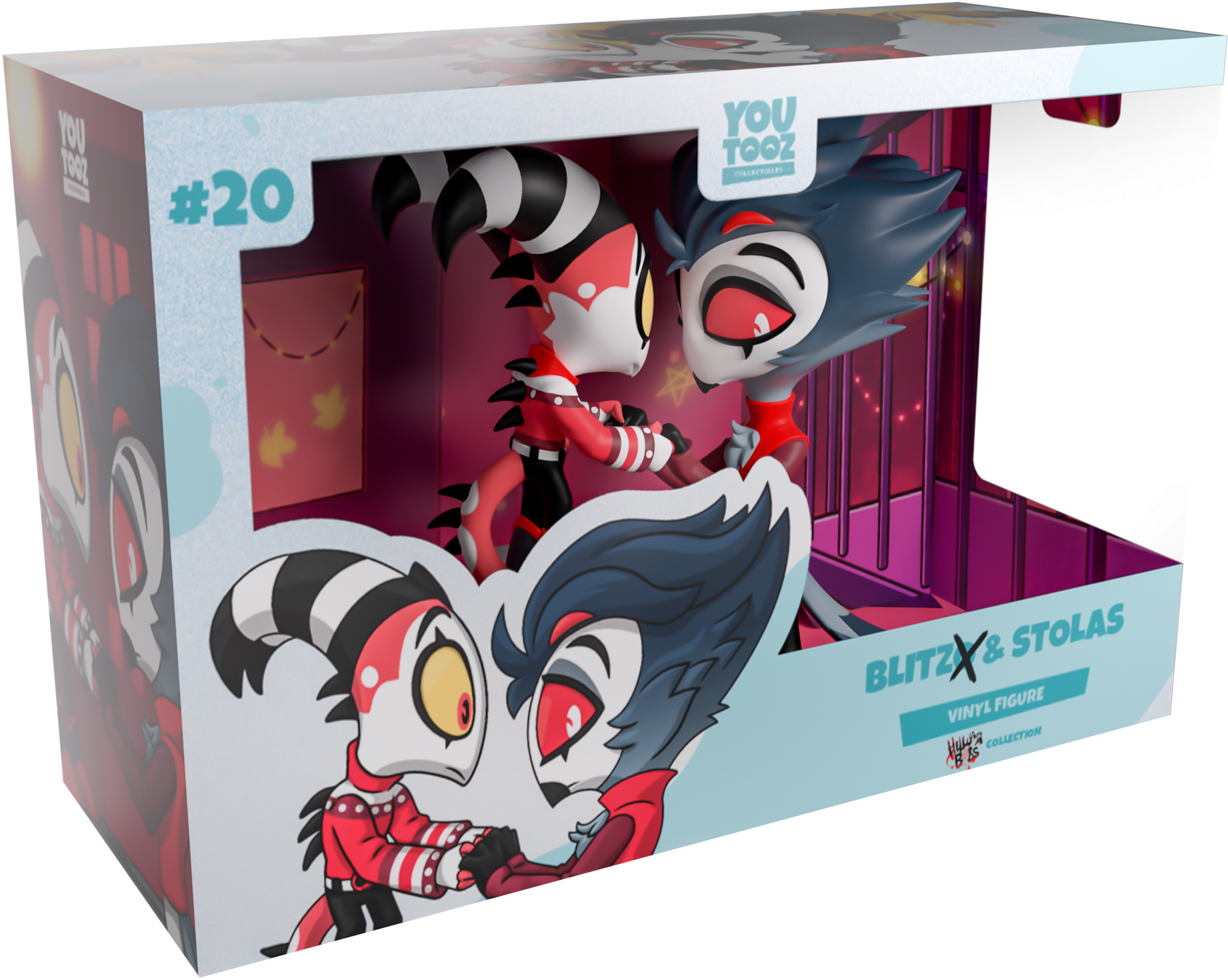 The holiday spirit has overcome Blitzo and Stolas, and they’ve danced their way right back into Youtooz! At 4.9 inches tall, this figure sees Blitzo wearing a red and white Christmas sweater as he stands atop the grey railing of a balcony and looks into Stolas’ face with bright yellow eyes as long, black and white striped horns curl out from the back of his head. While Stolas holds onto Blitzo’s outstretched hands and glances bashfully to the side, he wears a high necked red sweater with maroon sleeves as long grey plumage sweeps back from his head with long tail feathers flicking out from behind. The exterior of their packaging sees colorful silhouettes of the pair dancing, while the interior shows them against a colorfully lit balcony. The protective sleeve is then patterned with diagonal brown stripes with a green wreath and yellow bows along the top as their figures can be seen through the large, clear display window at its front. This collectible ships in a matte, embossed, protective outer sleeve and a custom-sized plastic protector for maximum protection during shipping