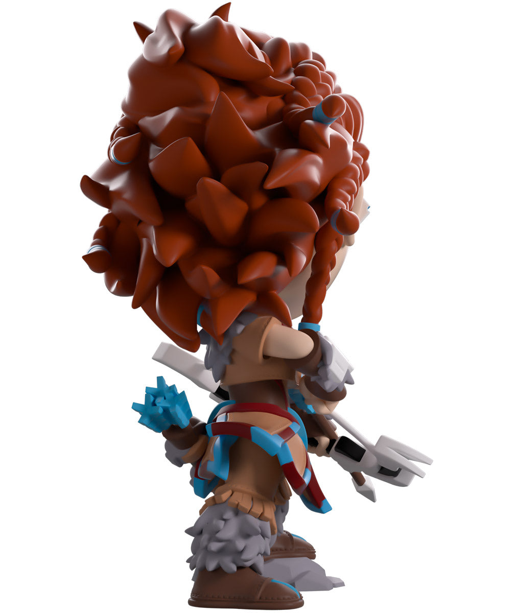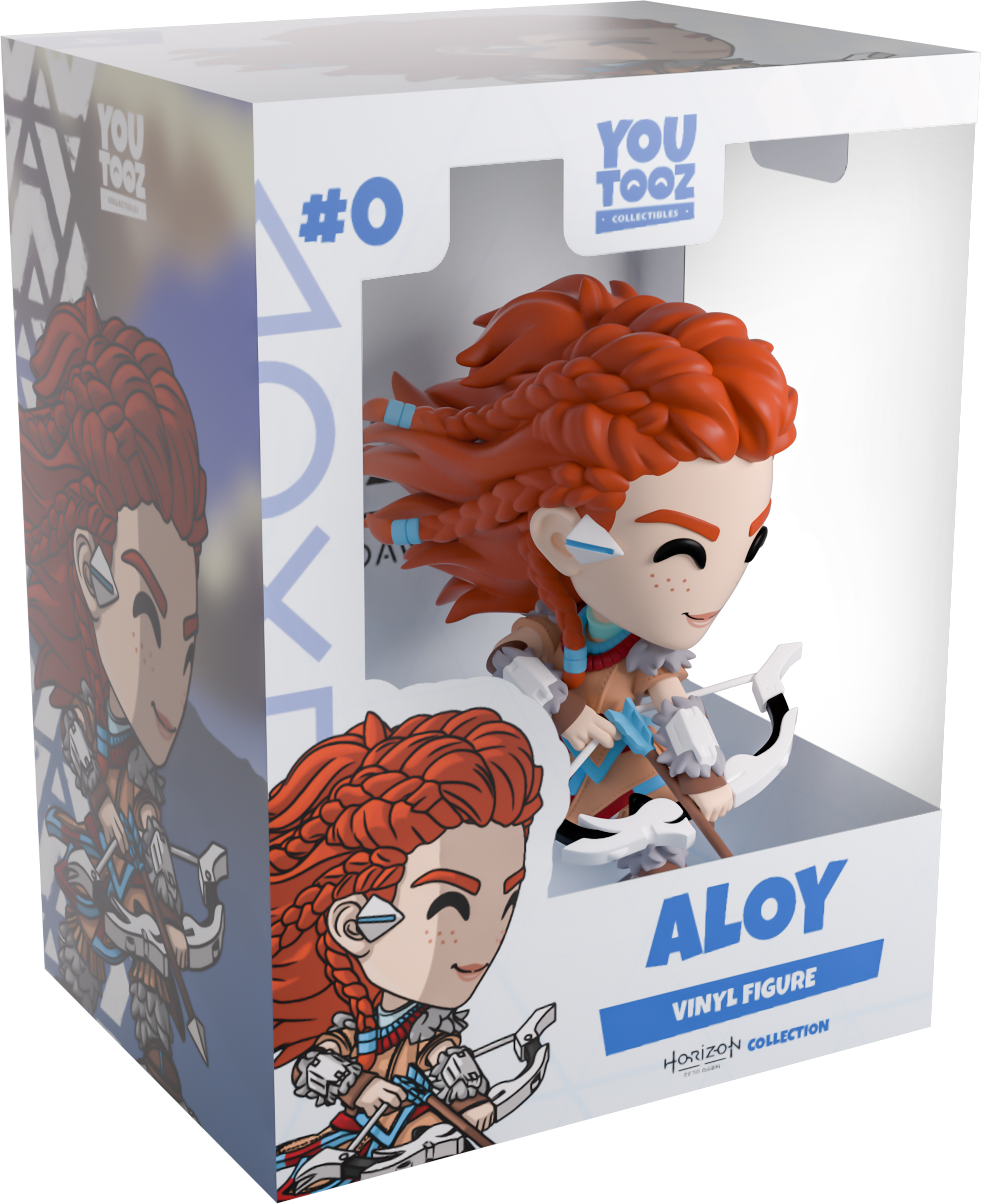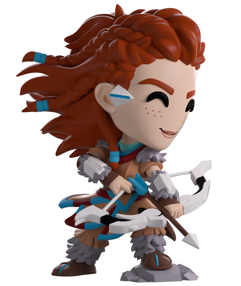 Aloy’s latest Datapoint discovery has led her straight to Youtooz in hopes of uncovering the secrets of the past! Leaning forward with her foot perched atop a grey rock to stand at 4.6 inches tall, a confident smile crosses her freckled face as reddish brown hair flows behind her with a series of braids along the top and sides. Pulling back the drawstring of her white bow to unleash an arrow with deadly precision, she wears a brown tunic with blue and red accents along the hem, along with grey feathers on her shoulders, forearms and legs. The exterior of her packaging features Aloy crouched atop a rocky outcrop as shadows of Tallnecks lumber through the grassy background, while the interior is covered in a pale blue triangular pattern. The protective sleeve then looks out onto rolling green plains as clouds dance through a blue sky and her figure can be seen through the large clear window at the packaging’s front. This collectible ships in a matte, embossed, protective outer sleeve and a custom-sized plastic protector for maximum protection during shipping.