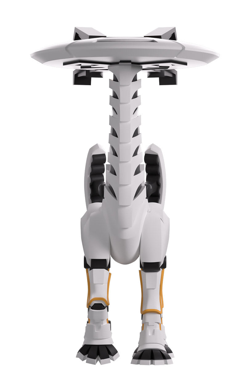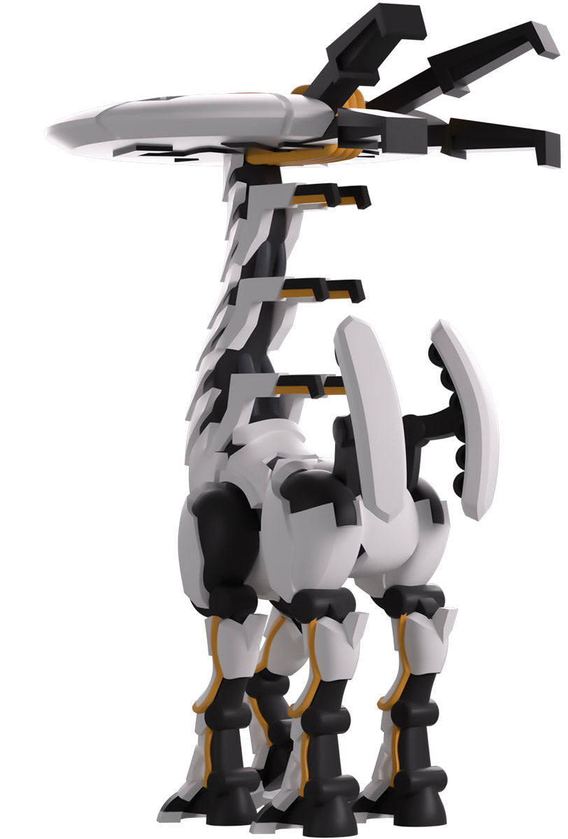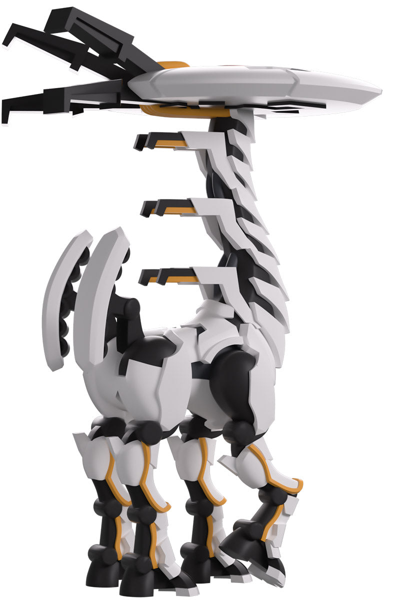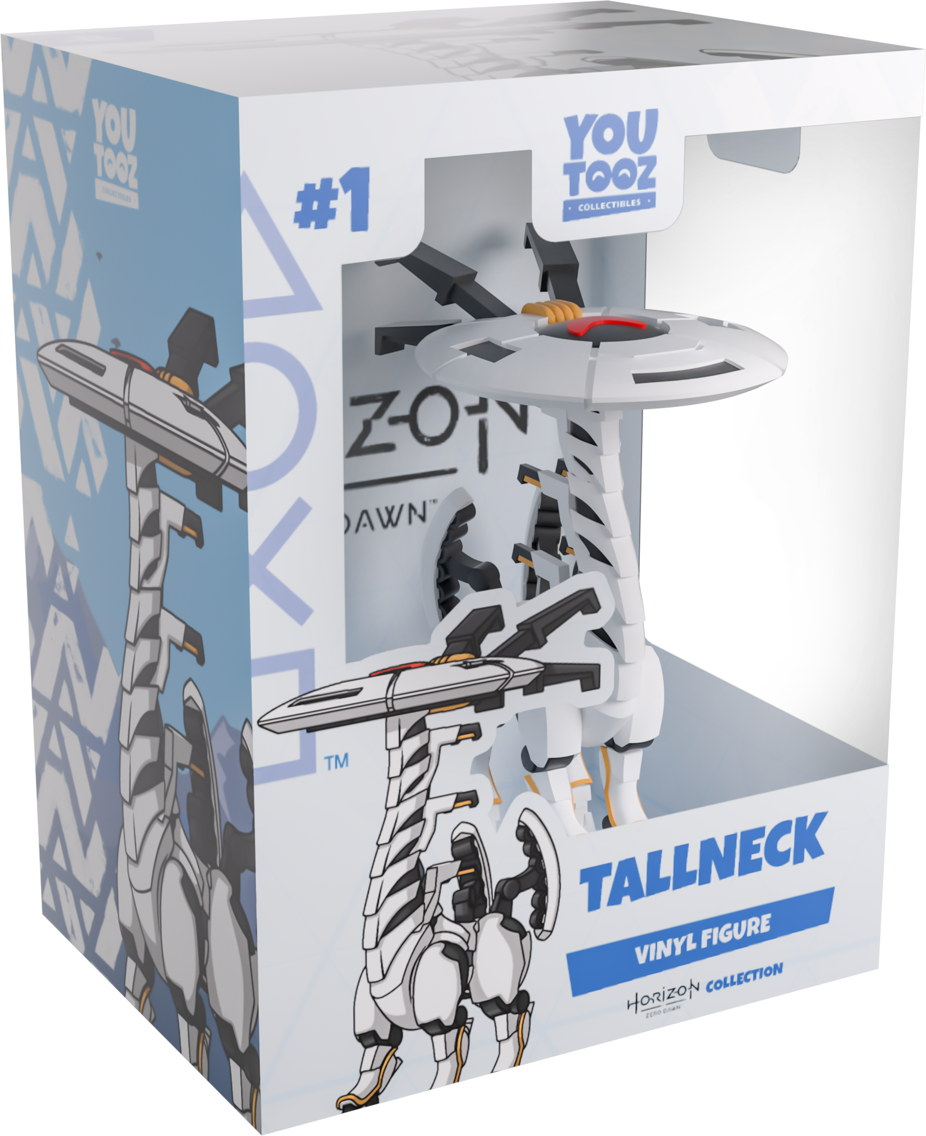 This Tallneck’s route goes straight through Youtooz, so we’re just going to get out of the way and let them do their thing! Standing at a lofty 5.2 inches tall with a circular disk head that has a red data node on the center and segmented plates around the outside, four long antennae stretch out from the back as black and yellow-tipped spines run along their long, segmented neck. With thick white armor covering their body and yellow highlights on their sturdy legs, a pair of tail-like structures raise up from their hips as they trudge forward with a raised leg. The exterior of their packaging sees them lumbering through tall trees, while the interior is covered in a pale blue triangular pattern. The protective sleeve then looks out onto rolling green plains as clouds dance through a blue sky and their figure can be seen through the large clear window at the packaging’s front. This collectible ships in a matte, embossed, protective outer sleeve and a custom-sized plastic protector for maximum protection during shipping.