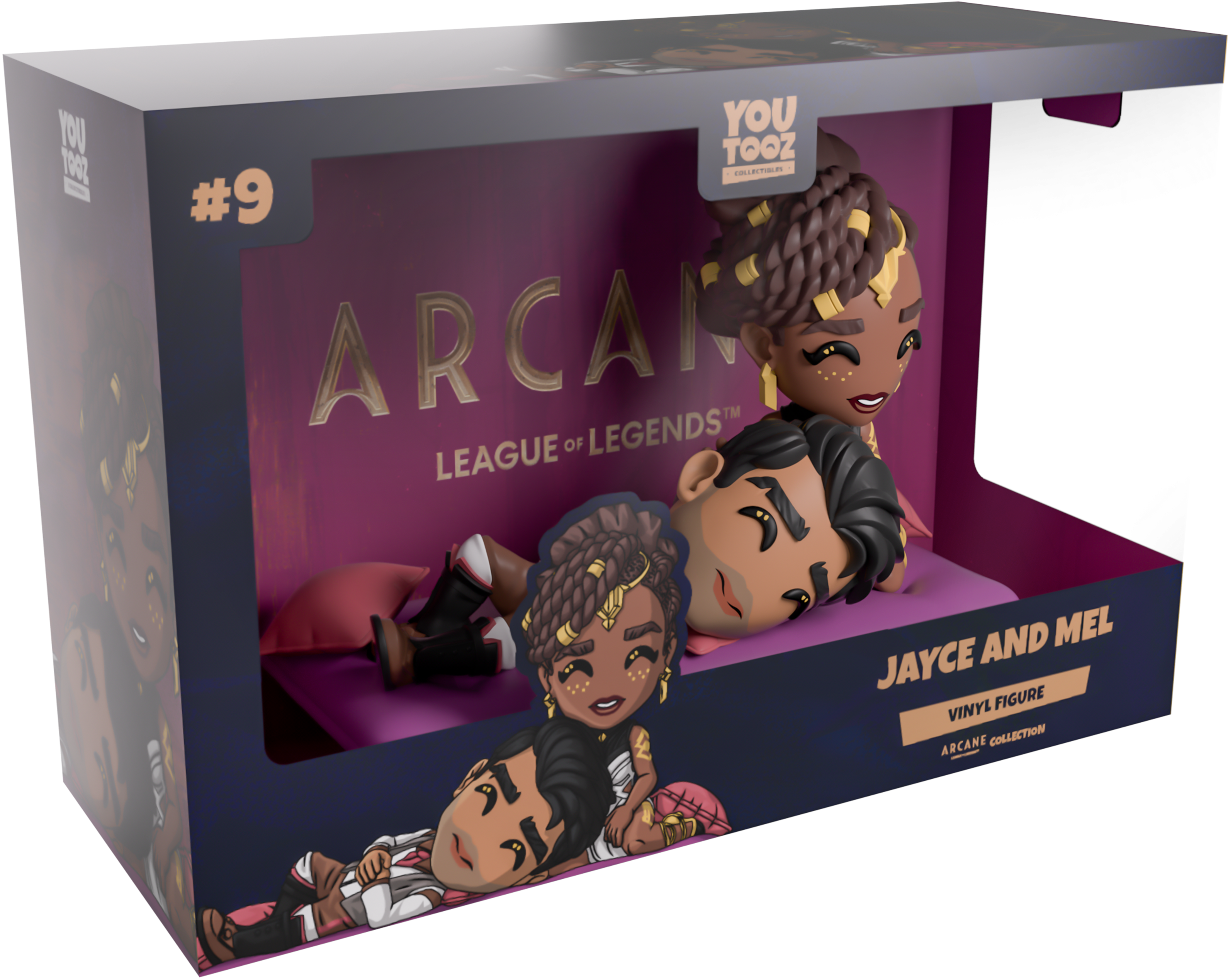 Jayce and Mel are taking a break from the stress of the Piltover Council for a quiet moment alone with their arrival at Youtooz! At 4.1 inches tall and resting atop a soft purple mat that’s covered in dusty pink pillows, Jayce lays on his back with his head on Mel’s knee and looks forward with a content smile as his hands are clasped together over his chest. With Mel’s hand resting on the back of his head as her braided brown hair is pulled into a large bun at the back, golden speckles mark her face as matching patterns run down her arms and legs, and she wears a white and black sleeveless dress. The exterior of their dark blue packaging is covered in gold streaks over a smudged purple background. These then work their way onto the purple to pink interior, while the protective sleeve is dark blue with a simple golden frame as their figures can be seen through the large clear window at the packaging’s front. This collectible ships in a matte, embossed, protective outer sleeve and a custom-sized plastic protector for maximum protection during shipping.