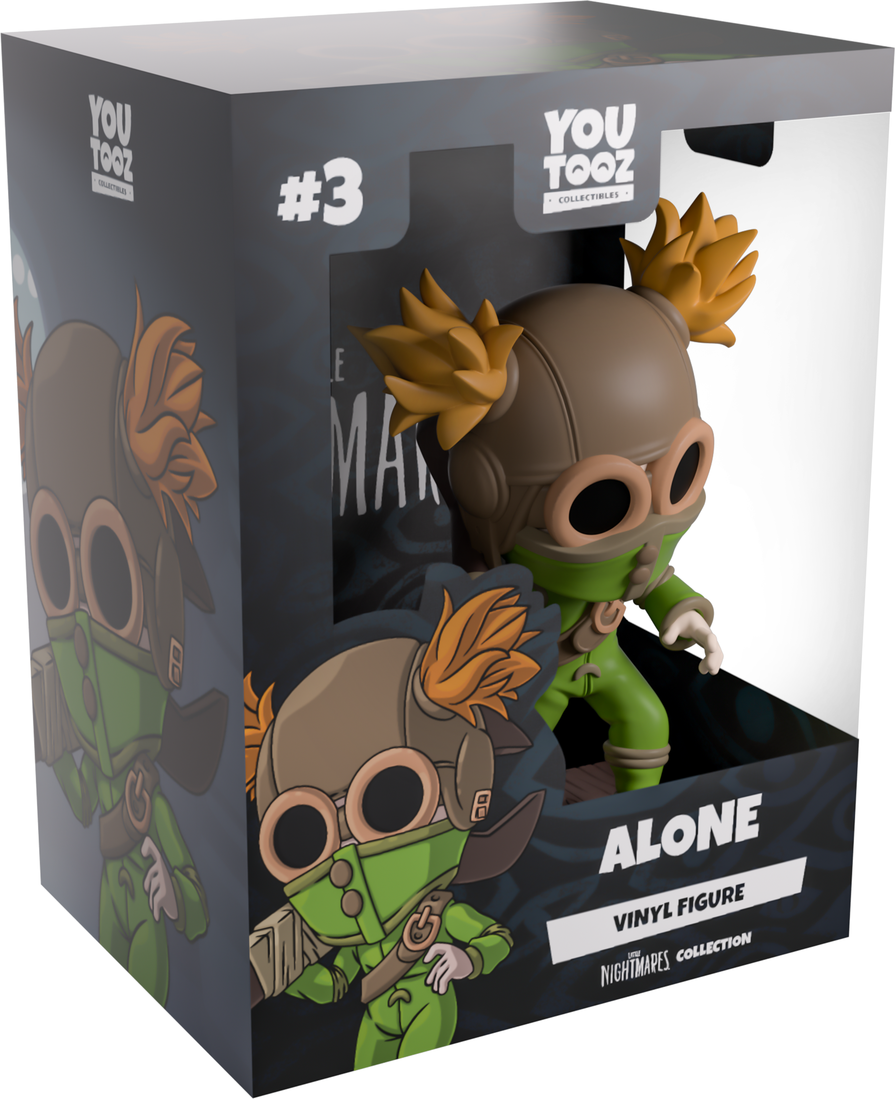 The next stop on Alone's escape from the Spiral is Youtooz! Standing bravely at 5 inches tall as she takes a cautious step forward with bare feet to minimize the noise, she wears an all-green jumpsuit with a giant wrench resting over her right shoulder. With an aviator-style helmet covering her head as a pair of orange pigtails poke through either side, the collar of her jumpsuit reaches up to cover her mouth as large goggles hide her eyes. The exterior of her packaging has been illustrated to show the silhouette of Alone inside a dingy moonlit storeroom. The interior is then covered in a pattern of obscure eyes which work their way onto the protective sleeve that is flooded with blue light from a pale city as her figure can be seen through the large clear window at its front. This collectible ships in a matte, embossed, protective outer sleeve and a custom-sized plastic protector for maximum protection during shipping.