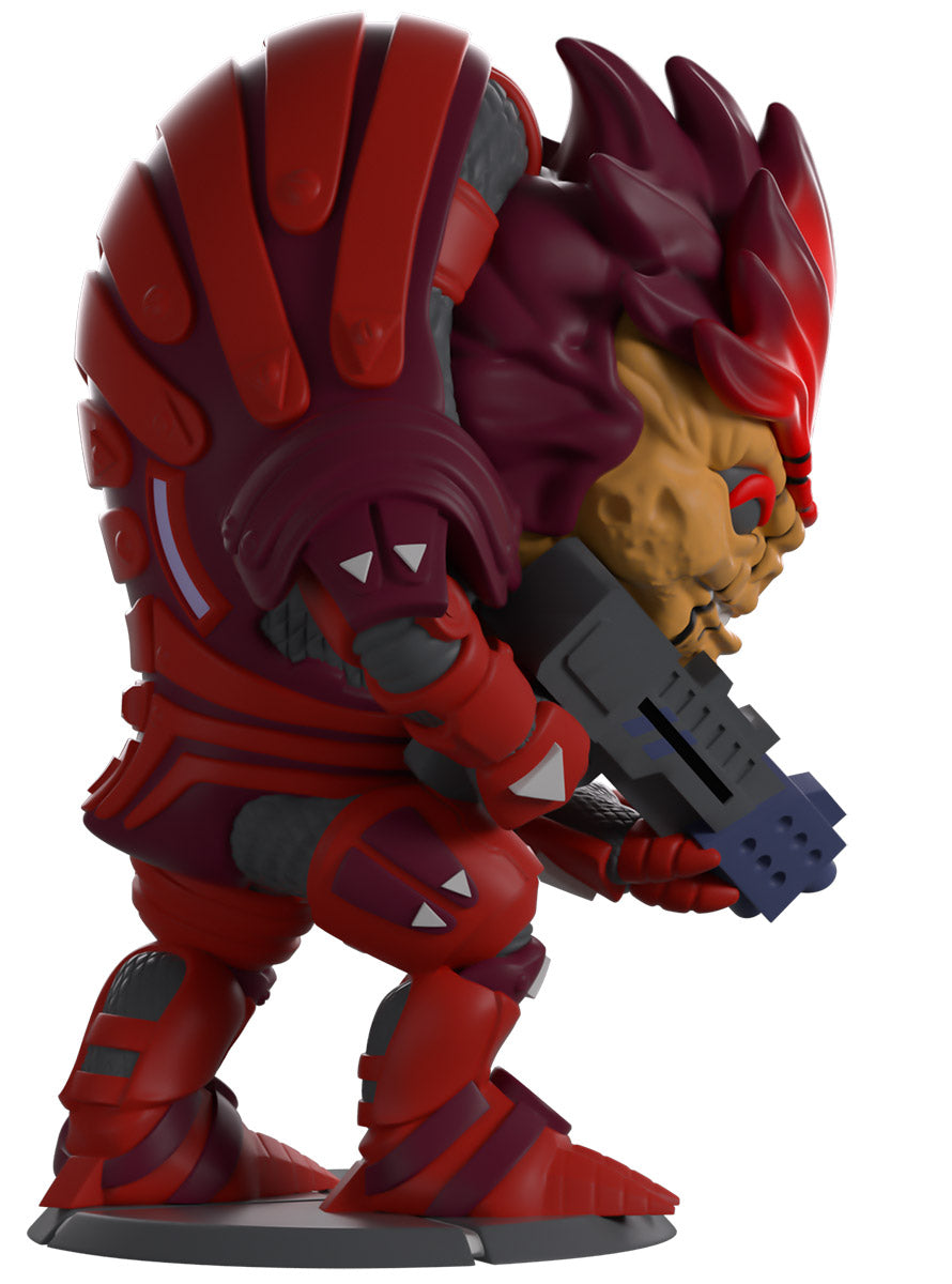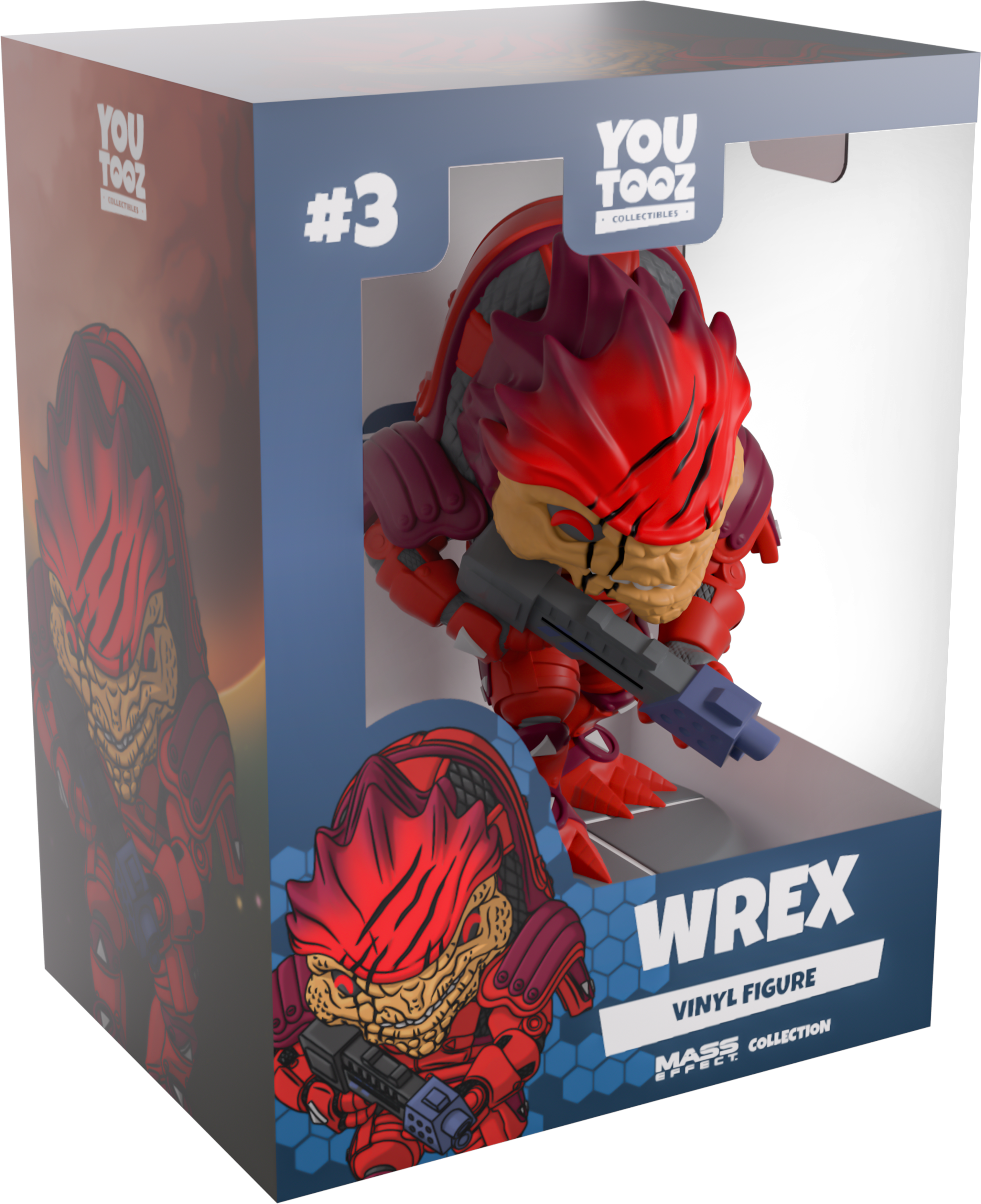 Wrex has tracked his new bounty into Youtooz! Hunching forward at 4.8 inches tall and gripping a blue-tipped shotgun in both hands, deep red eyes peer out from his scaly brown face above a slightly open mouth as thick scars gouge through a red and purple head. Dressed in matching armor that covers his entire body in thick plates and straps that run over his shoulders and humped back, grey triangles mark his hands, knees, and ankles as long claws extend from his feet. The exterior of his packaging sees a green pillar blasting energy into the sky. While the interior is a stark white with deep blue running around the top and bottom, this then continues on the protective sleeve, where his figure can be seen through the large, clear window at the packaging’s front. This collectible ships in a matte, embossed, protective outer sleeve and a custom-sized plastic protector for maximum protection during shipping.