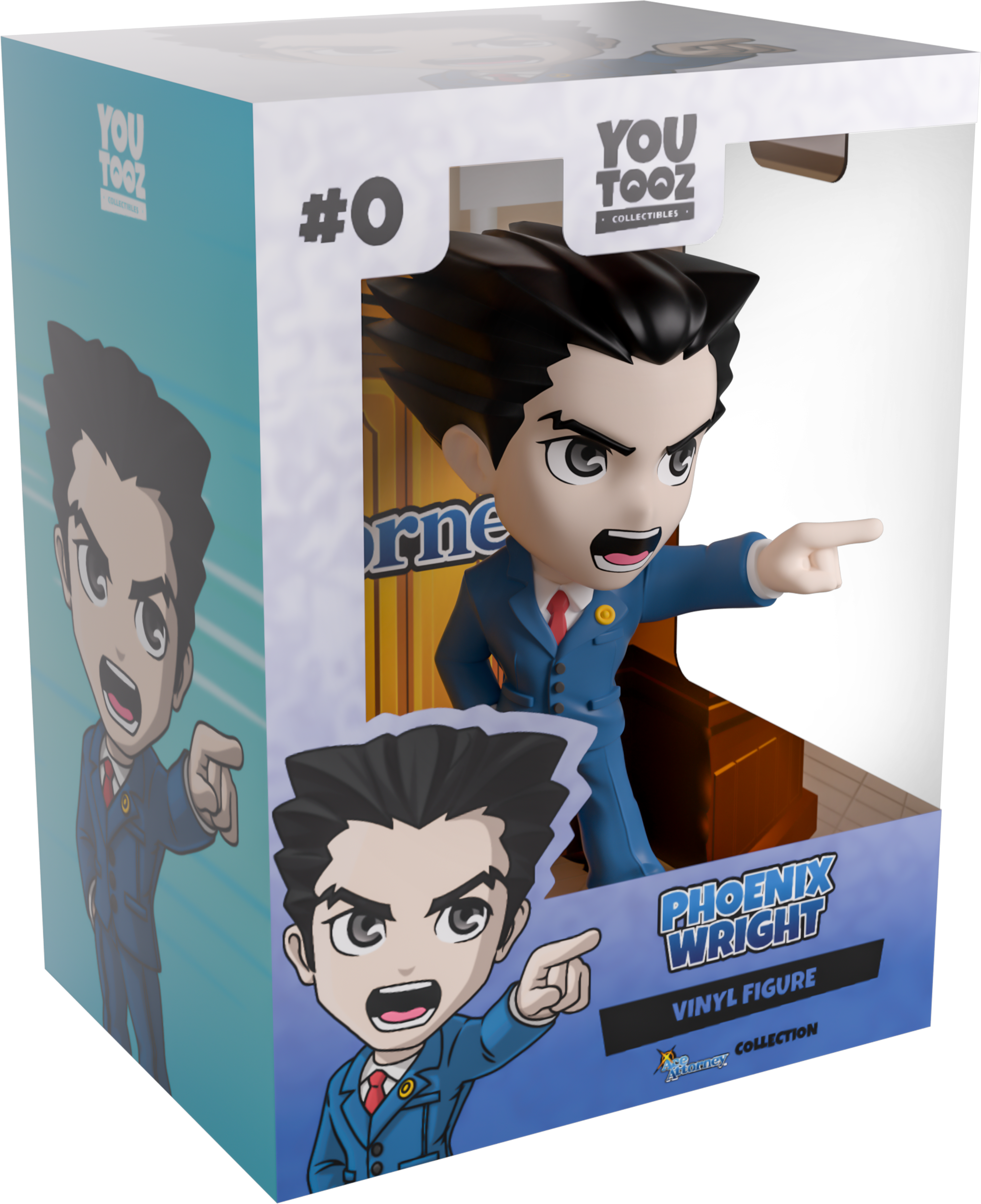Phoenix Wright has arrived at Youtooz to defend us in the case of not debuting him yet! Standing at 4.5 inches tall as he thrusts his hand forward and points confidently while letting out a firm ‘Objection!’ from his open mouth, angled eyebrows sit over confident eyes as his black hair is slicked back ironically in thick spikes. Wearing a tailored two-piece suit with yellow buttons and an attorney badge on the lapel over his white collared shirt and red tie, his right-hand rests casually in his pocket as his courtroom attire is complete with slick black shoes. The exterior of his packaging sees Phoenix standing behind a desk as he fervently addresses the judge. While the interior looks onto an empty courtroom, this then extends onto the protective sleeve where his figure can be seen through the large clear window at the packaging’s front. This collectible ships in a matte, embossed, protective outer sleeve and a custom-sized plastic protector for maximum protection during shipping.