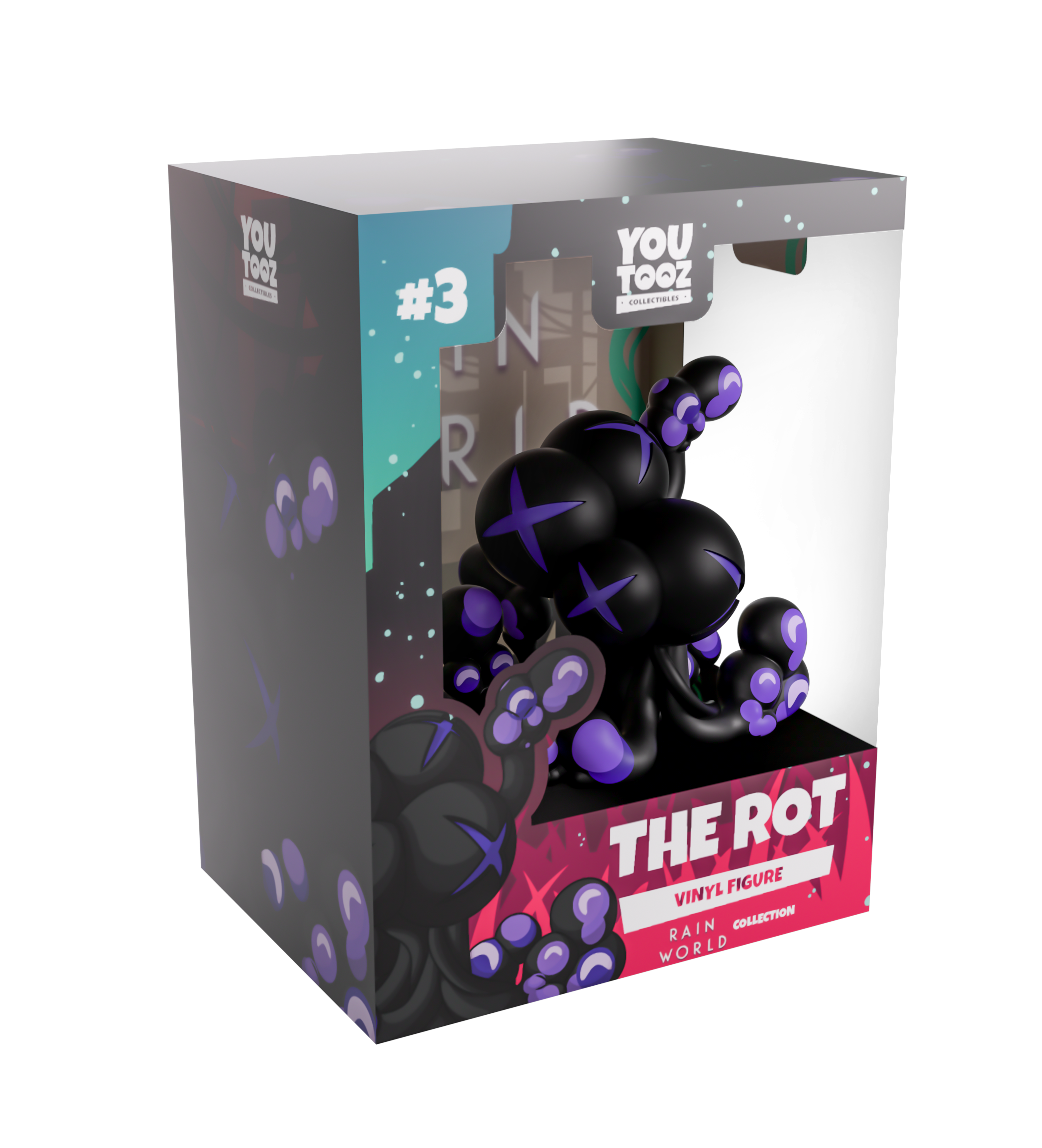 The Rot has grown and made its way into Youtooz for a full-blown infestation! Bubbling up at 3.1 inches tall with round cyst-like bulges and tendrils, blue crosses spread across its black center as blue and purple strands curl out and rise upwards in humping toxic clumps. The exterior of their packaging sees a bubbling mass rising up from a ruined building, while the interior looks onto the silhouette of a dilapidating skyline as green vines weave their way to surround them. The protective sleeve then casts the ruined world in a green haze as their figure can be seen through the large clear window at the packaging’s front. This collectible ships in a matte, embossed, protective outer sleeve and a custom-sized plastic protector for maximum protection during shipping.