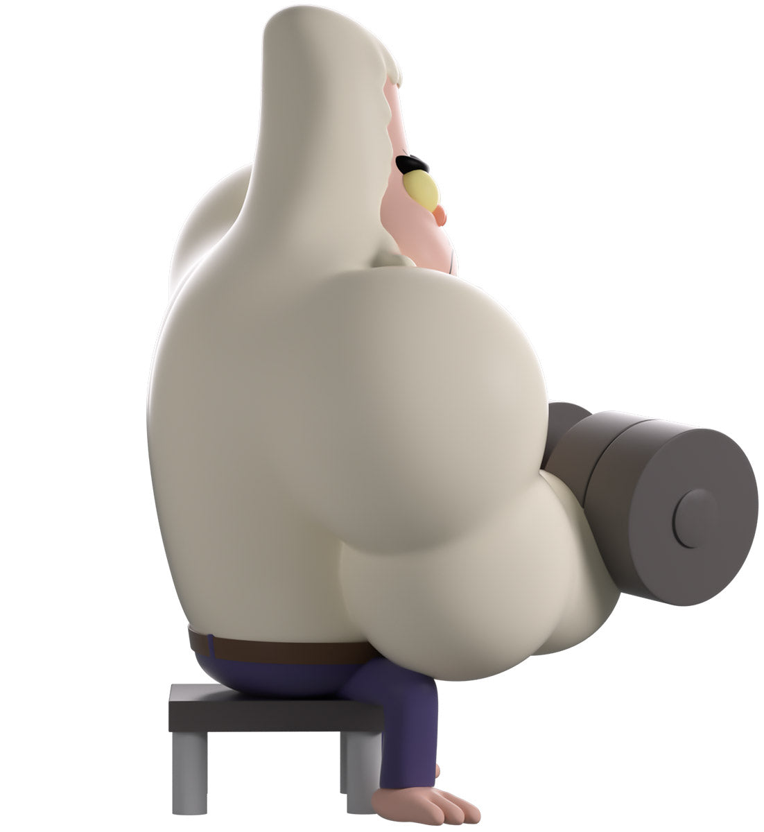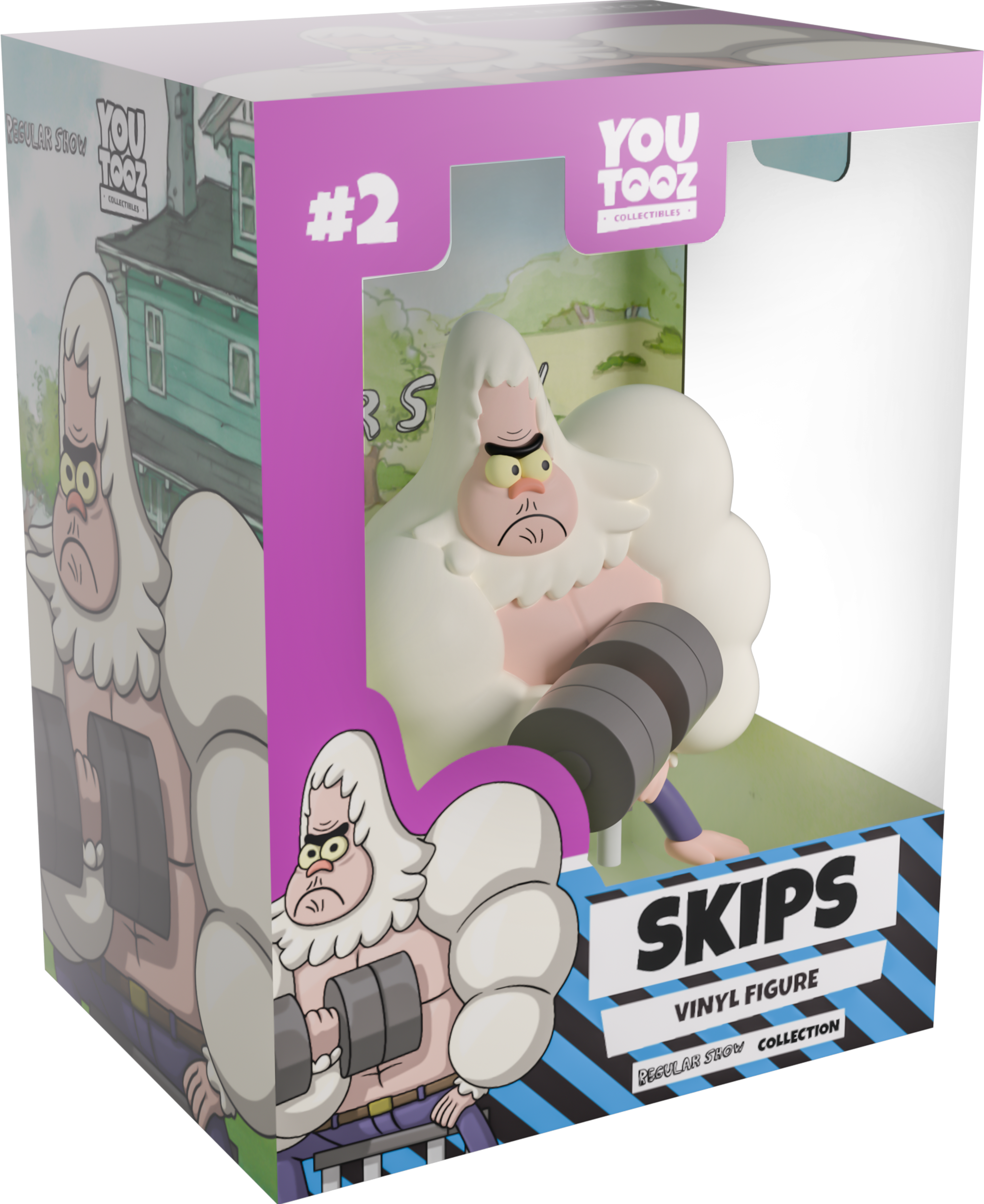 Skips is so old that he has seen pretty much everything, but this is a first! Making his Youtooz debut, Skips is here to give you some muscle motivation! Sitting at 4.1 inches tall and leaning to the side as he performs a bicep curl in perfect form with a look of intense concentration (or frustration) crossing his face, white fur juts out from his chin and covers his huge muscular arms leaving his chiseled chest bare as he wears nothing but purple jeans. The exterior of his packaging has been illustrated with Skips pumping iron, while the interior is designed with an aerial shot at the iconic park they work at. The protective sleeve then sees a jagged purple and striped blue pattern over a cosmic background as his figure can see seen through the large clear window at its front. This collectible ships in a matte, embossed, protective outer sleeve and a custom-sized plastic protector for maximum protection during shipping.