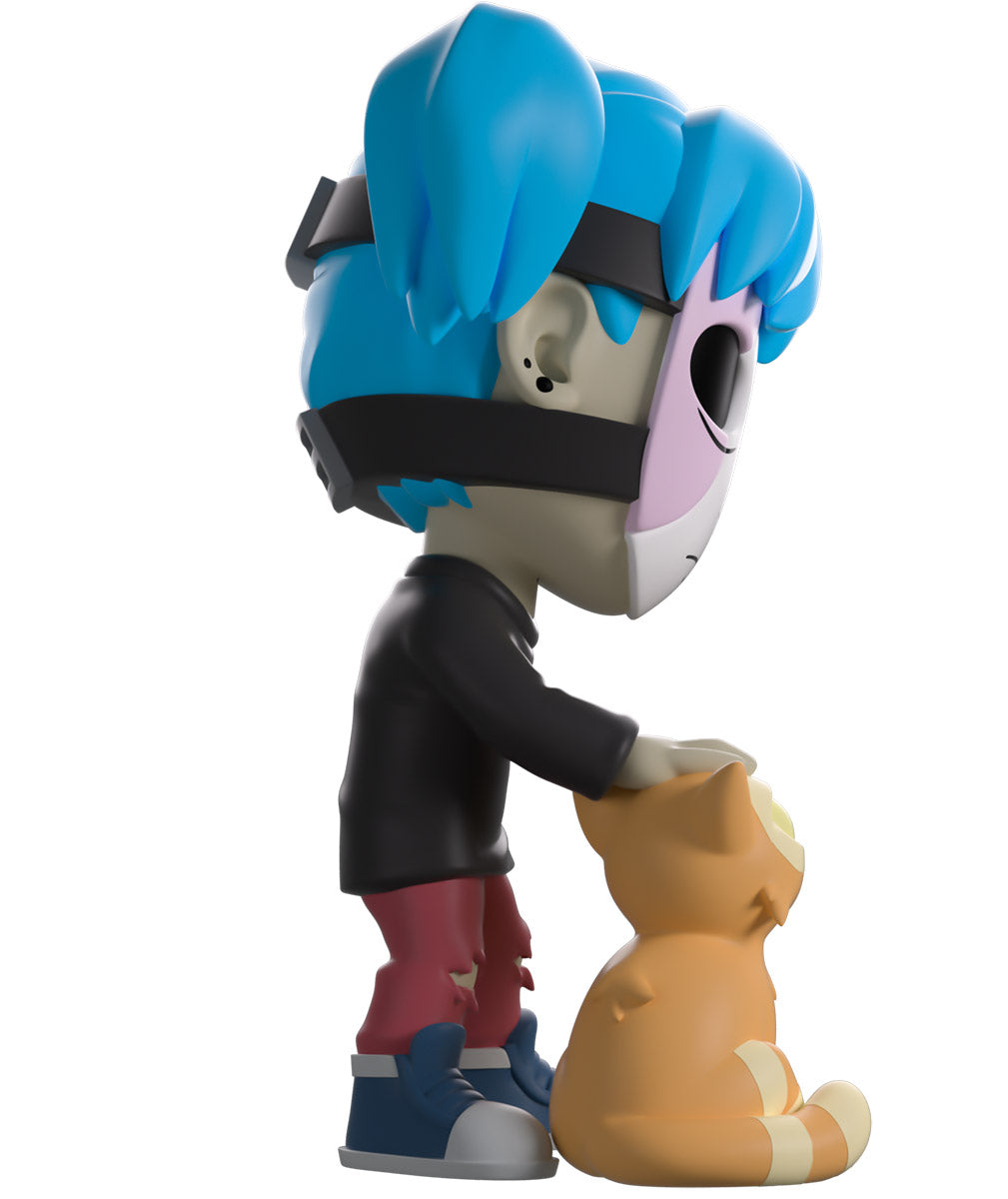 Gizmo snuck into Youtooz and brought Sal along for their brand new figure! Standing at 4.1 inches tall and reaching down to gently pat the top of Gizmo’s orange head, who looks upwards happily with a pink tongue hanging from his mouth and a thick tail curling around his striped body. A white and pink mask with sunken black eyeholes and a thin frown is strapped around Sal’s head as a pair of blue ponytails stick out from either side and he wears a long-sleeve black shirt, red jeans with torn knees and blue sneakers. The exterior of their packaging looks into an empty room with a tattered scratching post in the middle, while dark paw prints cross the pale green interior. The protective sleeve is then covered in a sinister green ooze that drips down the walls of a run-down hallway, as their figures can be seen through the large, clear window at the packaging’s front. This collectible ships in a matte, embossed, protective outer sleeve and a custom-sized plastic protector for maximum protection during shipping.
