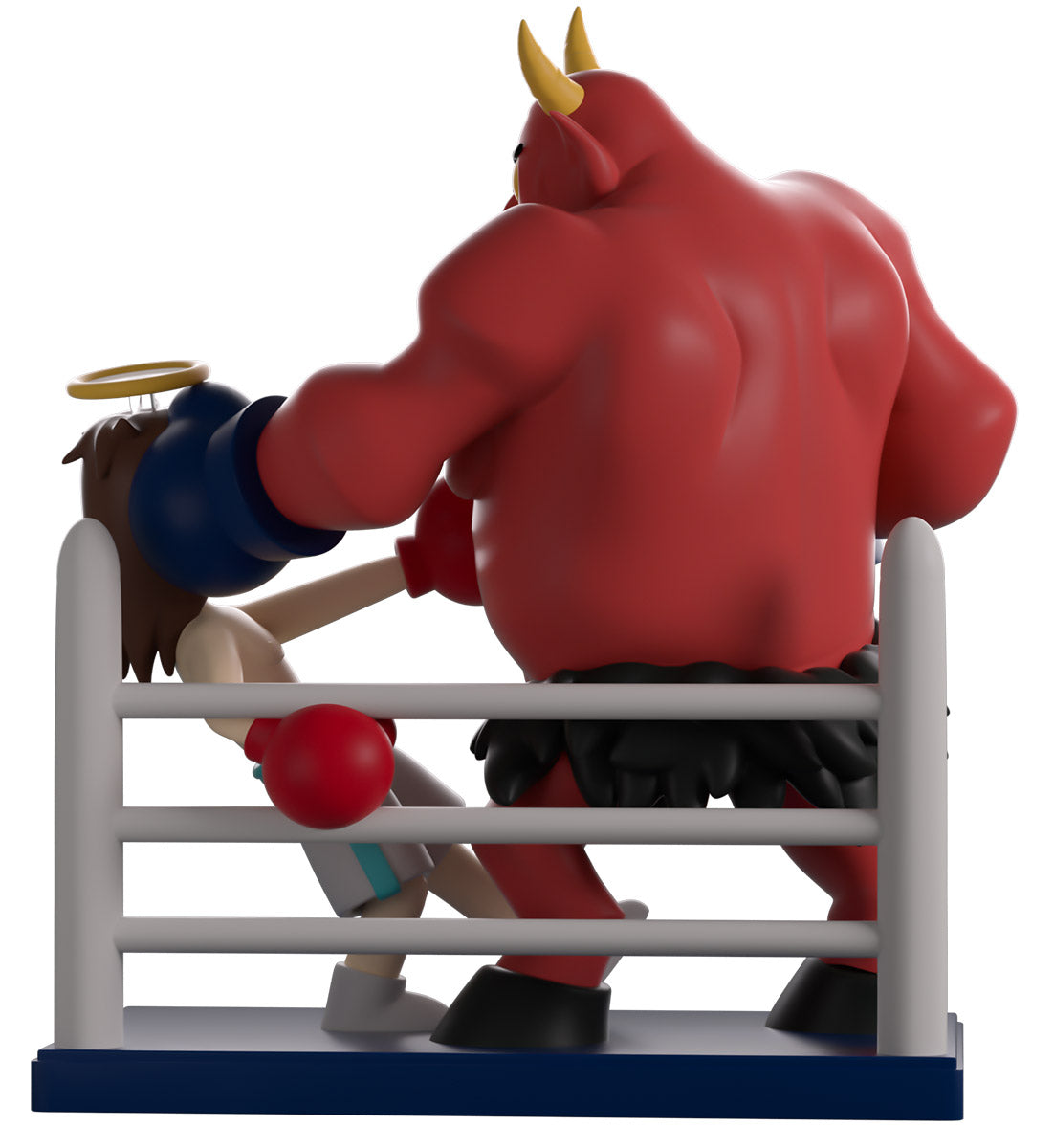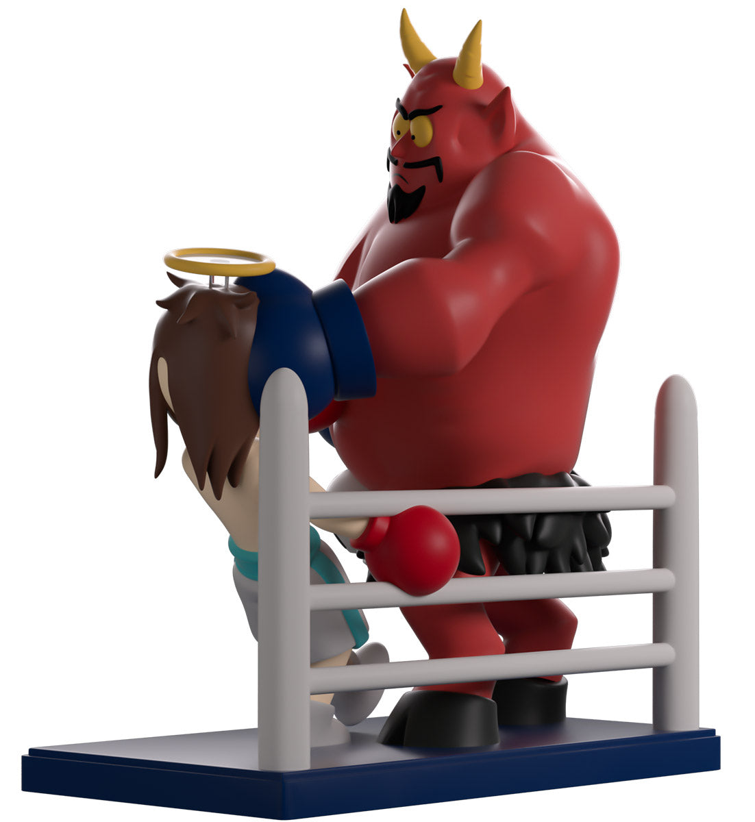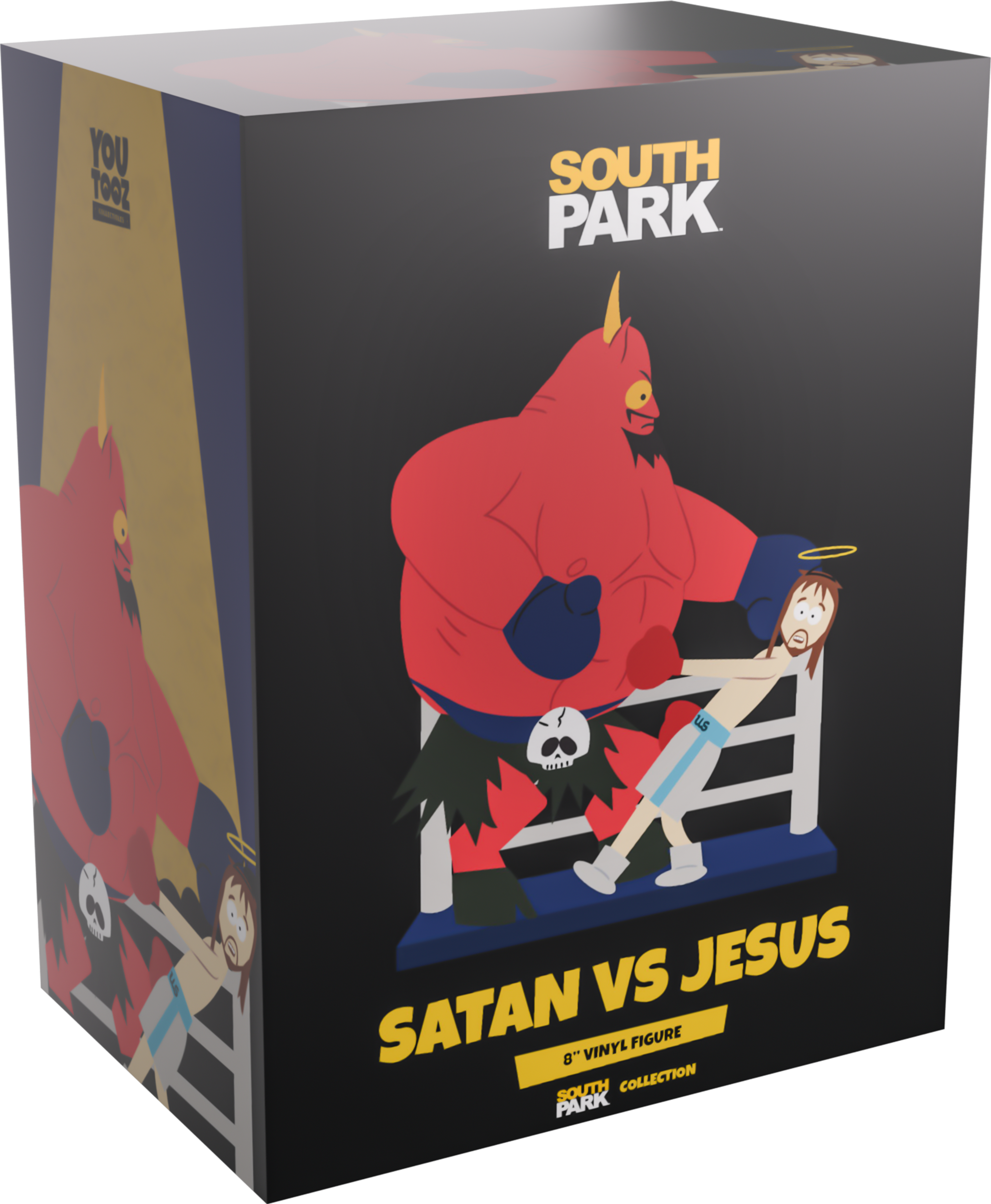 Grab your tickets and get a good seat, because the ultimate battle of good and evil has arrived at Youtooz! At 7.7 inches tall, this figure portrays Satan and Jesus in the midst of a fiery boxing match that sees Satan landing a huge left hook straight into Jesus’ face to send him flying back. With a barrel chest and deep yellow eyes glaring down from above, a black goatee, Satan wears blue gloves and a skull belt holding up black fur shorts, while the shirtless Jesus wears white shorts with a blue stripe down the side, along with red gloves, as a halo floats above his long brown hair. This collectible ships in a lovingly designed packaging that sees the pair illuminated by a yellow spotlight, while the interior is filled with a grey and black pattern of the ‘South Park’ logo.