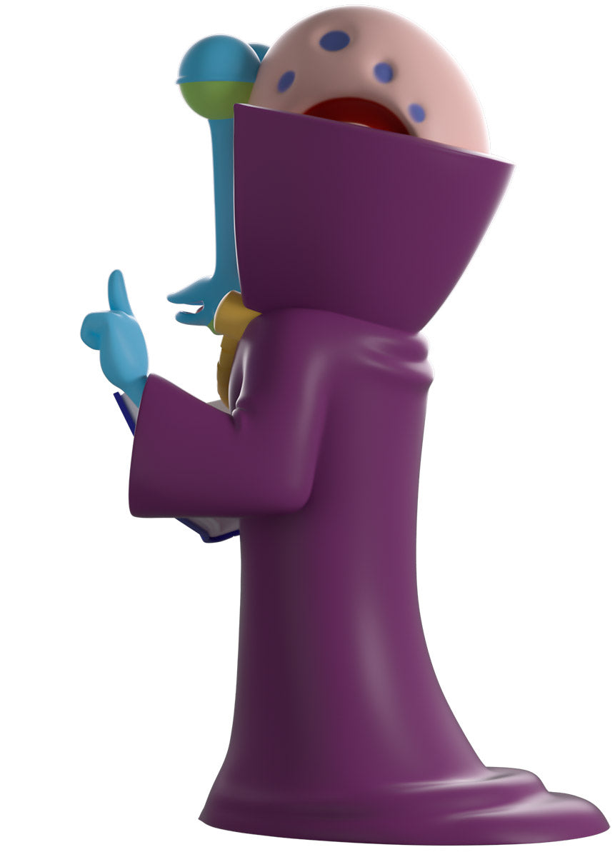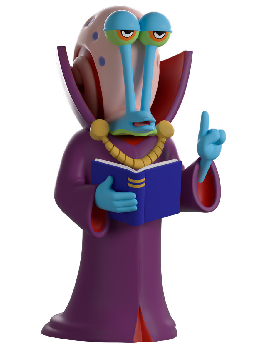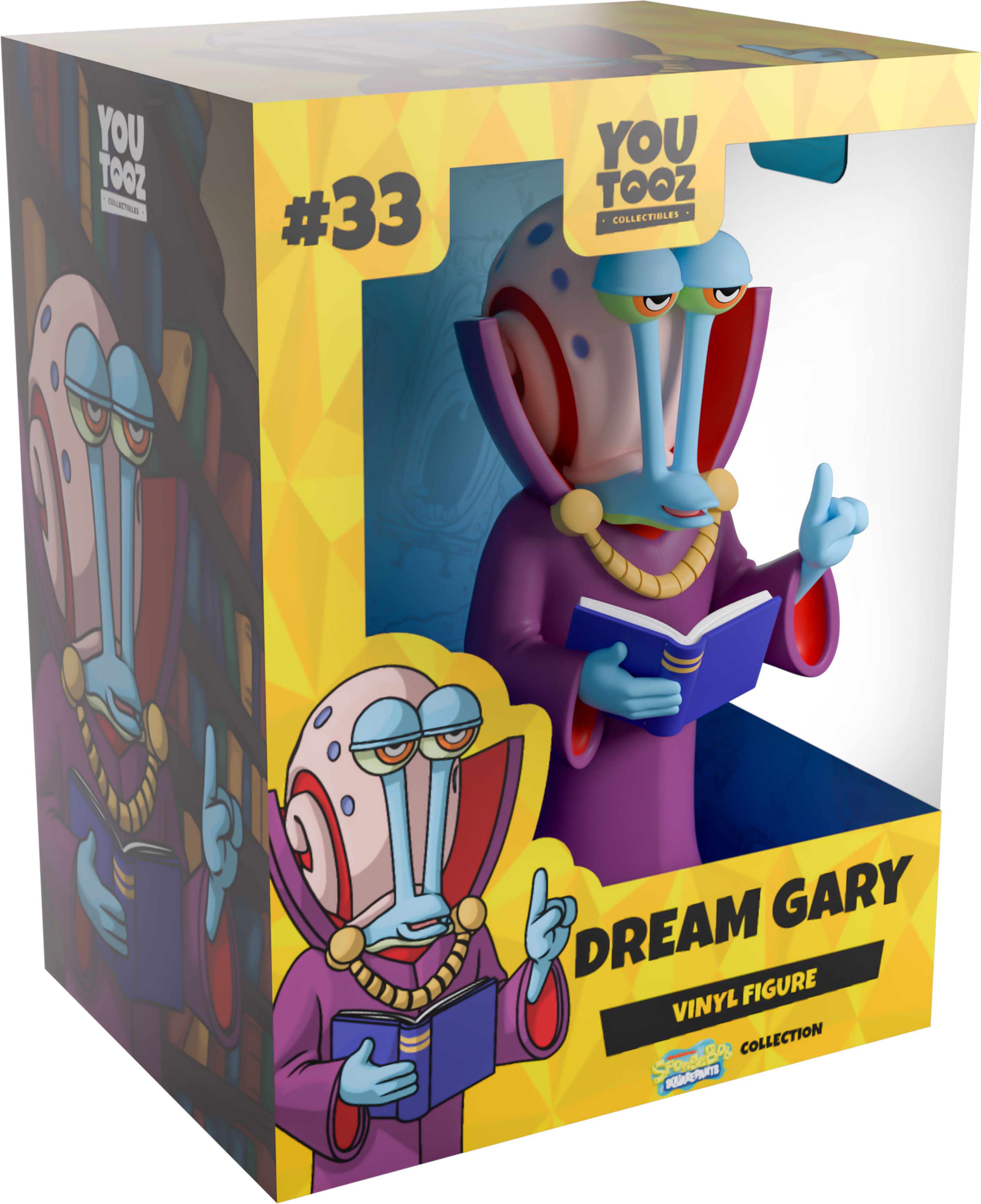 We have accidentally stumbled out of our dream and into the dream world of Gary! So naturally we had to bring Gary in his wizardly dream form to life as a Youtooz figure! Standing at 4.5 inches tall and dressed in long purple robes while holding an open book in his right hand, his left hand is raised with the index finger pointing upwards as his snail body is framed by the upturned collar of his robes which shows off its red lining. The exterior of his packaging has been designed to showcase Gary in his dream form standing over SpongeBob in a dream library, while the interior is an ocean blue gradient collaged with illustrations of SpongeBob. The protective sleeve is then printed with a bright yellow triangular pattern as his figure can be seen through the large clear window at its front. This collectible ships in a matte, embossed, protective outer sleeve and a custom sized plastic protector for maximum protection during shipping.