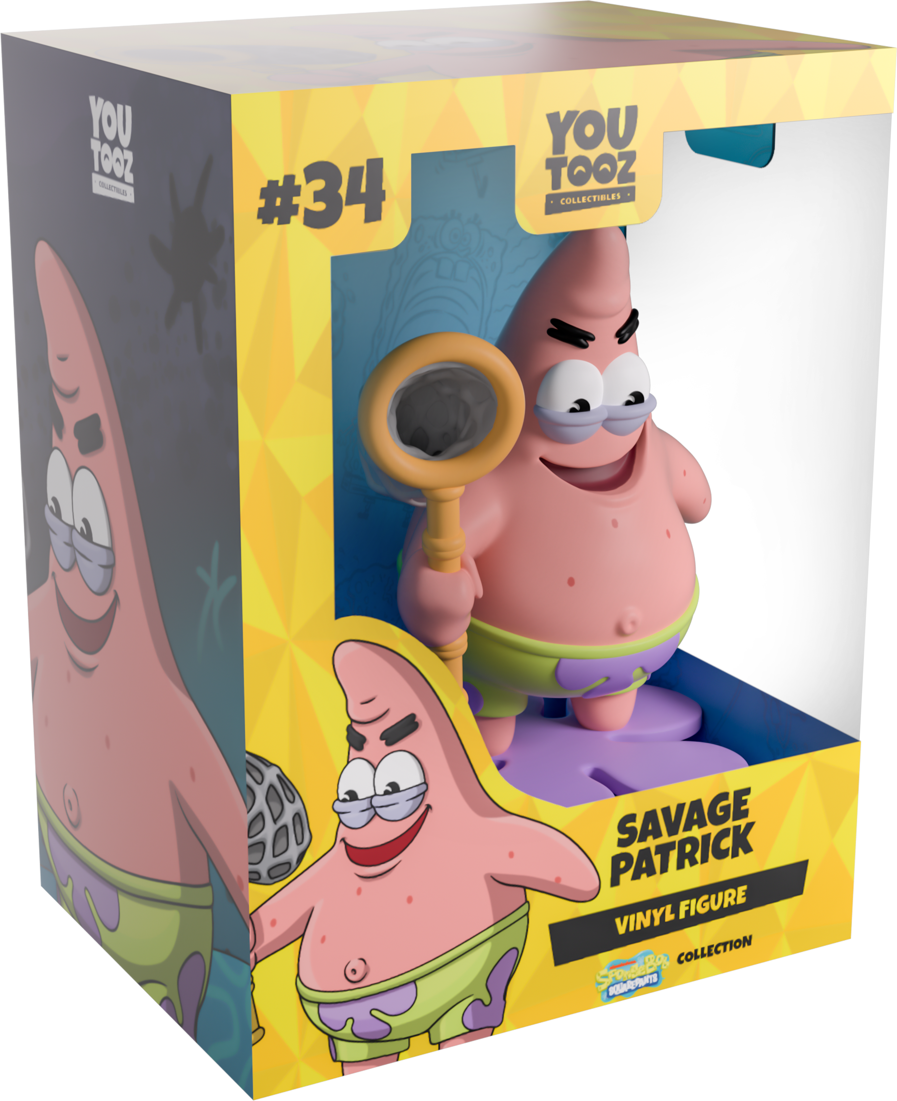 Making his return to Youtooz, Patrick Star's and he is not fooling around! This new figure stands savagely at 4.4 inches tall wearing his iconic floral green shorts as he leans forward with a menacing smile across his face and brandishes a jellyfish hunting net in his right hand. The exterior of his packaging shows Patrick stuck to the top of a rock arch as SpongeBob looks up fearfully, while the interior is an ocean blue gradient collaged with illustrations of SpongeBob. The protective sleeve is then printed with a bright yellow triangular pattern as his figure can be seen through the large clear window at its front. This collectible ships in a matte, embossed, protective outer sleeve and a custom sized plastic protector for maximum protection during shipping.