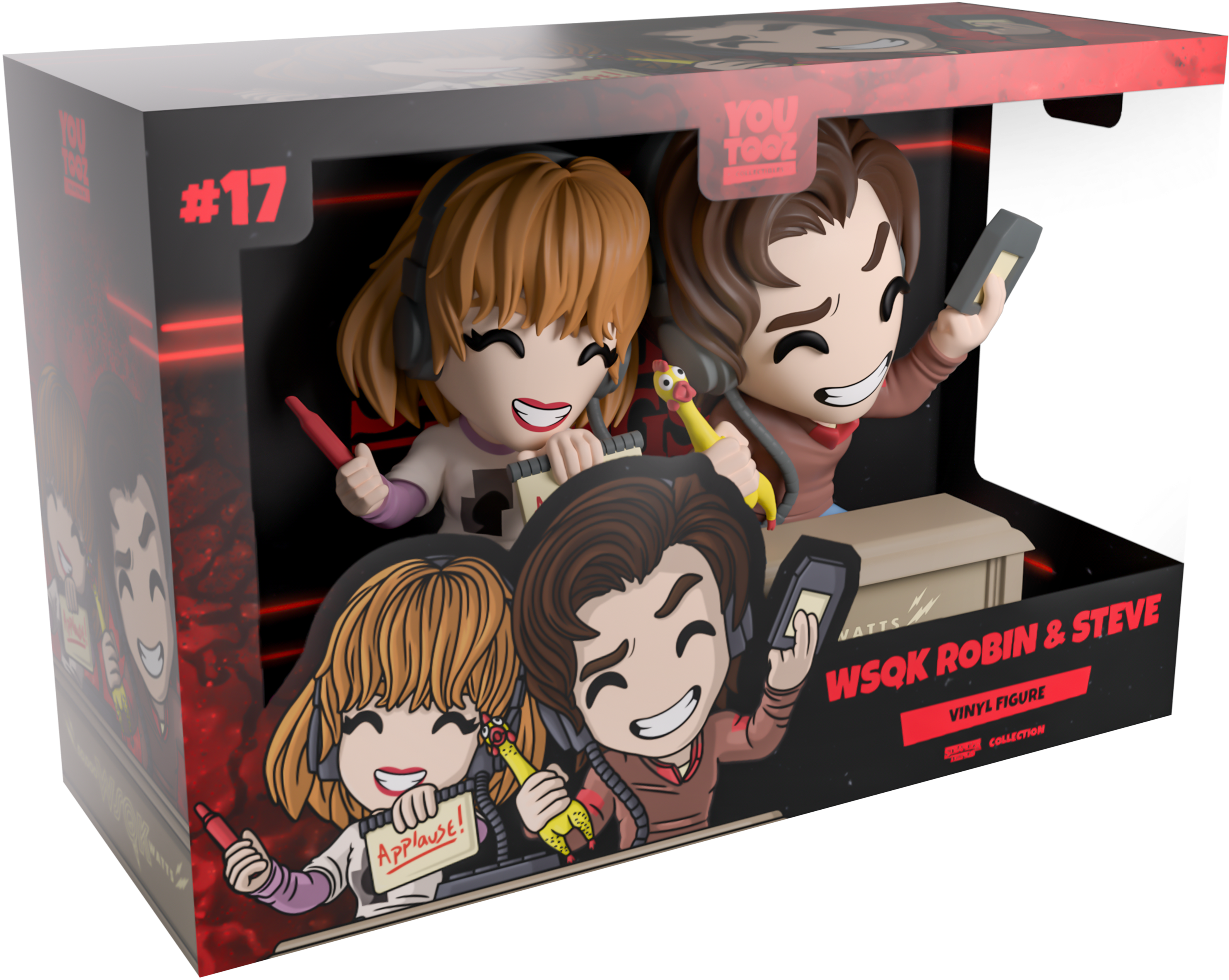 Tune in and turn it up! Robin and Steve have returned to Youtooz for a new figure! Sitting at 5.2 inches tall behind a beige table as huge smiles cross their faces and the cords of their grey headsets lead down to a soundboard, Robin wears a pink t-shirt over a purple long sleeve and holds a sign she’s scrawled ‘Applause!’ on with the red marker in her right hand. While Steve wears a brown long-sleeve shirt with red patches on the sleeves and collar, as he holds a screaming chicken toy in one hand and a tape in the other. The exterior of their packaging sees red vectors of the pair against a black background with faint tendrils working their way across it, while neon red lines blast horizontally through the interior. These then work their way onto the protective sleeve, where their figures can be seen through the large clear window at the packaging’s front. This collectible ships in a matte, embossed, protective outer sleeve and a custom-sized plastic protector for maximum protection during shipping.