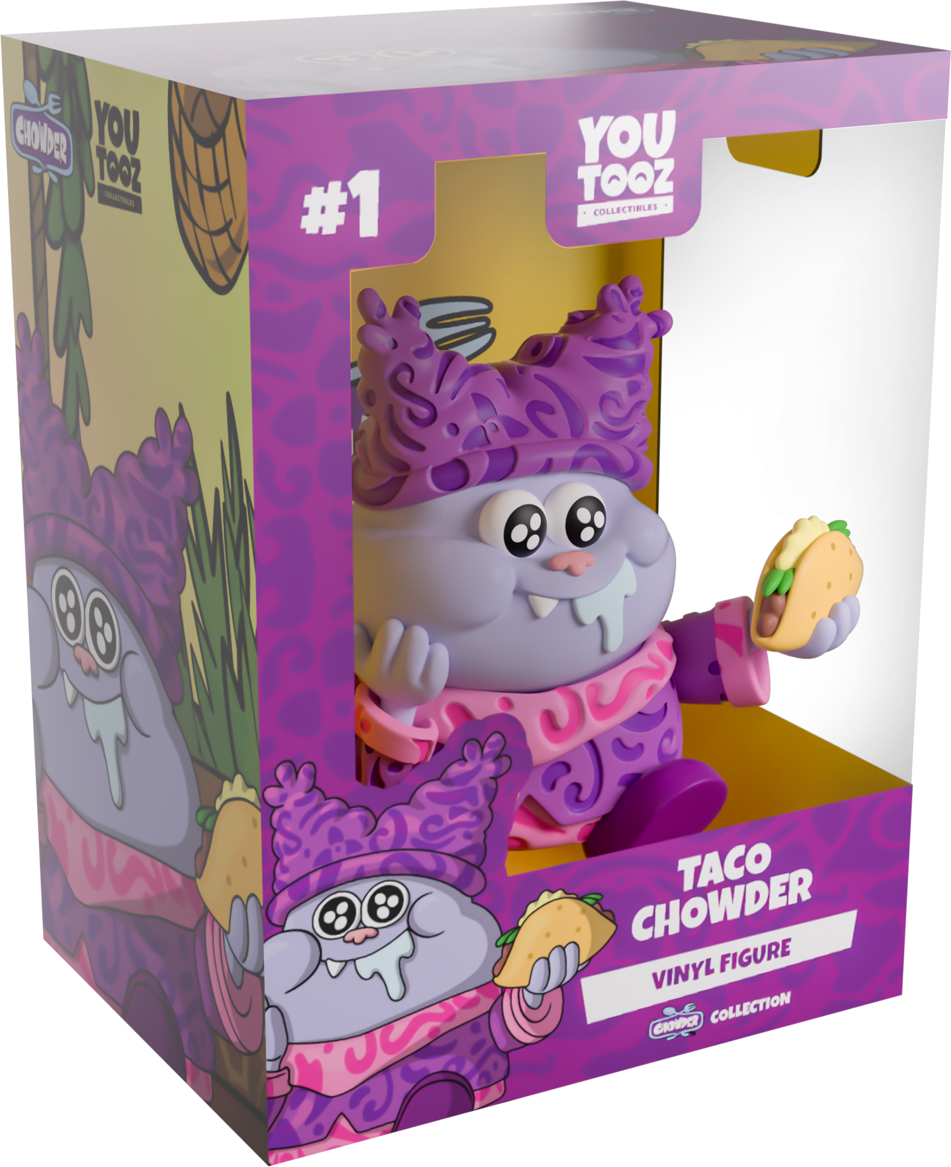 Can you smell the fresh fully loaded tacos that are steaming with deliciousness?! Well Chowder can, and he's already got a one hot and ready in his hands! Making his delicious return to Youtooz for a new 3.9 inch figure of awesomeness, Chowder stands overjoyed and drooling as he holds a fresh taco in his left hand and is dressed in his iconic purple and pink outfit while his eyes glow (not really) with excitement. The exterior of their packaging is illustrated to show a pair of tacos sitting on the ledge of a bar in Marzipan city, while the interior of the box is a warm yellow tone. The protective sleeve is then a vibrant close up of Chef Daal's kitchen as their figure can be seen through the large clear window at its front. This collectible ships in a matte, embossed, protective outer sleeve and a custom-sized plastic protector for maximum protection during shipping.